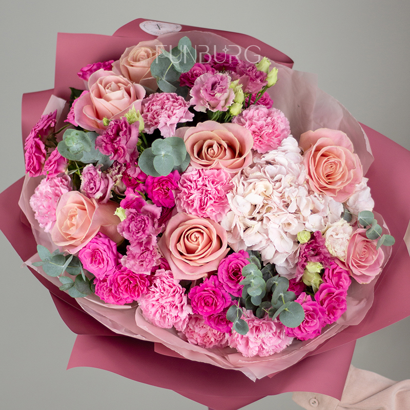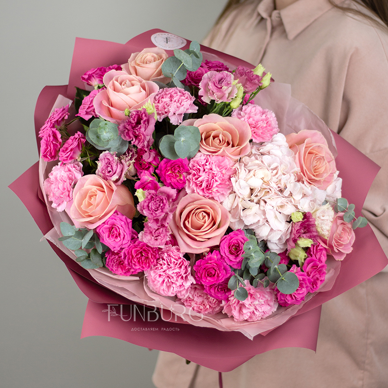 Большой пышный букет из свежих сезонных цветов в оттенках розового – удобный и красивый способ порадовать самых близких!