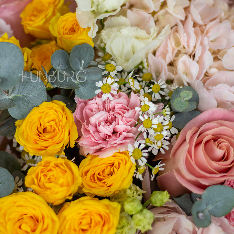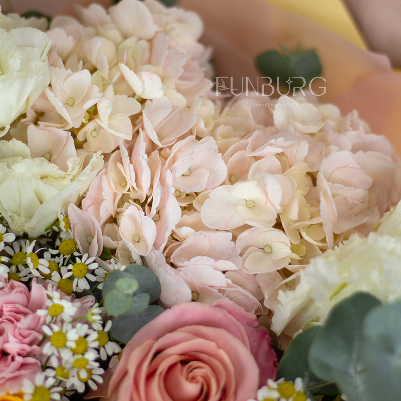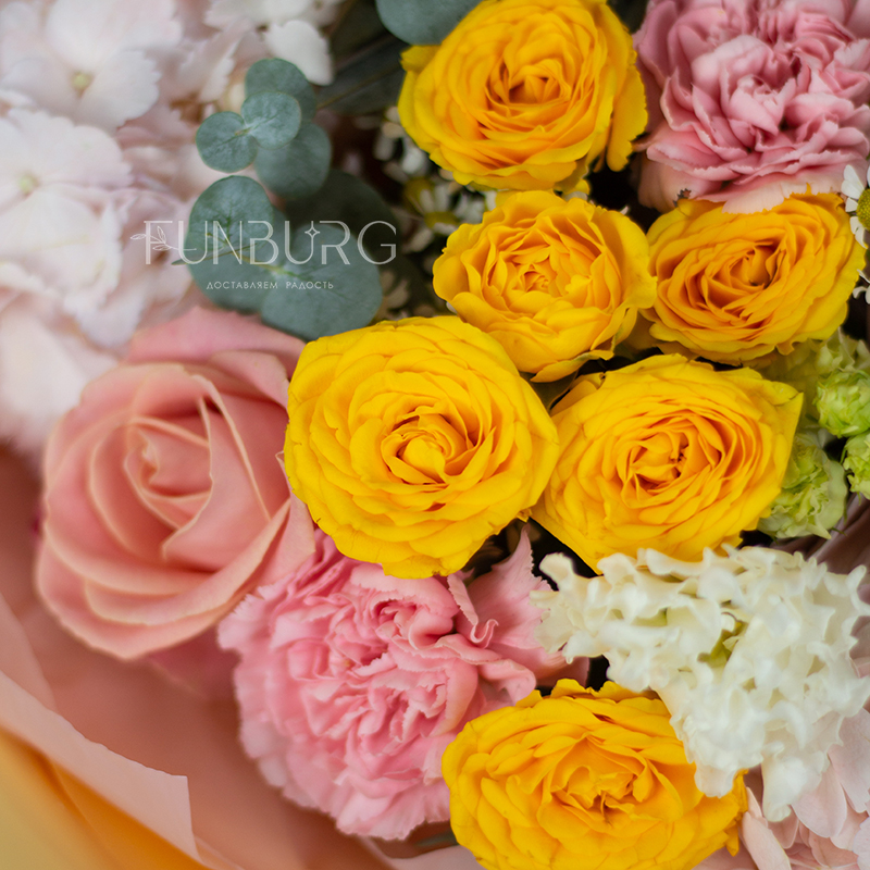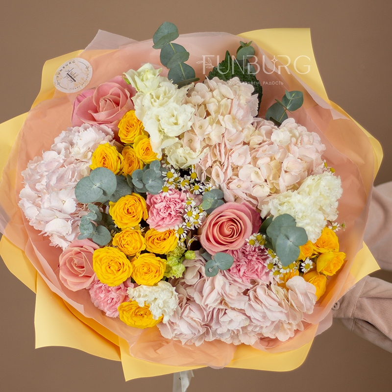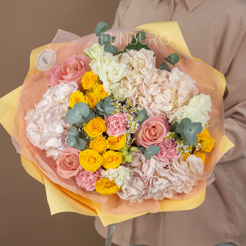 Большой нежный букет из свежих сезонных цветов в в тёплой розово-сливочной гамме с добавлением лимонного – удобный и красивый способ порадовать самых близких!