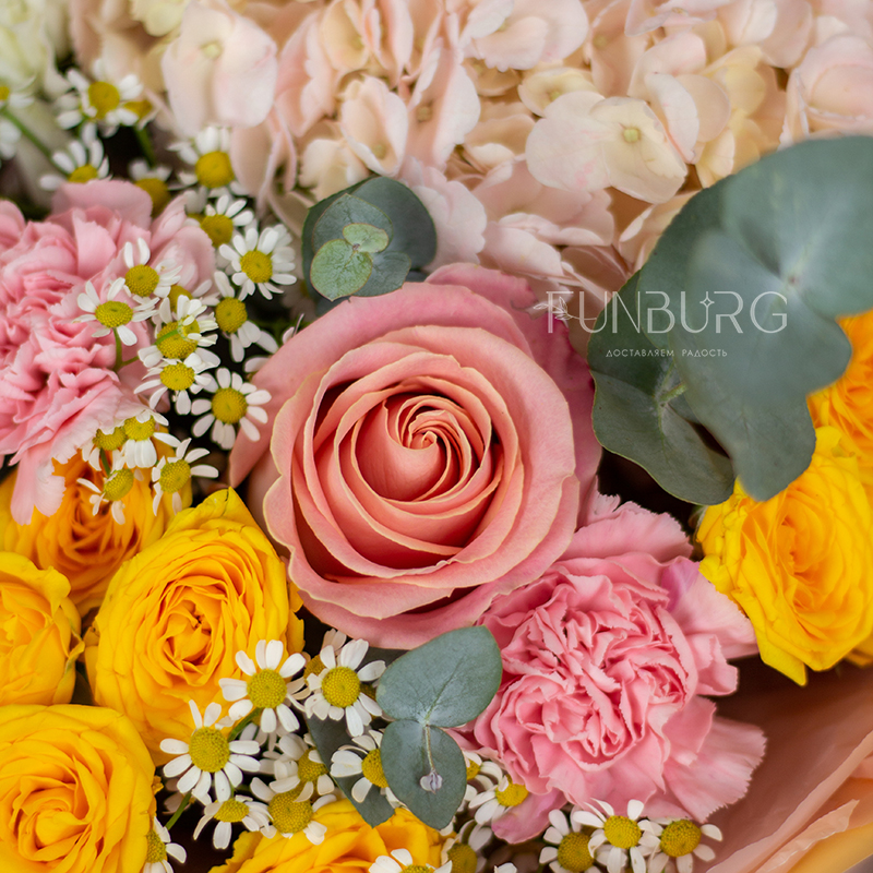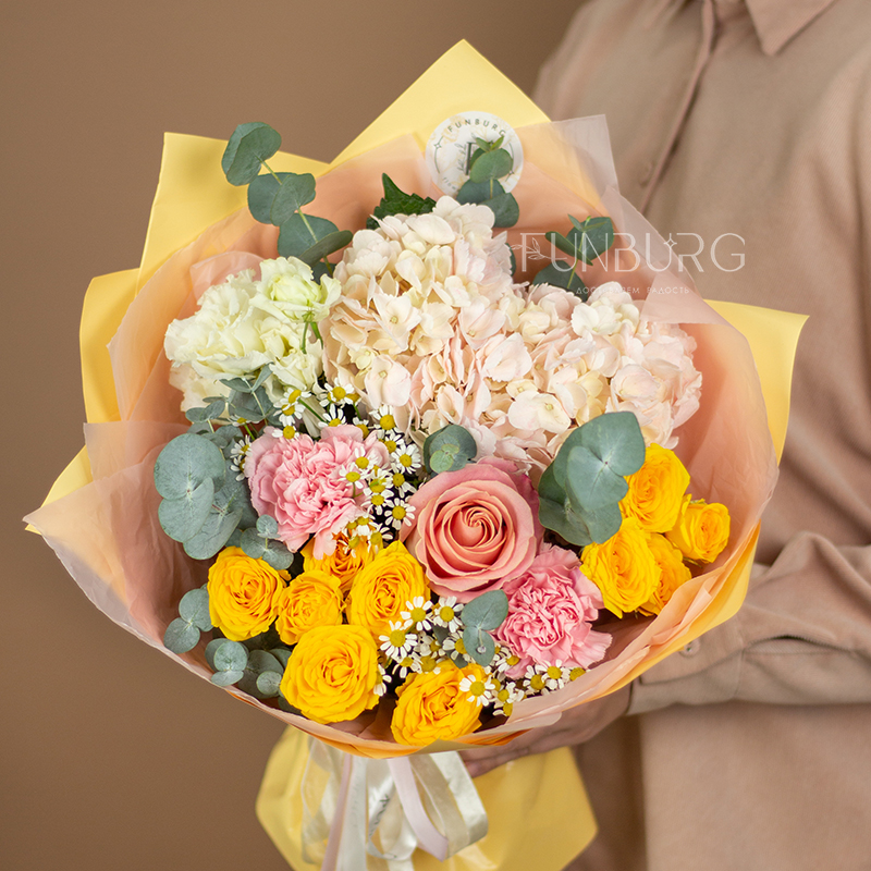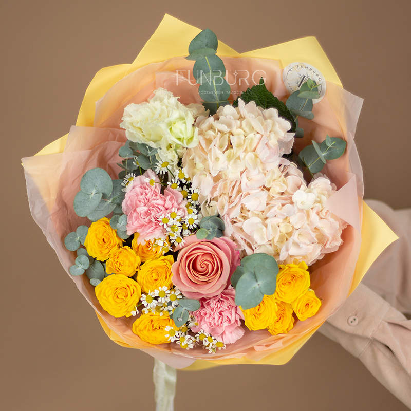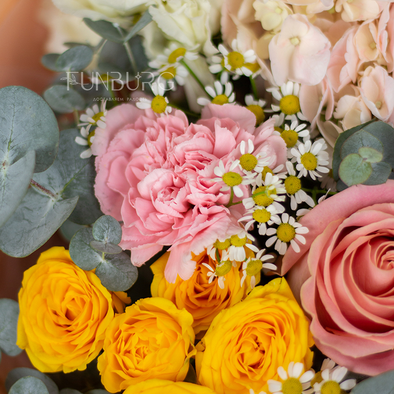 На фотографиях лишь пример, состав будет отличаться для каждого конкретного букета – это ассорти сезонных цветов в тёплой розовой, сливочной и жёлтой гамме. Летом в букете могут оказаться пионы или маттиола, а зимой и весной – ранункулюсы и тюльпаны. Вы всегда можете сообщить нам о своих пожеланиях, и мы обязательно их учтем.