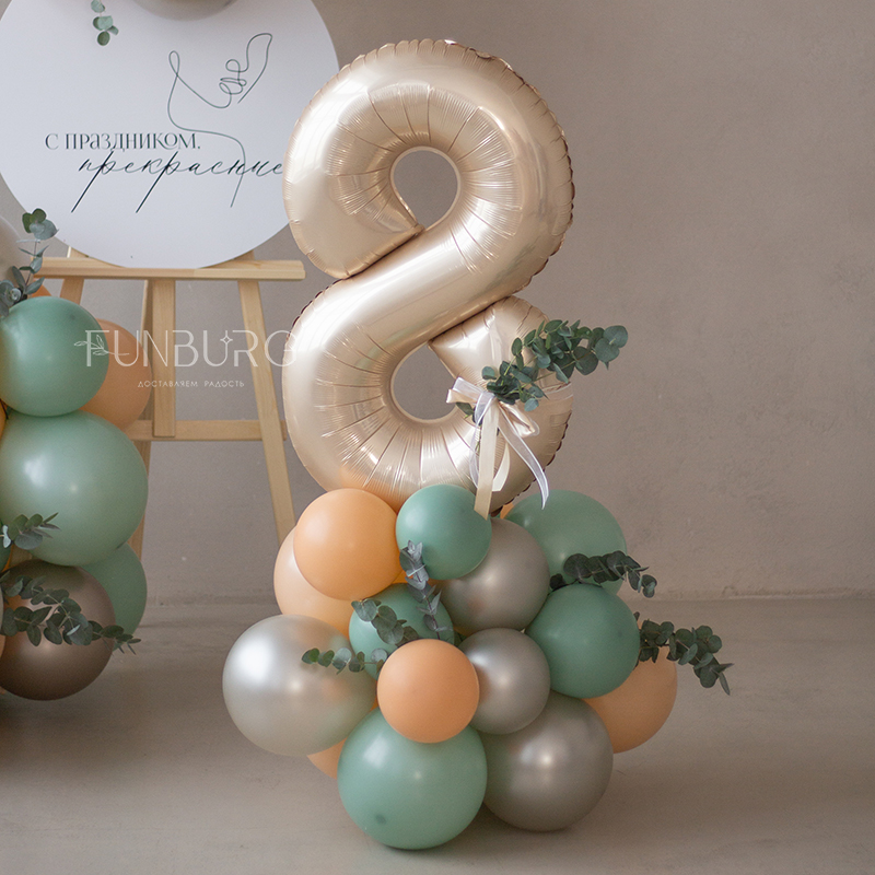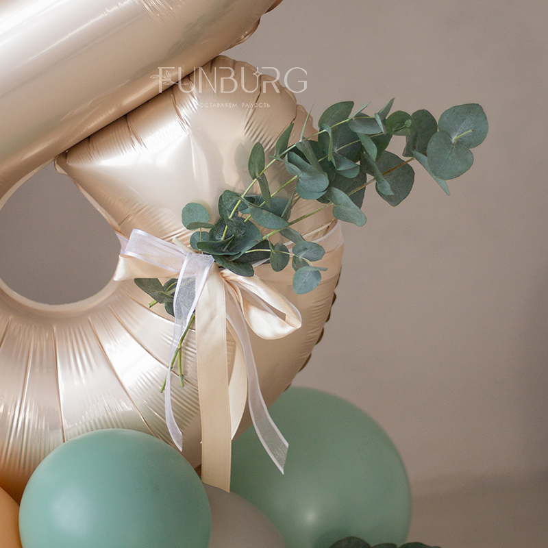 Небольшая фотозона с мольбертом, разнокалиберной гирляндой из шариков мягких оттенков и фигурой с кремовой цифрой (она может быть любой) и кругом, на который можно нанести любую надпись, идеально подходит для небольших оформлений, домашних праздников и фотосессий.