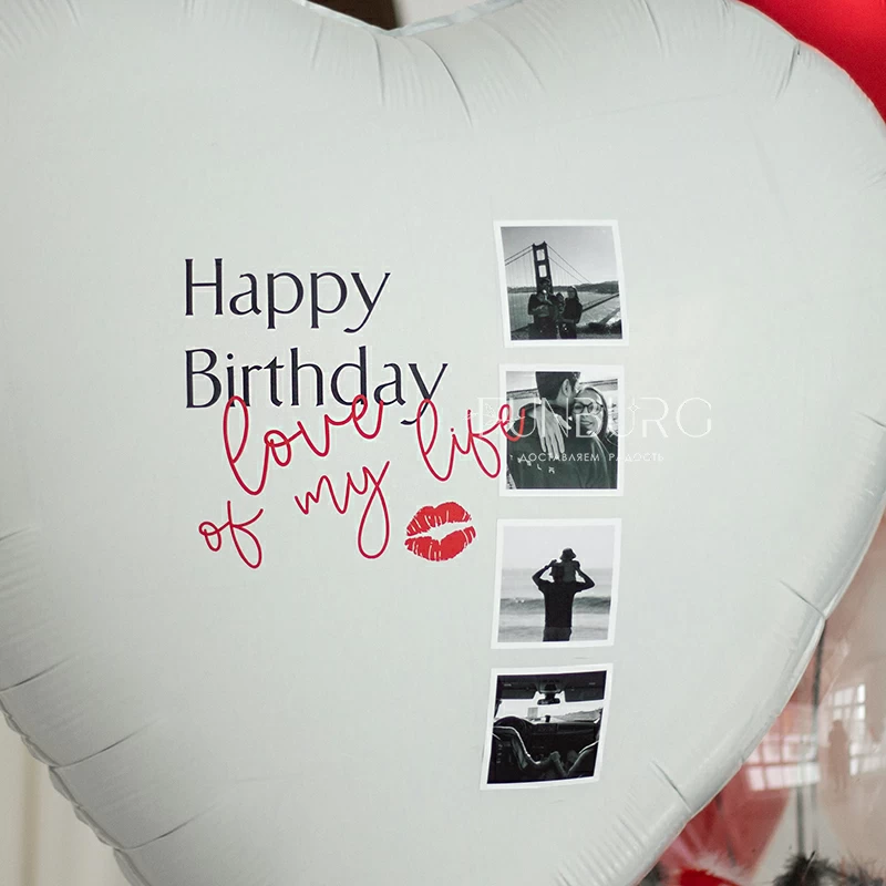 Огромное белоснежное сердце (его диаметр почти 1 метр!) из фольги с уникальным украшением в виде ваших фотографий и романтичной надписи станет незабываемым и очень трогательным подарком! Мы придумали дизайн расположения фотографий и надписи, а вам остается только выбрать из своего фотоархива самые ценные и подходящие снимки, придумать надпись (или использовать наш пример) - идеальная валентинка или просто сюрприз для близкого человека готовы!