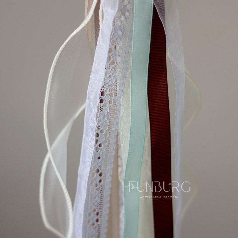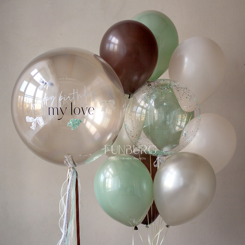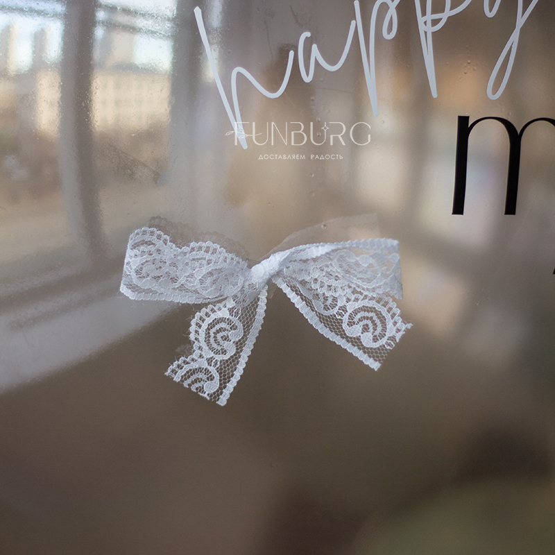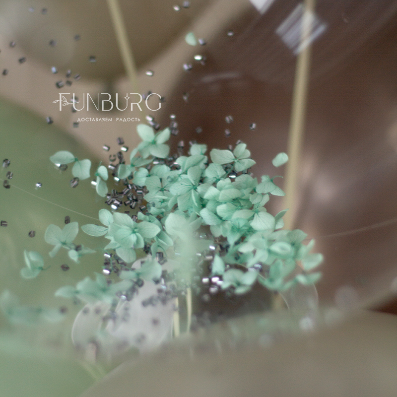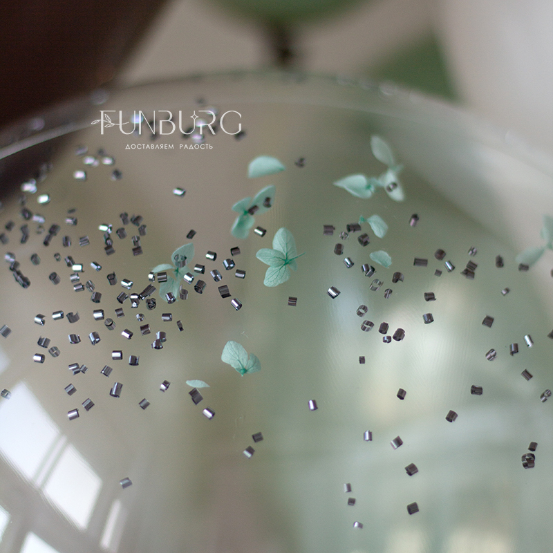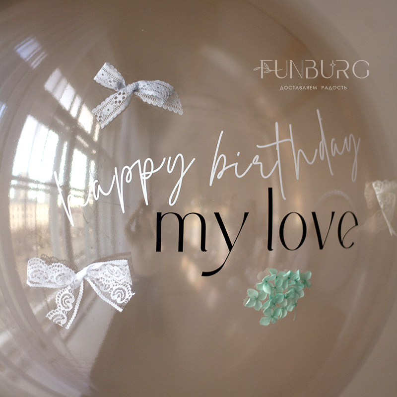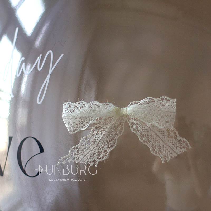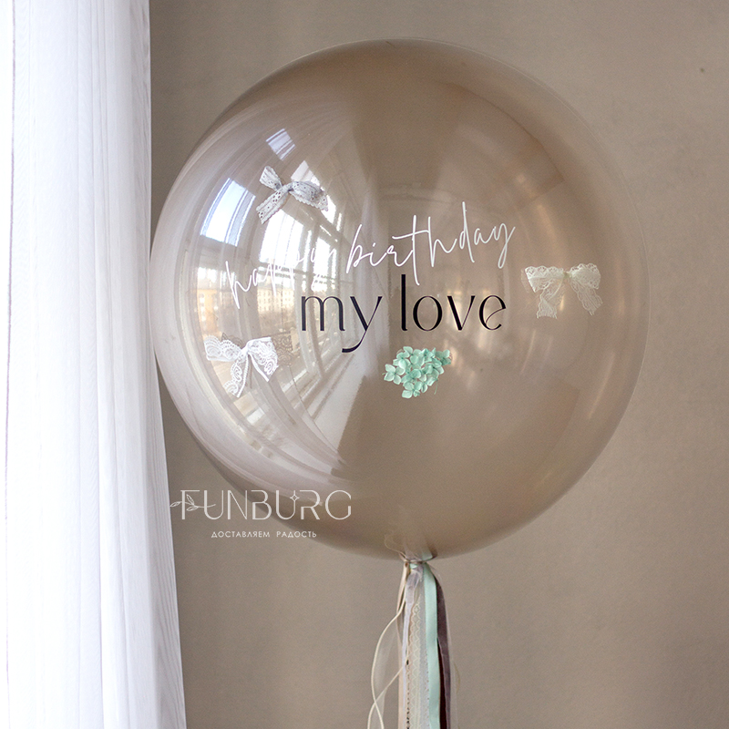 Большой глянцевый полупрозрачный шар сложного дымчатого оттенка с лаконичной надписью, декором из лепестков гортензии, кружевными бантиками, придающими немного винтажный вид, и шлейфом из ленточек станет стильным украшением праздника и идеальным подарком ценителям всего утонченного, необычного и изысканного.