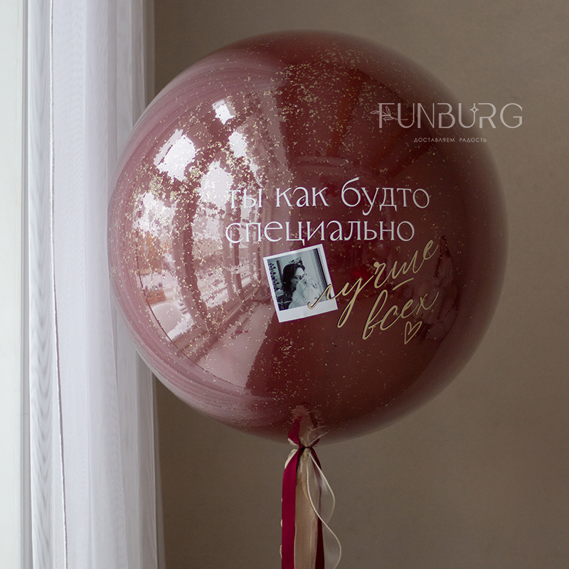 Большой глянцевый шар насыщенного винного оттенка и утонченным конфетти с вашей фотографией (ее нужно будет прислать нам на почту mail@funburg.ru) и надписью поможет красиво и необычно сказать, насколько особенным человеком для вас является получатель этого шарика. Надпись на шаре и оформление достаточно универсальны, поэтому он подойдёт как для нее, так и для него, для любого события или случая.