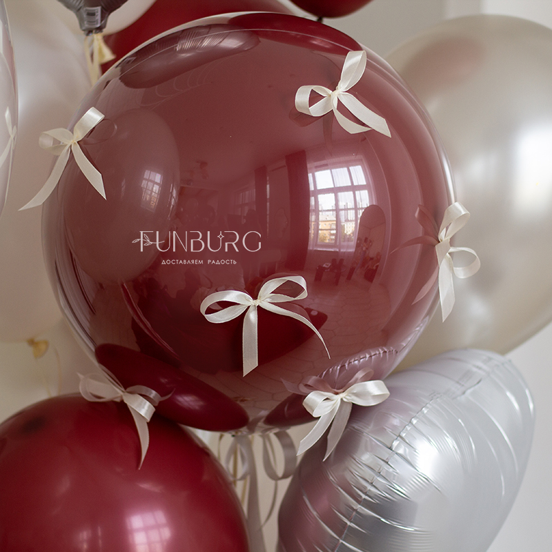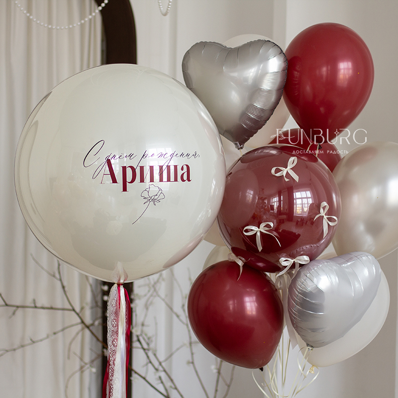 Большой зеркально-глянцевый шар нежнейшего мерцающего сливочно-белого оттенка с контрастной вишневой надписью (ее можно сделать любой), изящным цветком и шлейфом из лент разных текстур идеально подойдет для нежных и утонченных поздравлений.