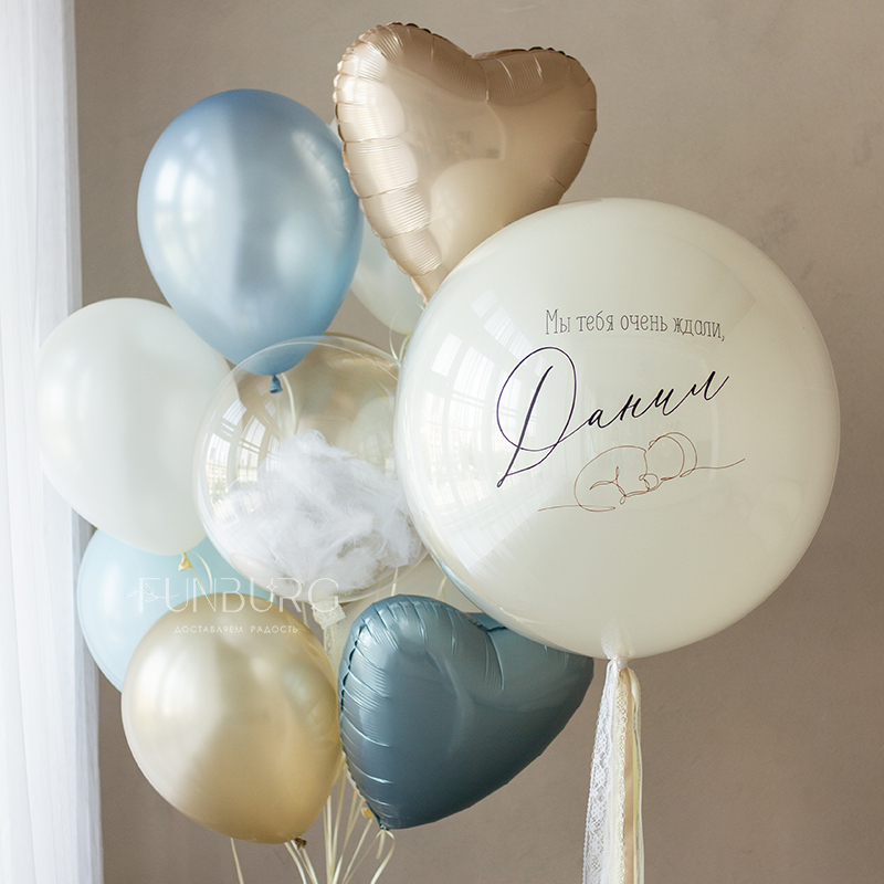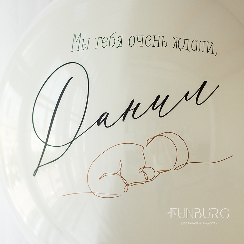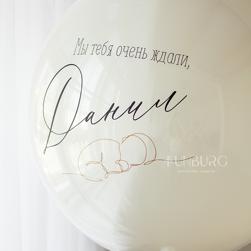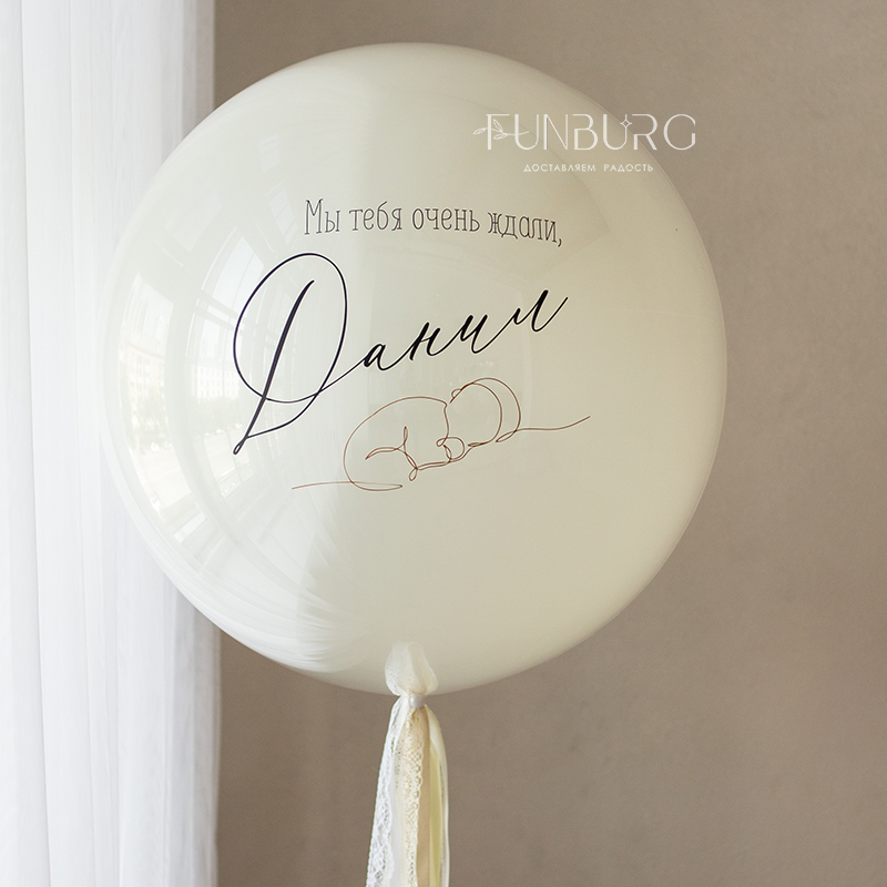 Большой зеркально-глянцевый шар нежнейшего мерцающего сливочно-белого оттенка с нежным рисунком младенца, выполненным одной линией, именем малыша, шлейфом из ленточек идеально подойдет для встречи мамы и малыша дома!