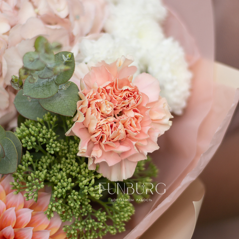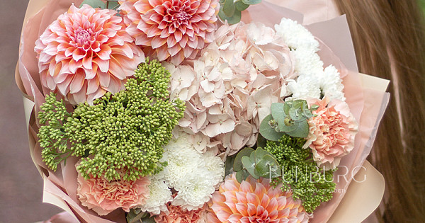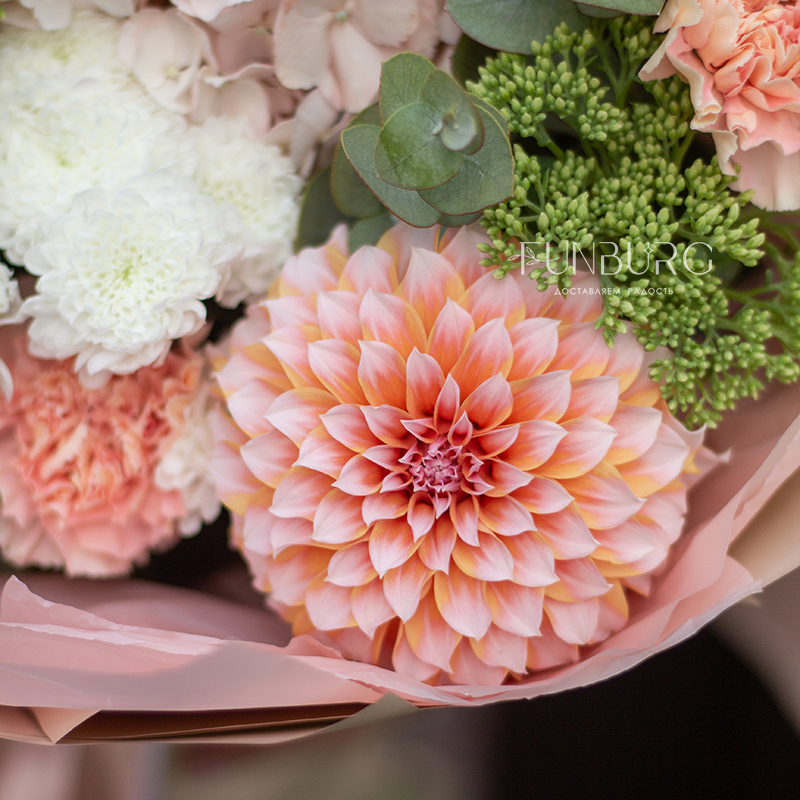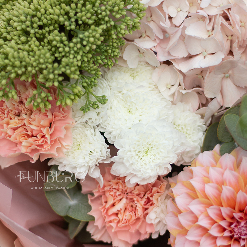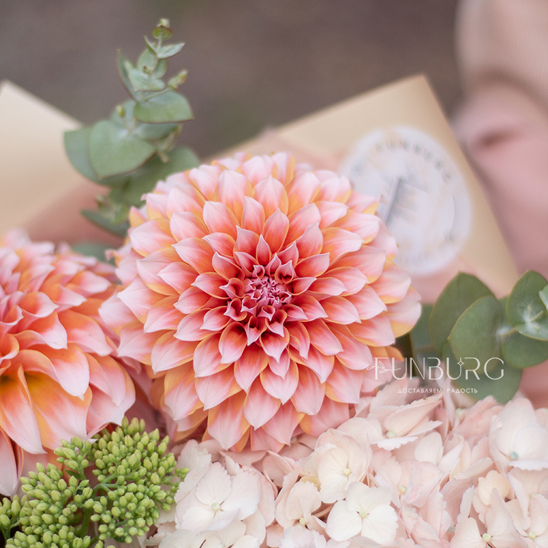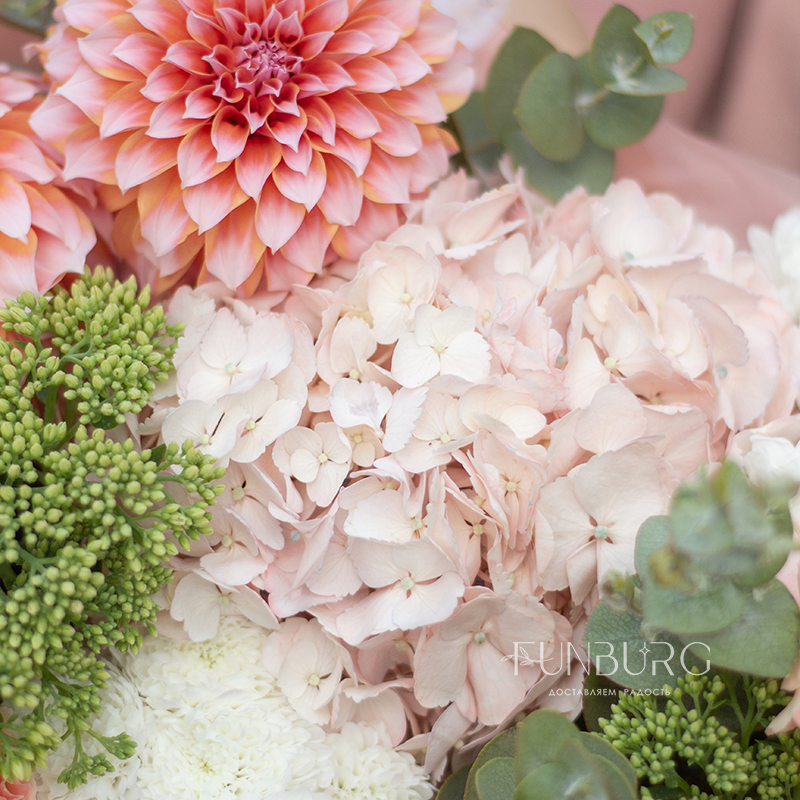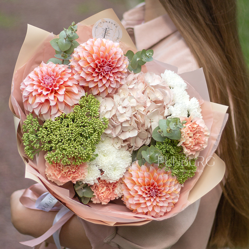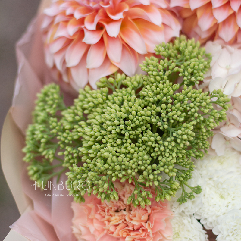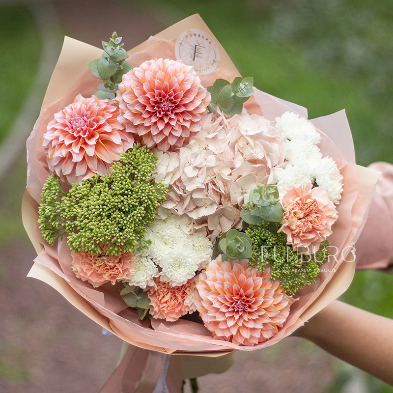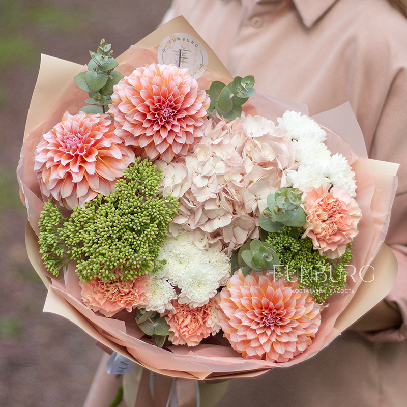 Согревающий тёплый букет оттенков тёплого пряного лета! В нём роскошные идеальные георгины оттенка закатного неба, румяно-розовая гортензия, персиковые кружевные гвоздики, облачка кустовых хризантем и бусинки салатово-зеленого седума. Идеальный летний цветочный сюрприз!