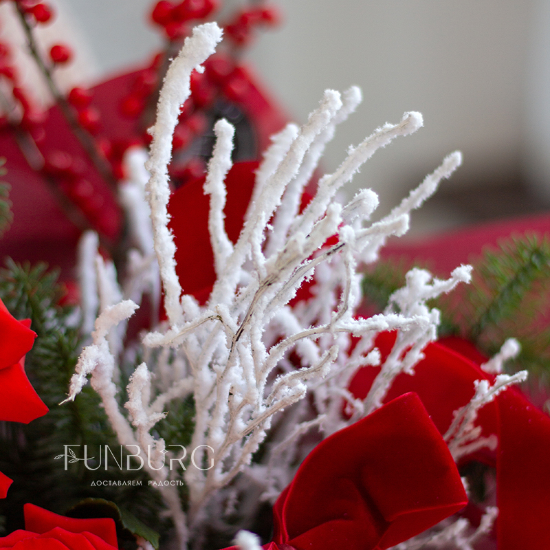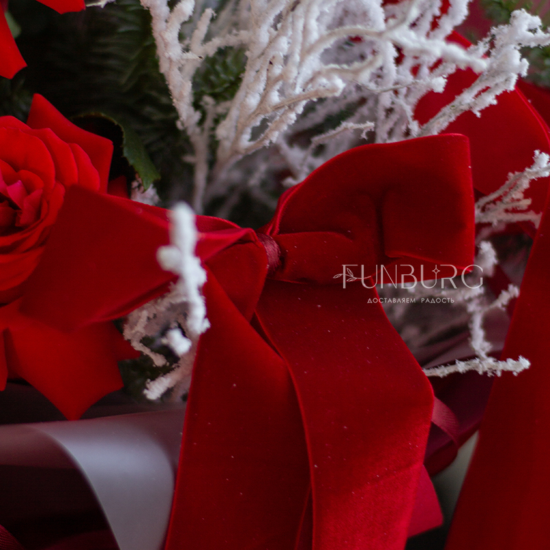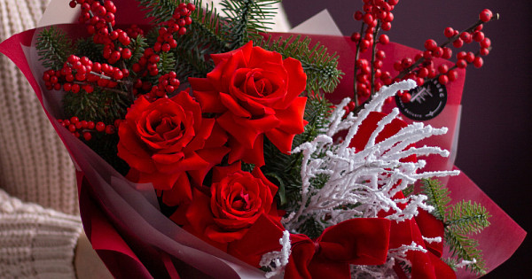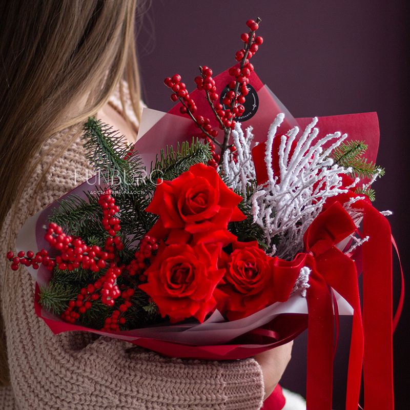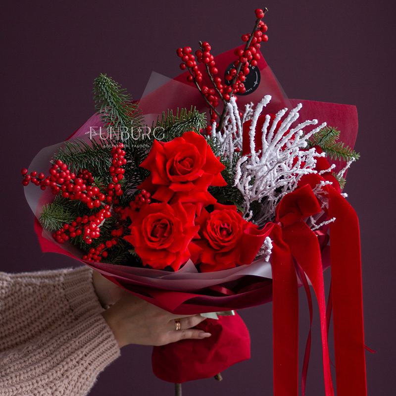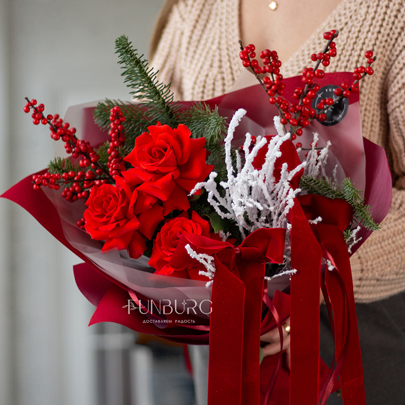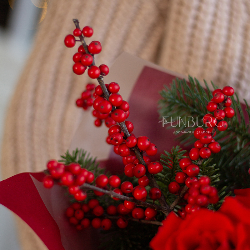 Пылающие французские алые розы Nina, яркие ягодки илекса, белоснежные веточки черничника в объятьях пушистого нобилиса и бархатистой бумаги. Этот букет согреет и передаст любовь в самые холодные времена.