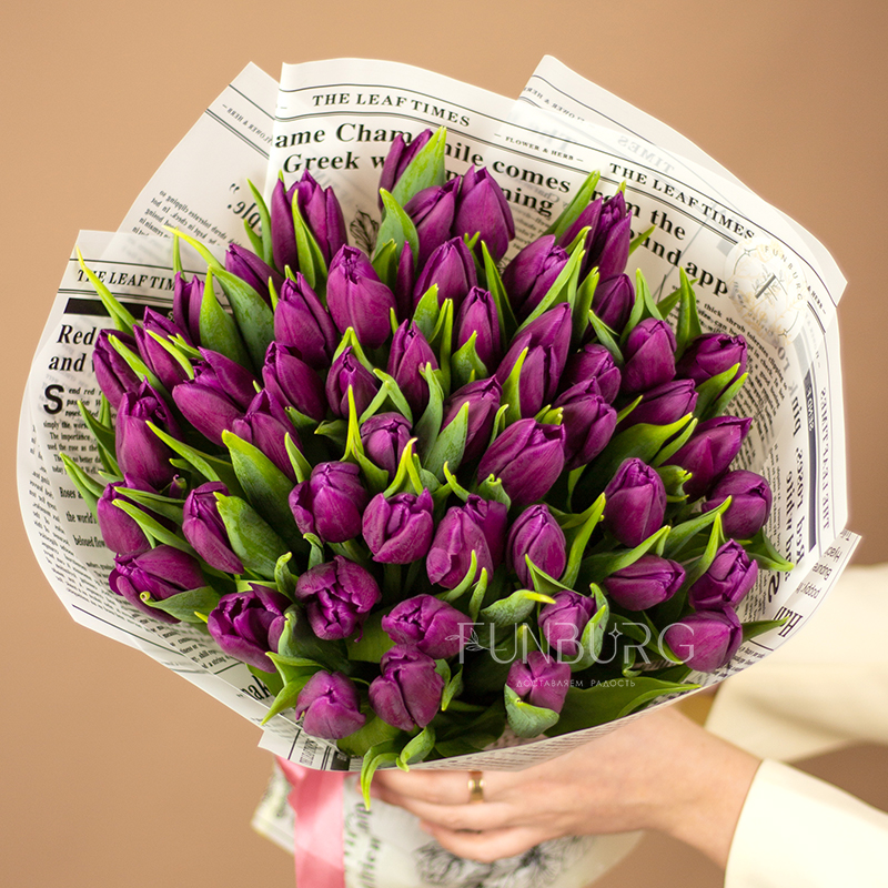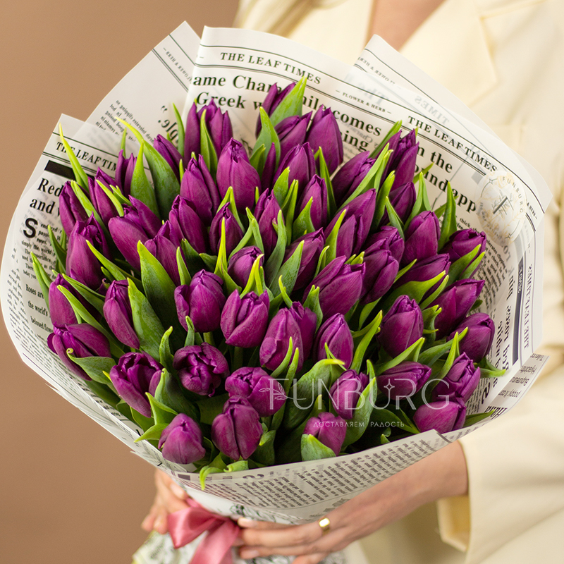 Букет из волшебных малиново-фиолетовых тюльпанов в спокойной матовой упаковке, оттеняющий их яркость, для идеальных весенних сюрпризов!