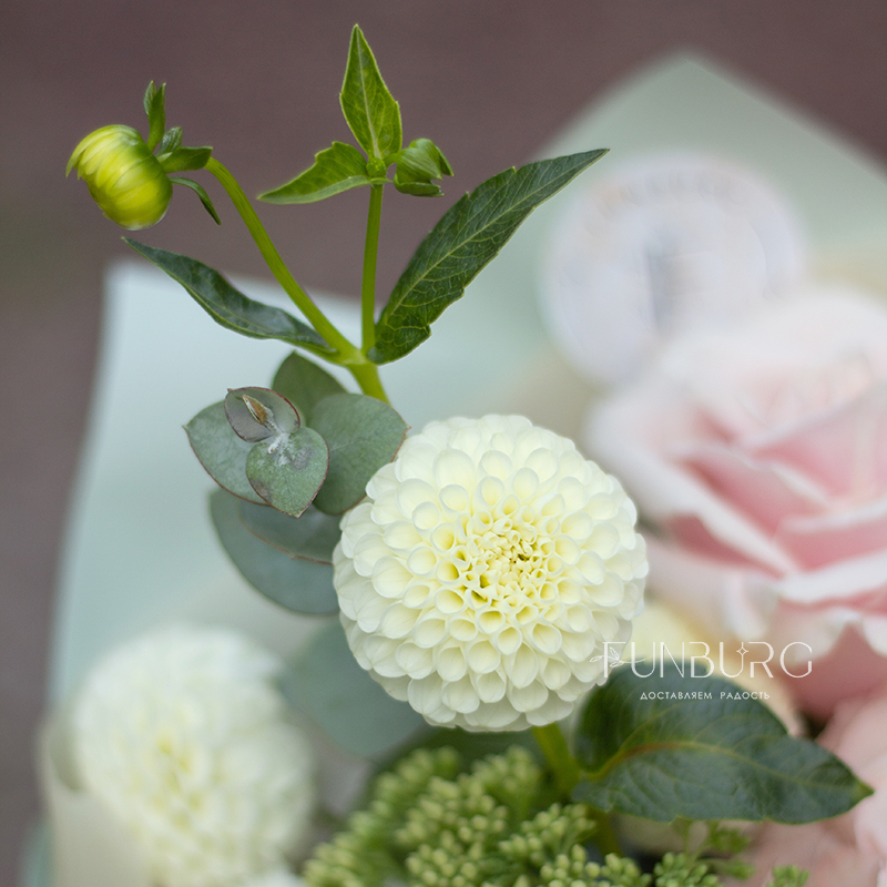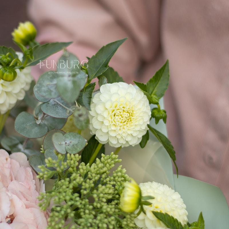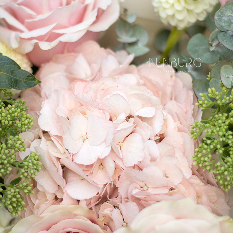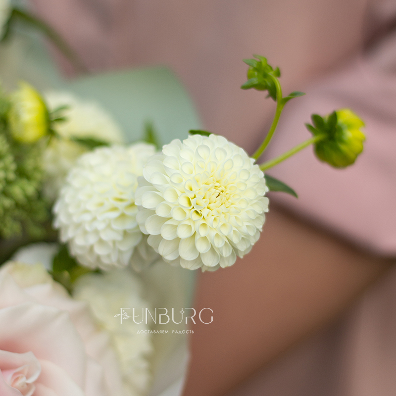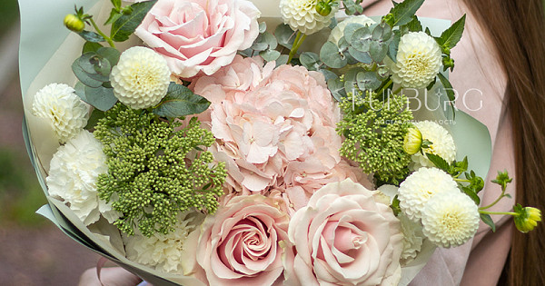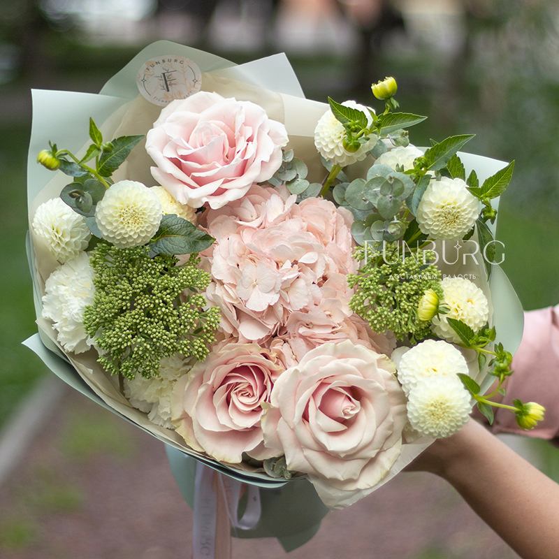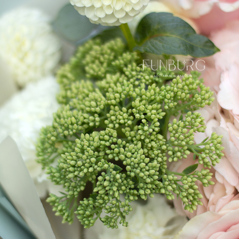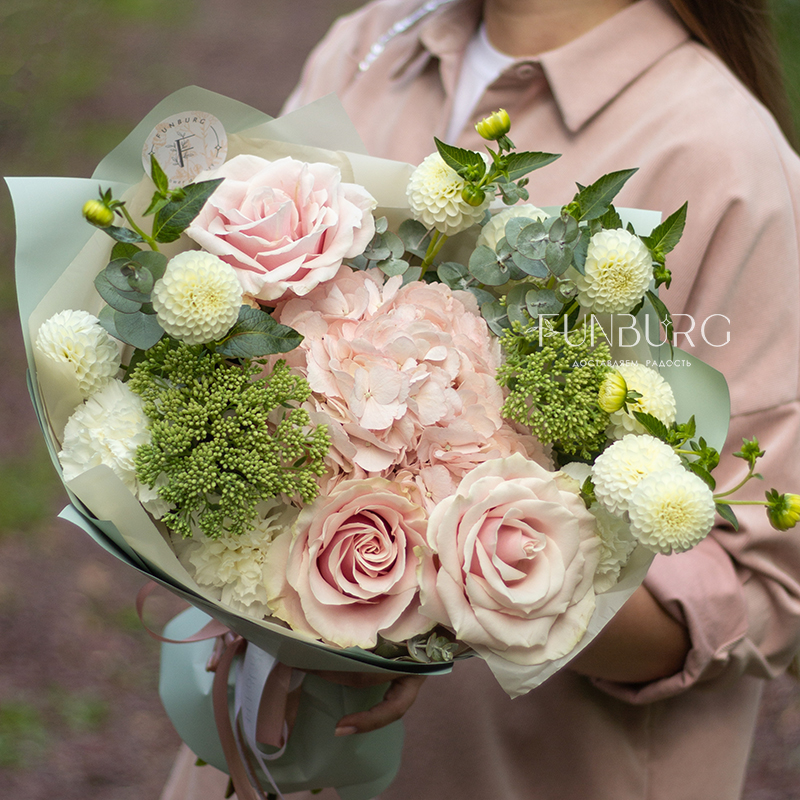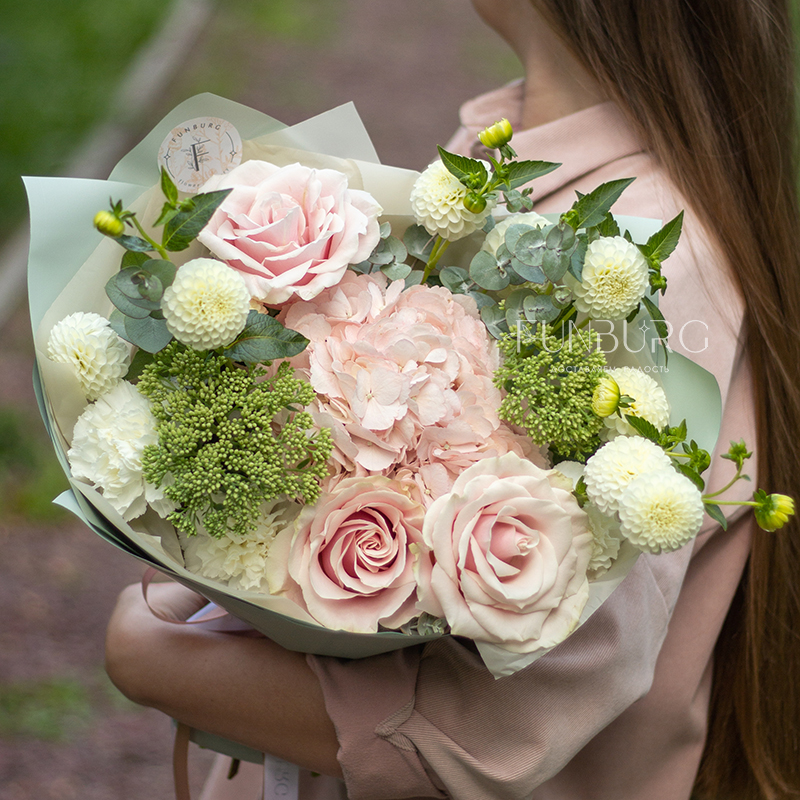 Невероятной красоты букет из воздушной гортензии, миниатюрных белых георгин, нежный сортовых роз Pink Mondial и салатовых веточек седума, напоминающего бусинки. Глядя на него словно переносишься в летний сад во Франции или на картины импрессионистов.