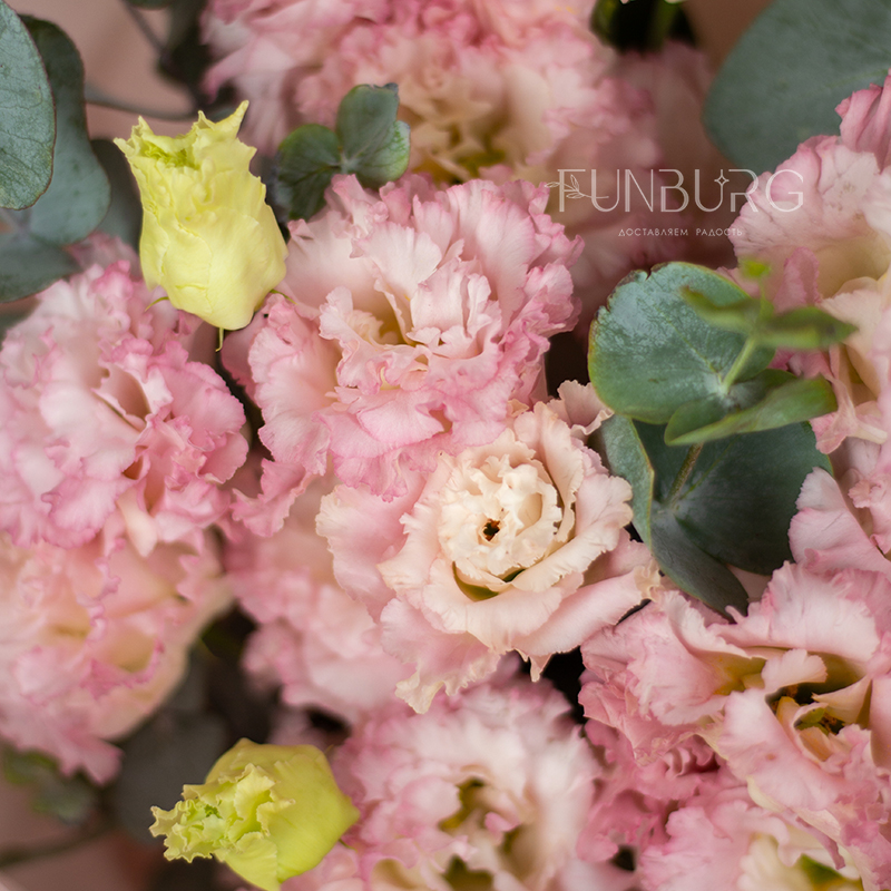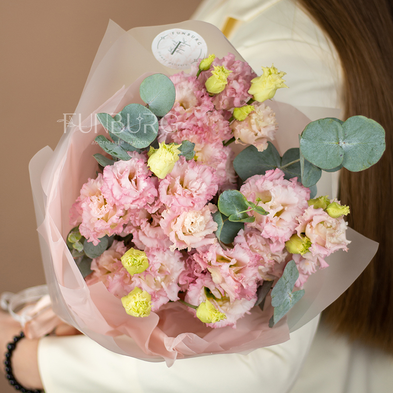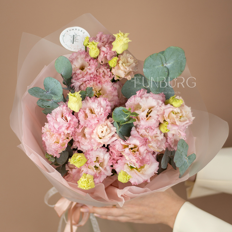 Нежный букет из воздушной сливочно-розовой эустомы, дополненной серебристым эвкалиптом, словно листьями мяты, и минималистичной невесомой полупрозрачной упаковкой в тон. Для любителей эустом и безупречной природной простоты.