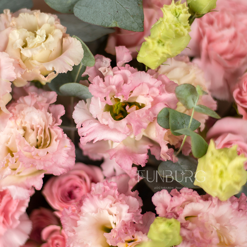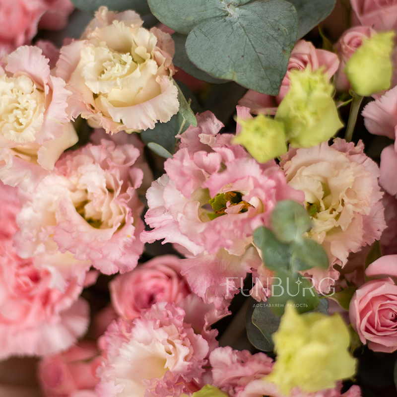 Нежный кружевной букет из румяно-розовых ажурных эустом, конфетных кустовых роз и диантусов, оттенённых веточками эвкалипта.