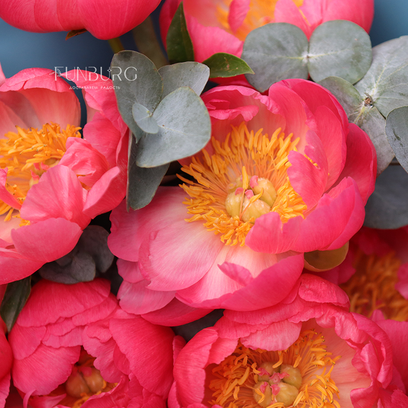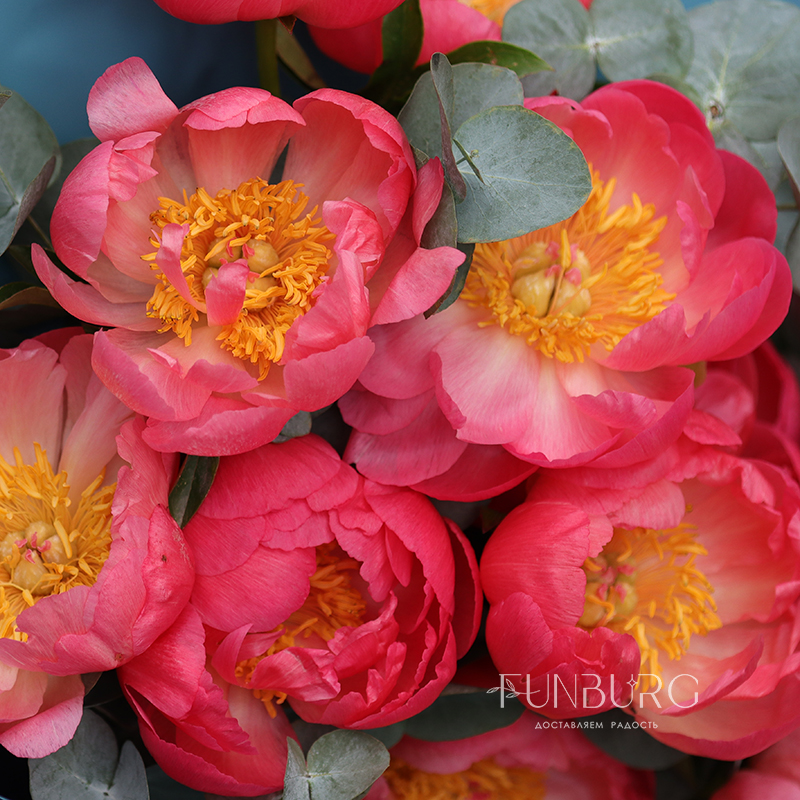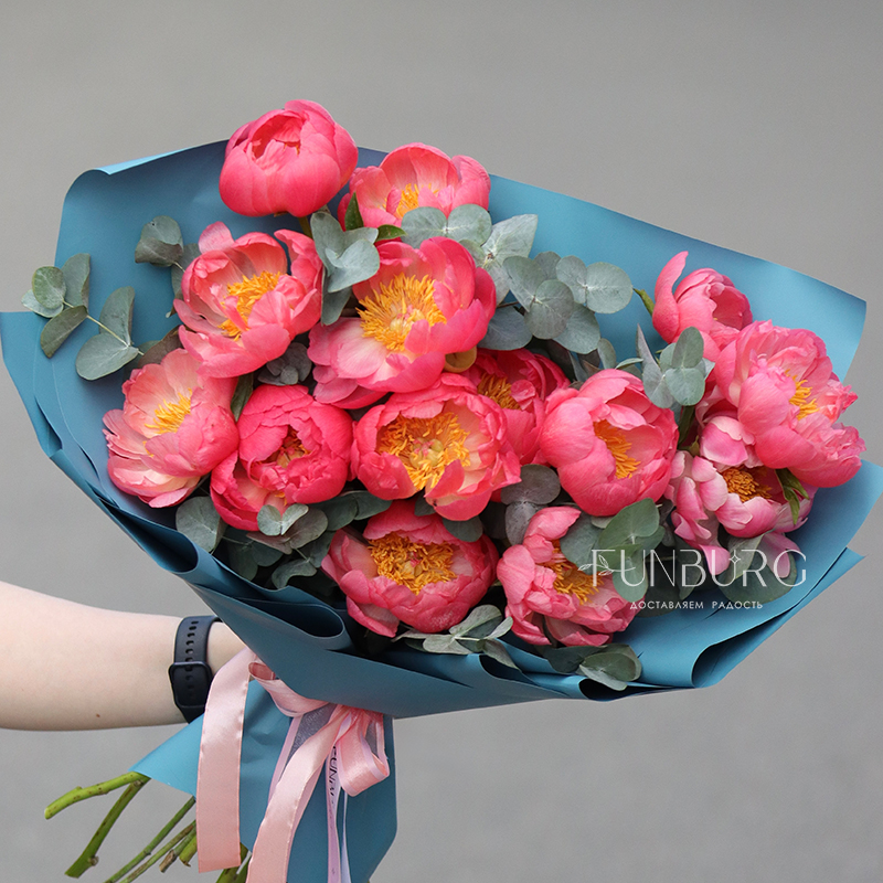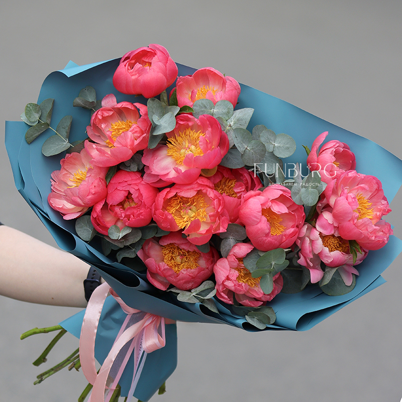 Букет, словно сошедший с полотен великих импрессионистов! Волшебные, меняющие цвет, коралловые пионы в нем обрамлены серебристым эвкалиптом, а их яркость подчеркнута контрастной бирюзовой упаковкой, напоминающей гладь лесного озера.