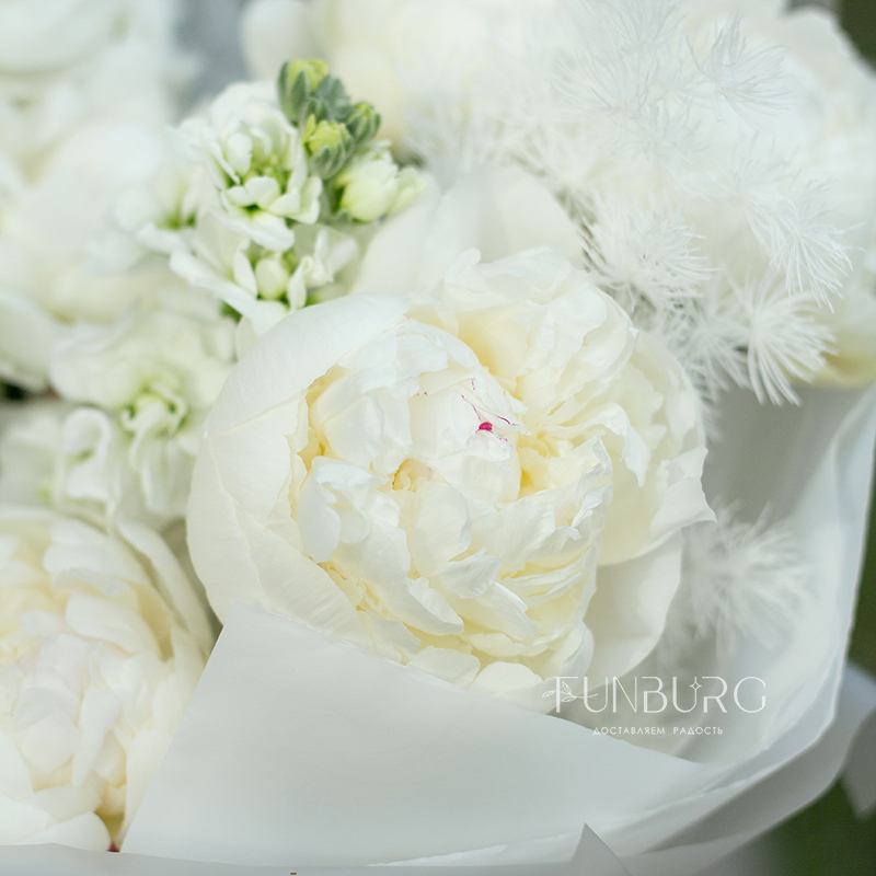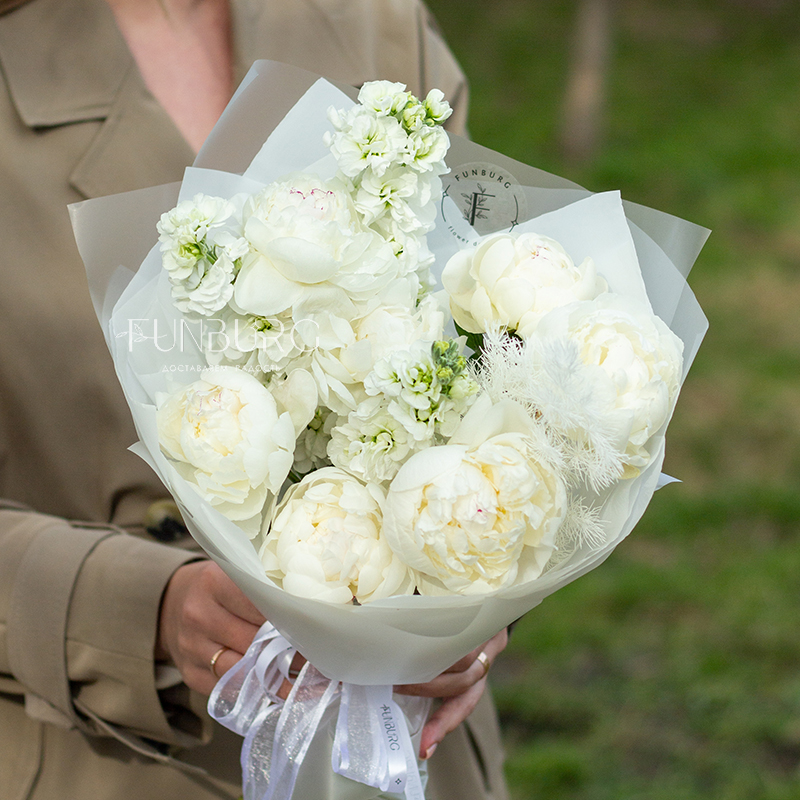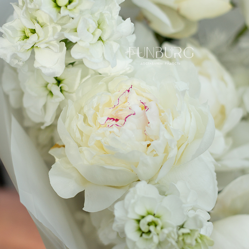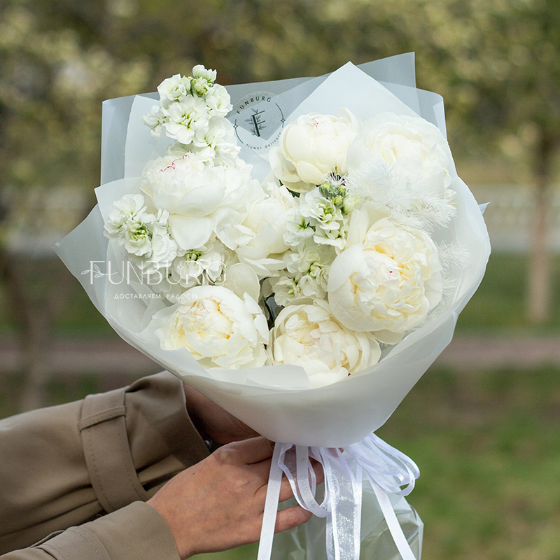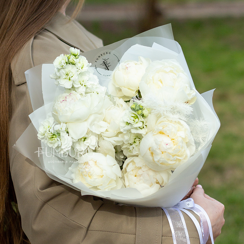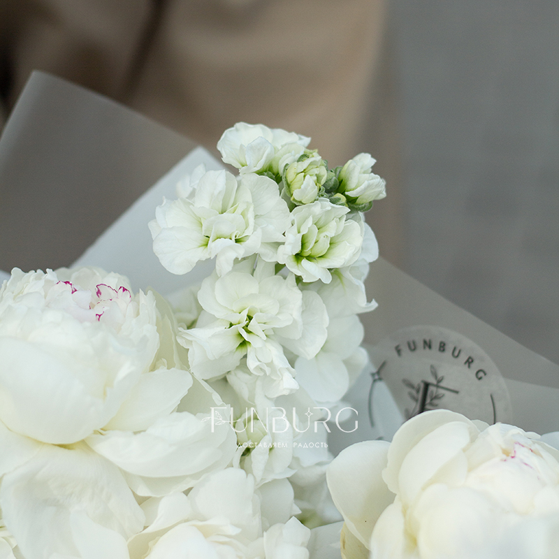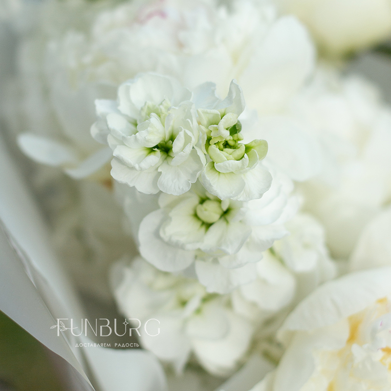 Нежнейший букет из белых пионов и белоснежной маттиолы с умопомрачительным пряным ароматом с нотками перца и утренней прохлады мгновенно перенесет в цветущий летний сад, нагретый лучами солнца!