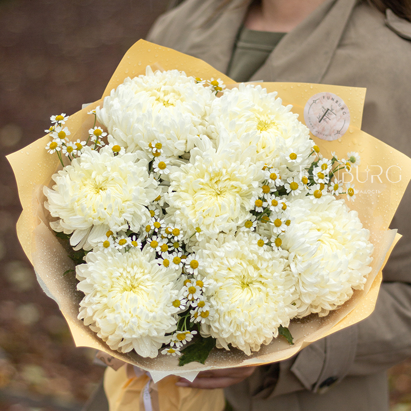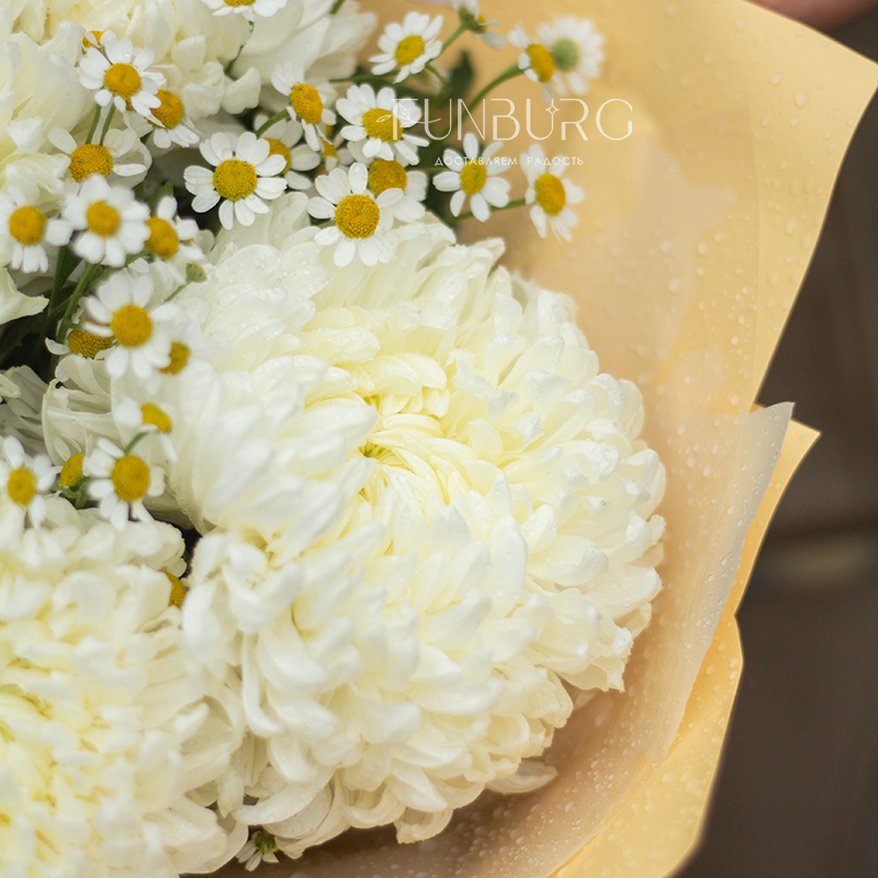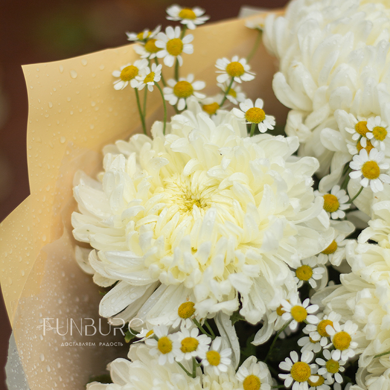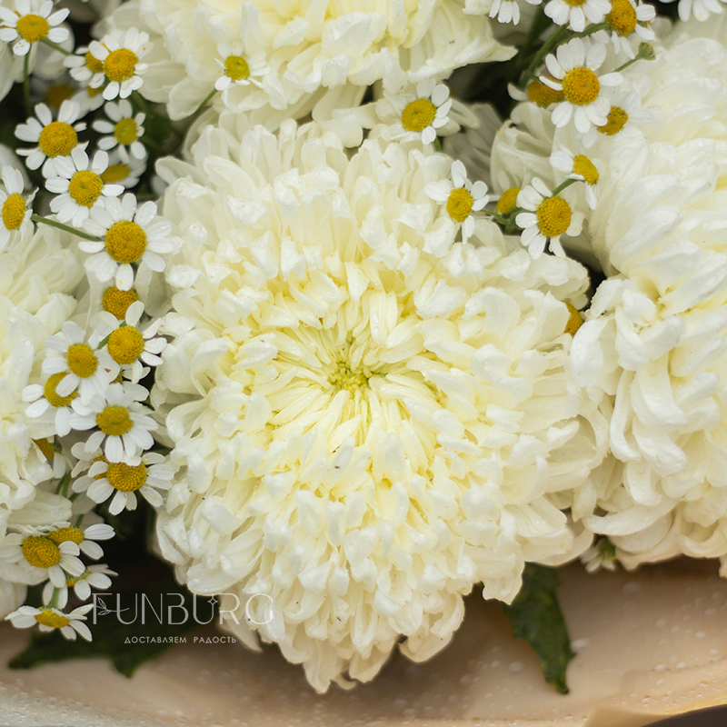 Нежнейший дуобукет из роскошных сливочных хризантем и трогательных ромашек. Просто и безупречно красиво.