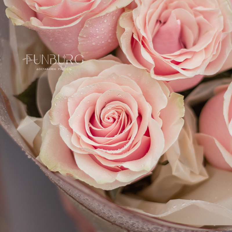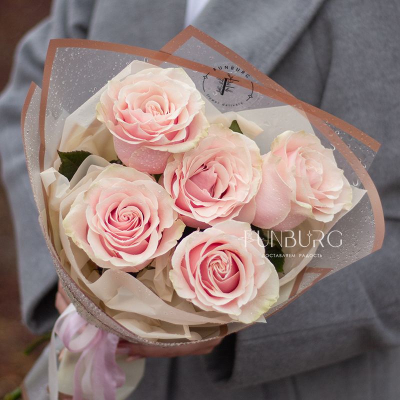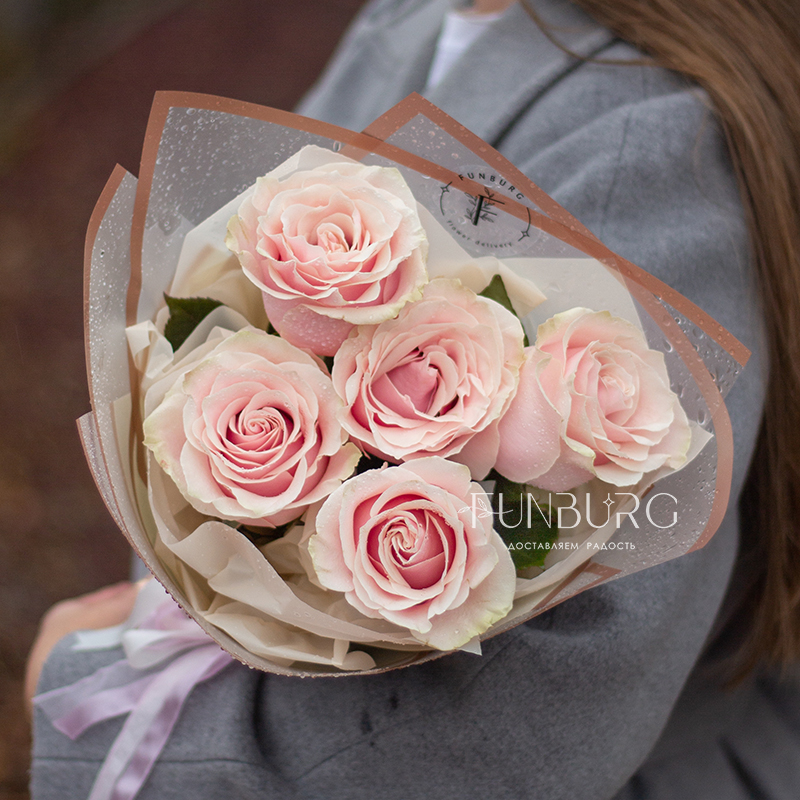 Мини-букет из роскошных роз сорта Pink Mondial с красивыми крупными бутонами нежного розового цвета с теплым бежевым подтоном, которые со временем красиво раскрываются, завораживая воздушностью нежных лепестков. Розы этого сорта не только красивые, но и достаточно стойкие, поэтому при правильном уходе будут радовать дольше обычных роз.