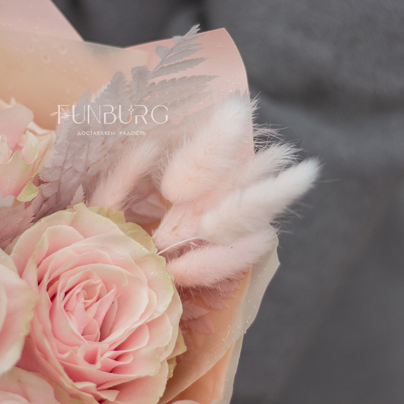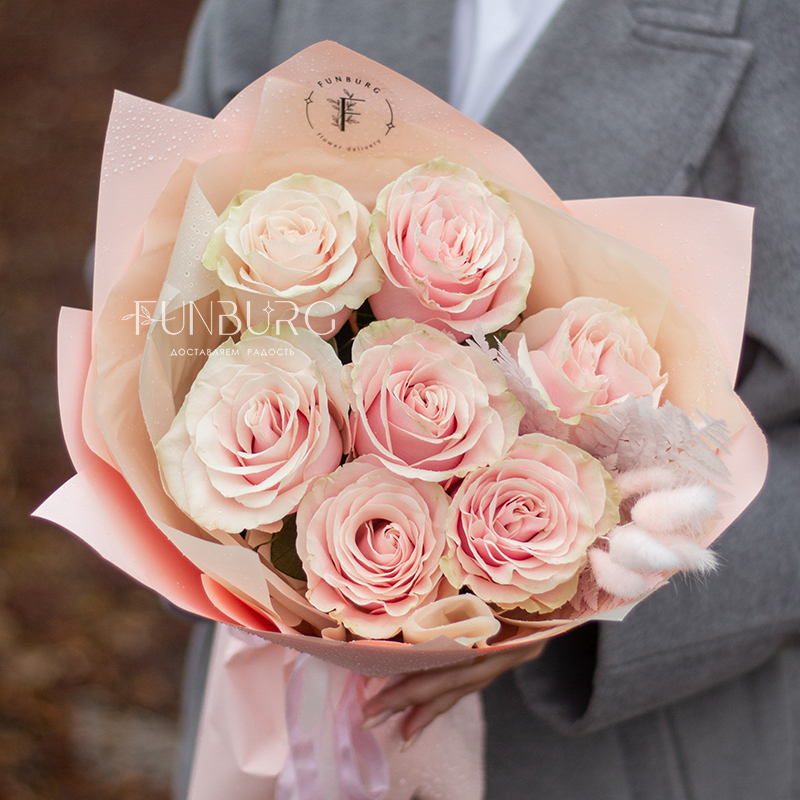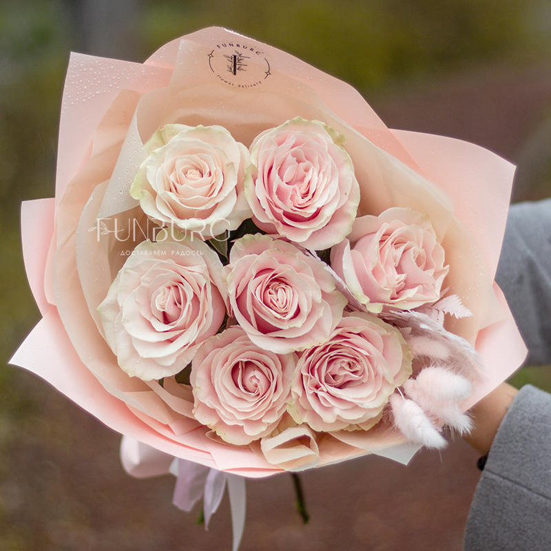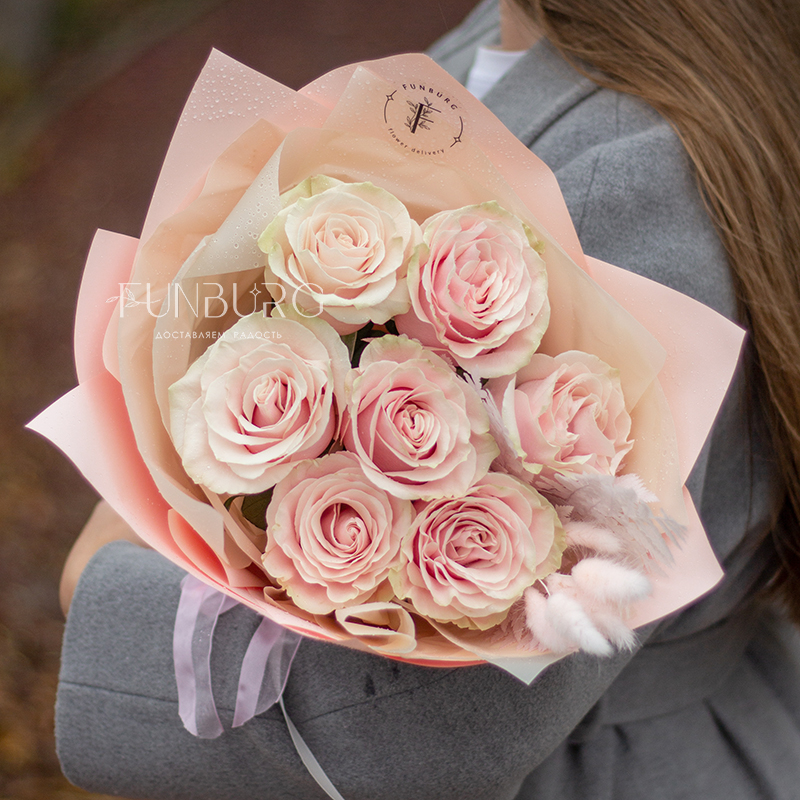 Монобукет из роскошных роз сорта Pink Mondial с красивыми крупными бутонами нежного розового цвета с теплым бежевым подтоном, которые со временем красиво раскрываются, завораживая воздушностью нежных лепестков. Для еще большей нежности дополнили розы розовыми веточками лагуруса. Розы этого сорта не только красивые, но и достаточно стойкие, поэтому при правильном уходе будут радовать дольше обычных роз.