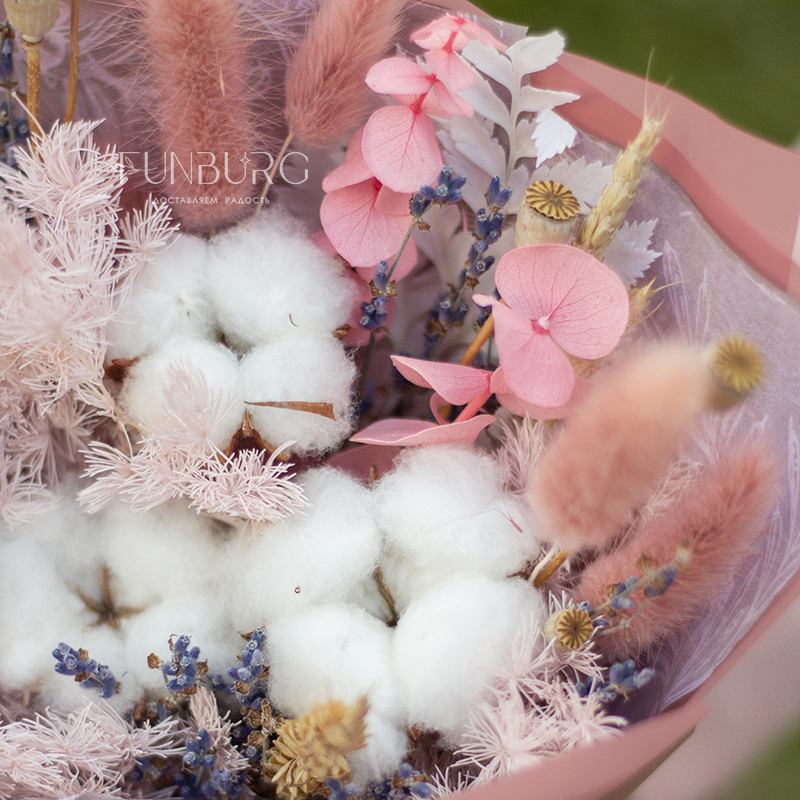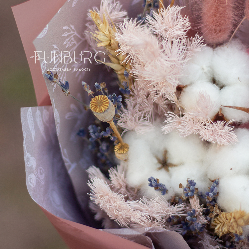 Гармоничное сочетание контрастных текстур и форм: мягкость и воздушность облачков хлопка, сиреневые веточки ароматной лаванды, пушистые хвостики лагурусаса и пшеницы, невесомые веточки аспарагуса, пшеница и лаванда, окутывающая своим волшебным успокаивающим ароматом.