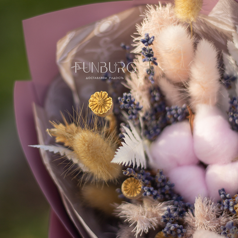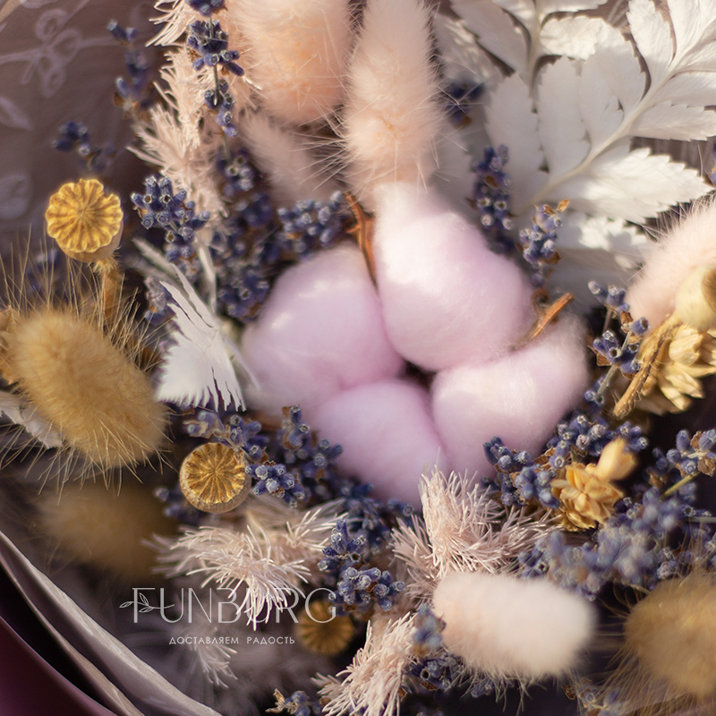 Гармоничное сочетание контрастных текстур и форм: мягкость и воздушность облачков хлопка, сиреневые веточки ароматной лаванды, пушистые хвостики лагуруса и пшеницы, невесомые веточки аспарагуса, пшеница и лаванда, окутывающая своим волшебным успокаивающим ароматом.