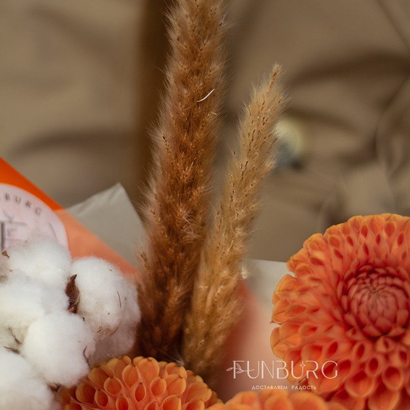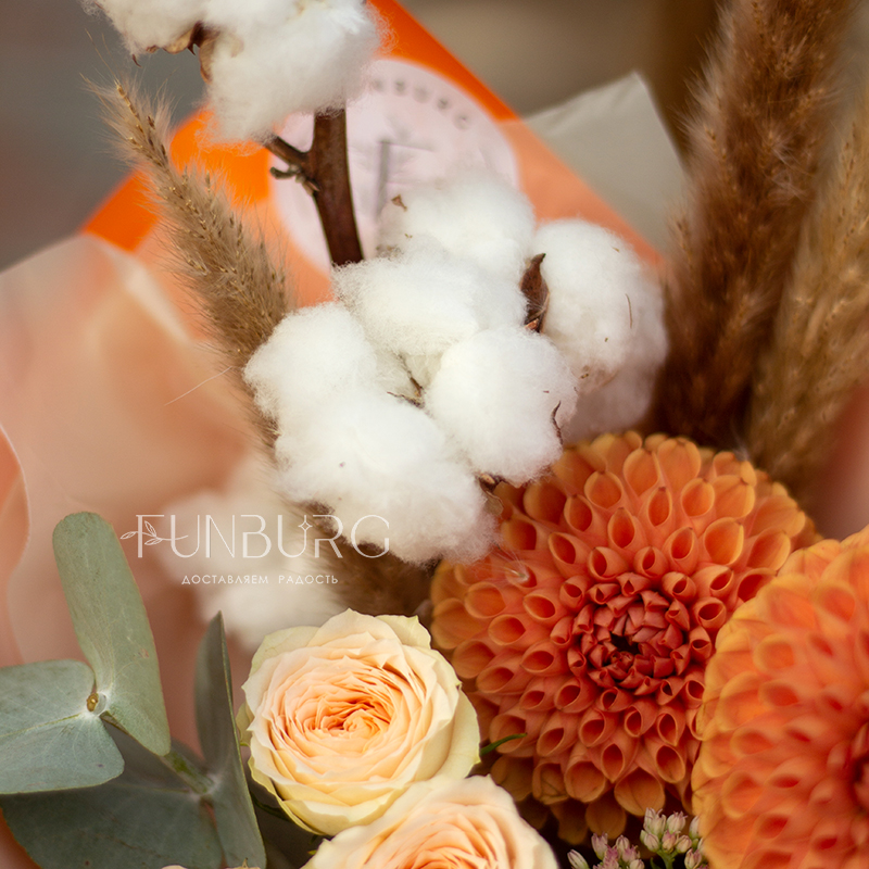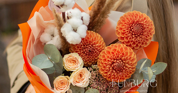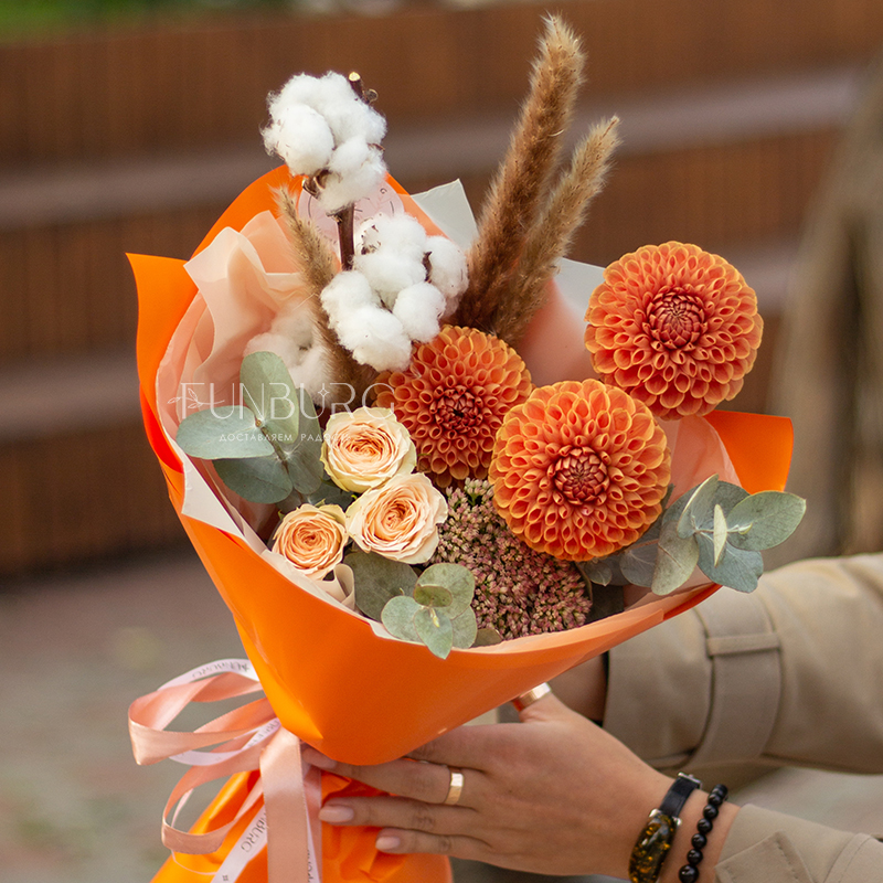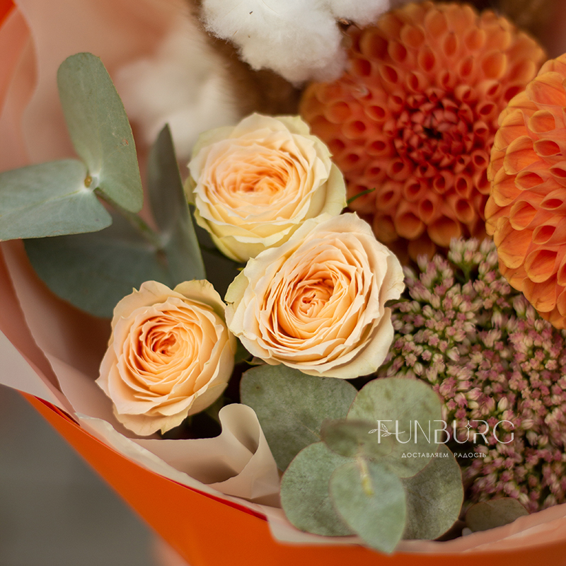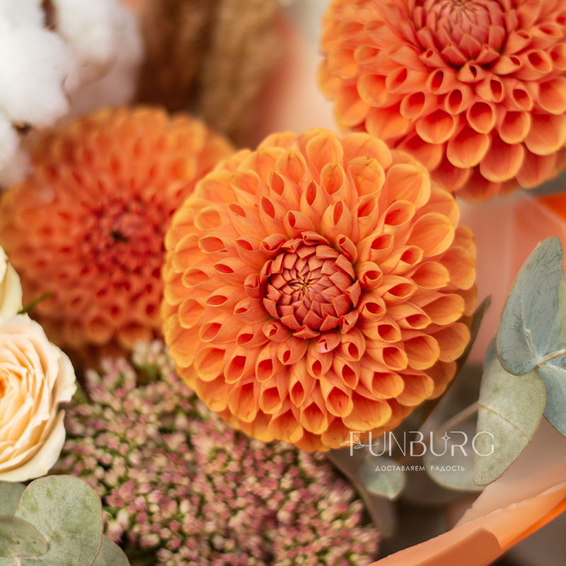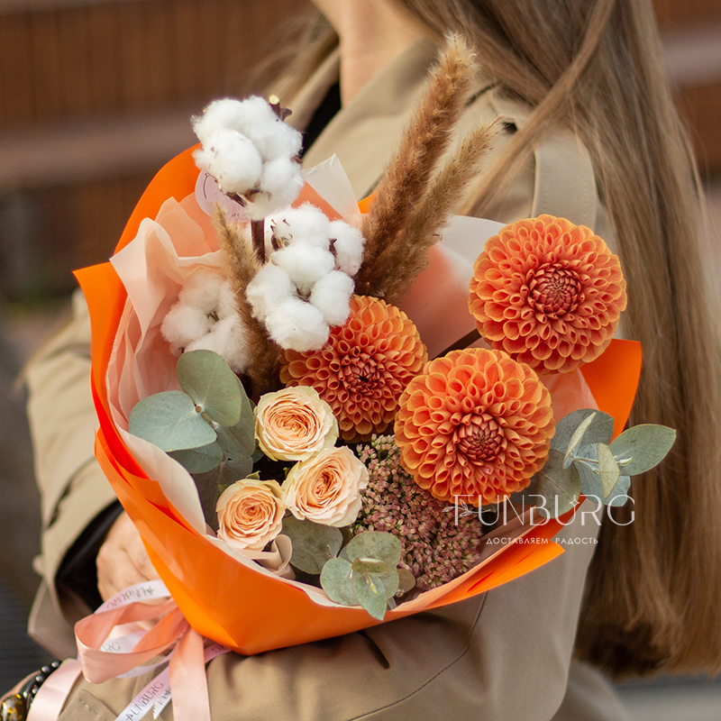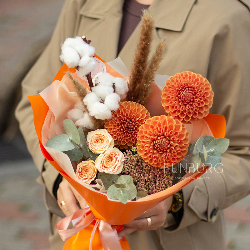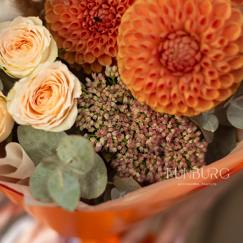 Согревающий тёплый букет оттенков тёплой пряной осени! В нём роскошные идеальные георгины оттенка закатного солнца, персиковые розы, облачка мягкого хлопка и бусинки бордово-салатового седума. Идеальный летний и осенний цветочный сюрприз!