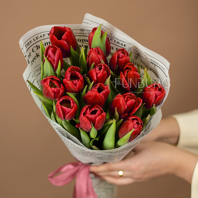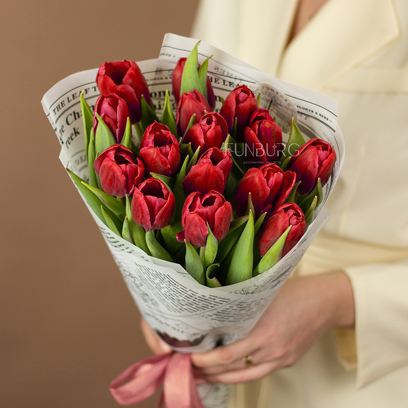 Букет из тюльпанов красивого насыщенного красного оттенка в контрастной белой упаковке с принтом с цветочными вестями для идеальных весенних сюрпризов!