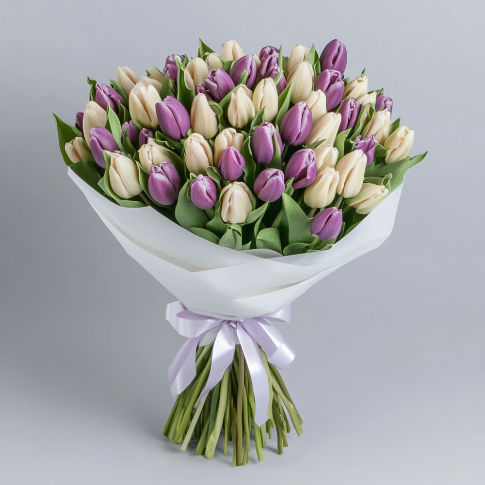 Букет кремовых и пурпурных тюльпанов L