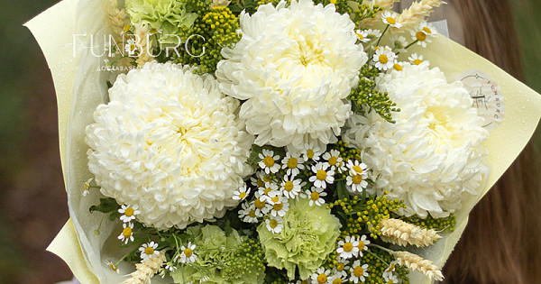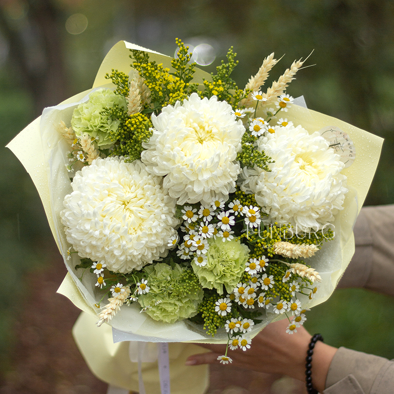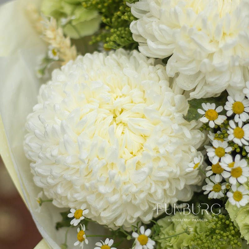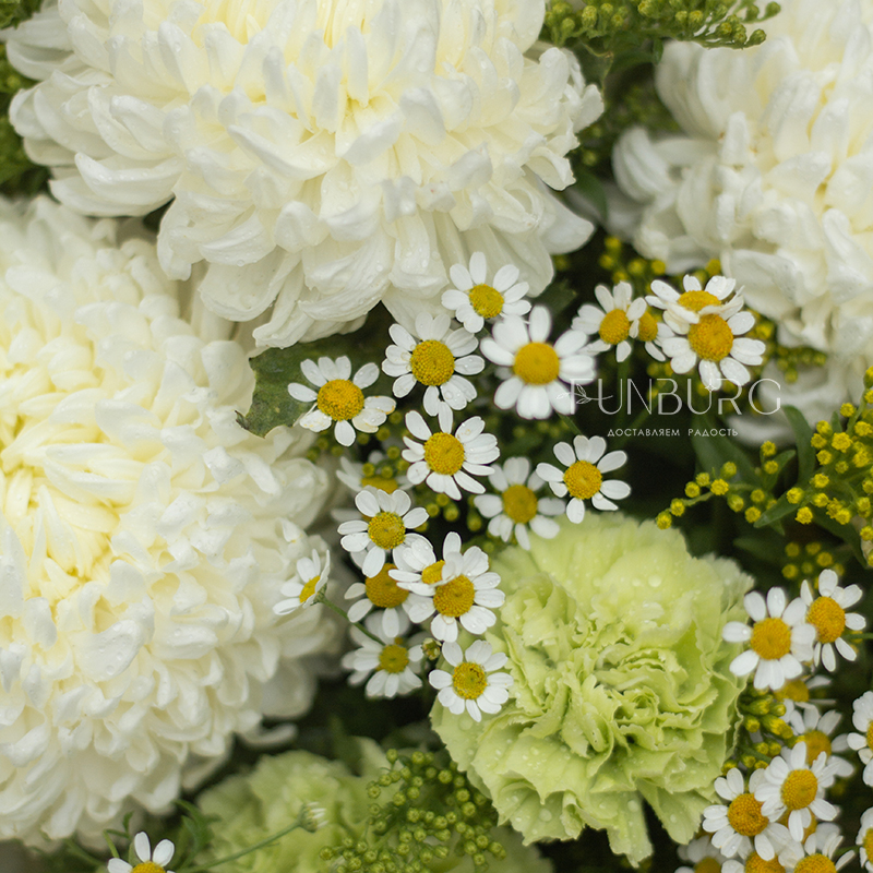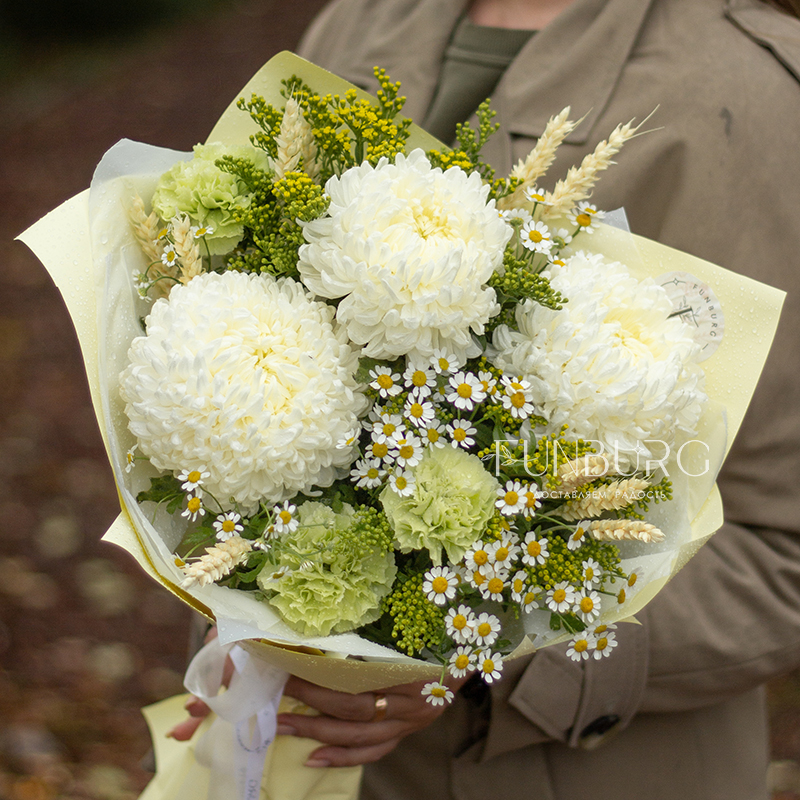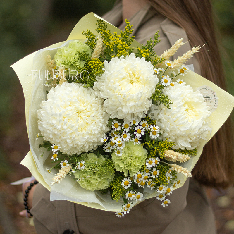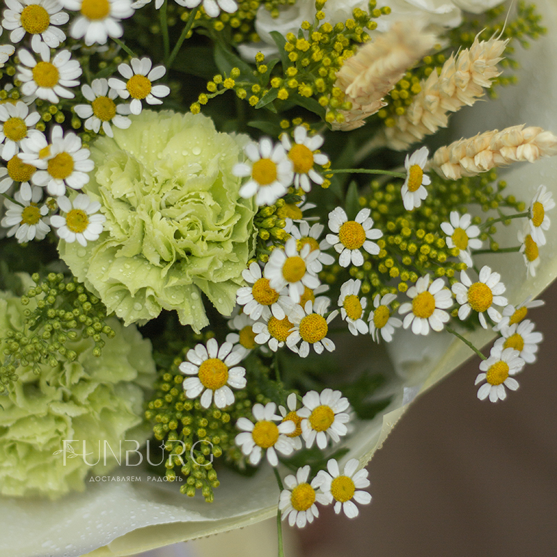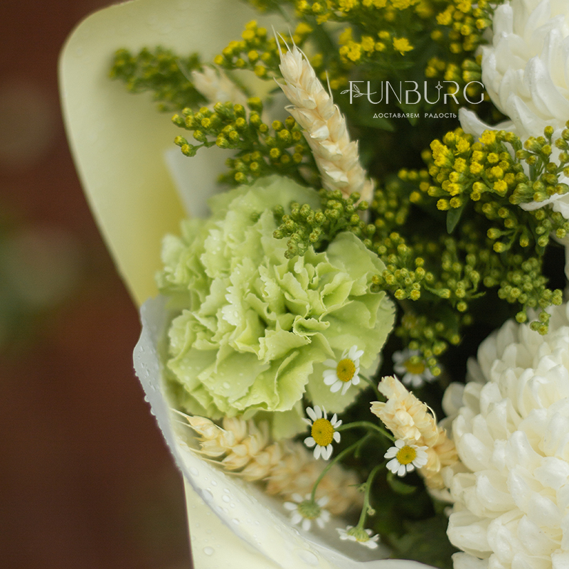 Невероятно свежий и нежный цветочный калейдоскоп из пышных сливочных хризантем, салатовых сортовых гвоздик, очаровательных ромашек и веточек солидаго.