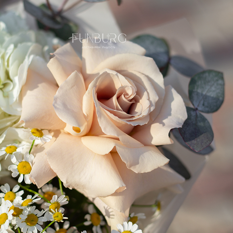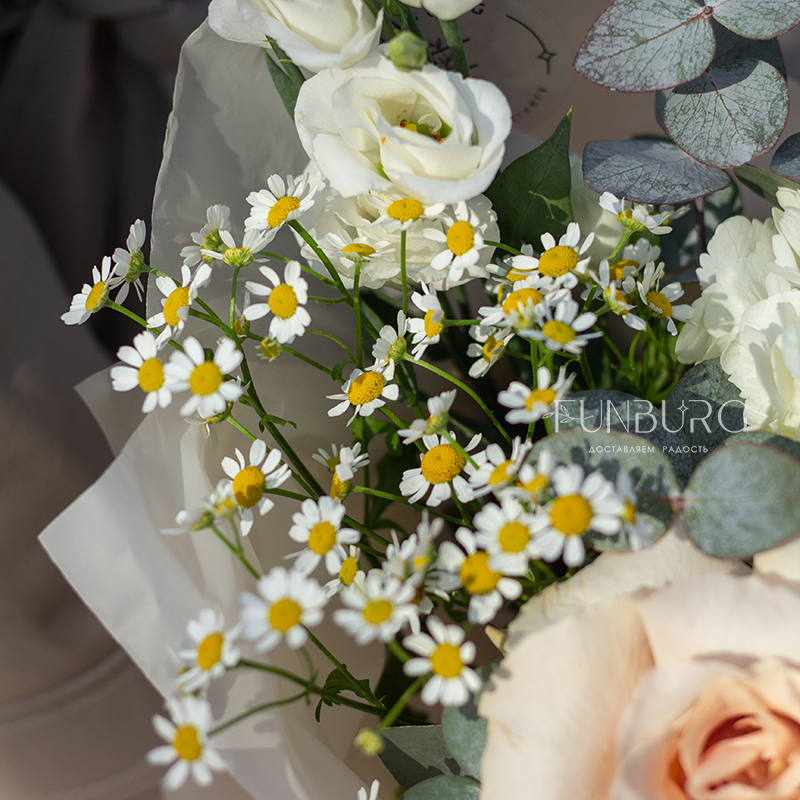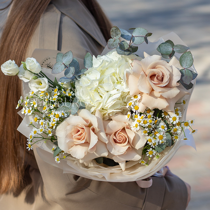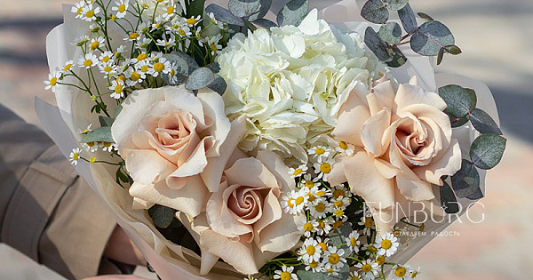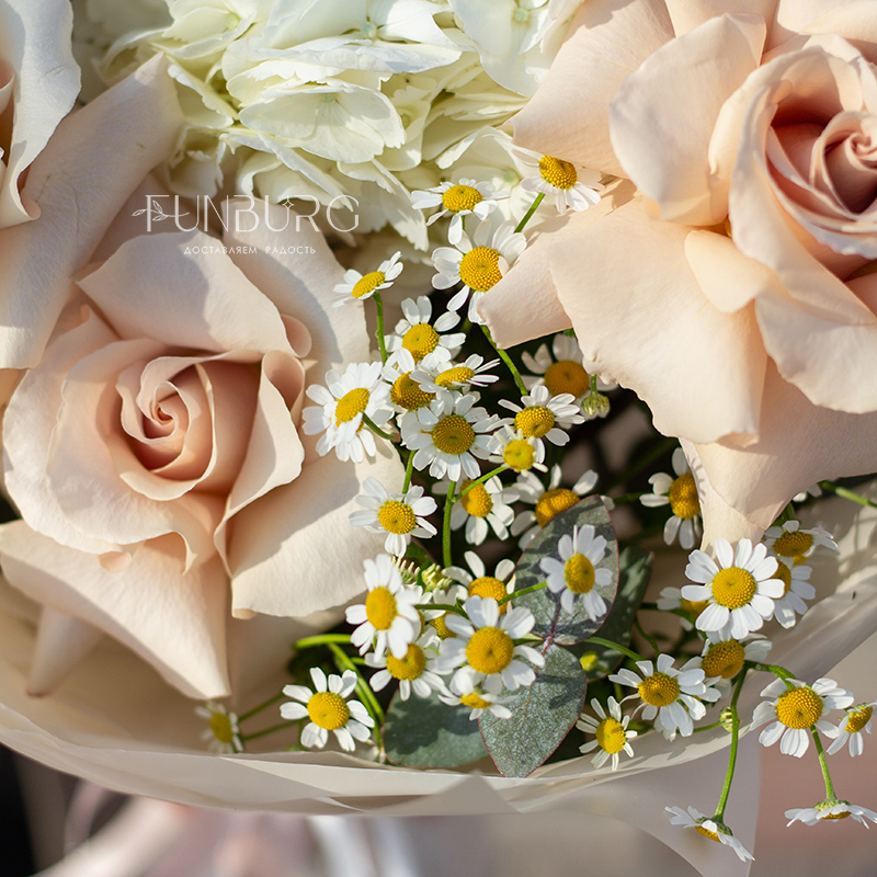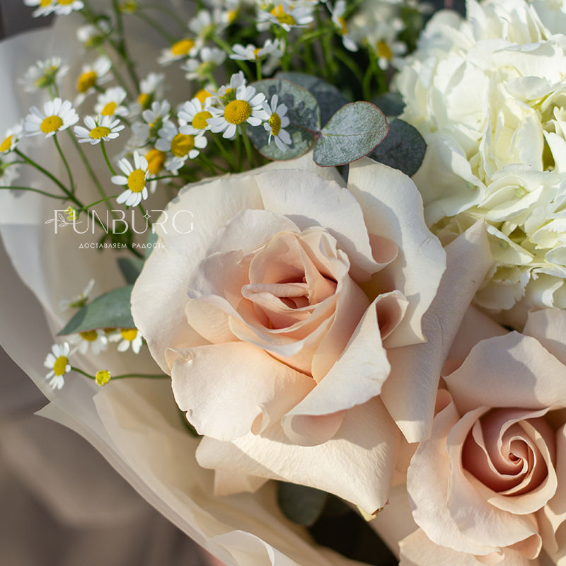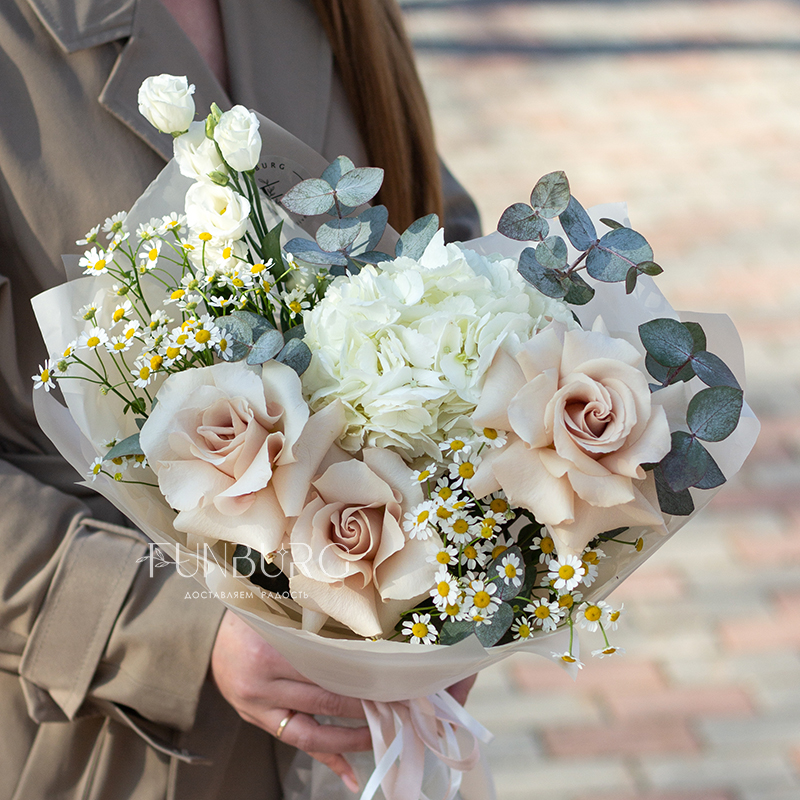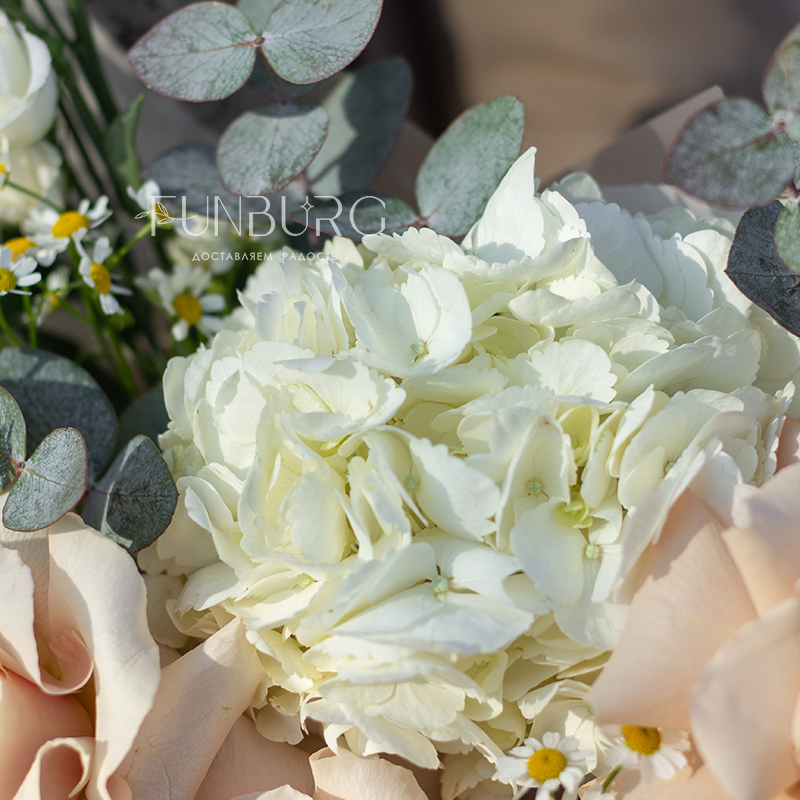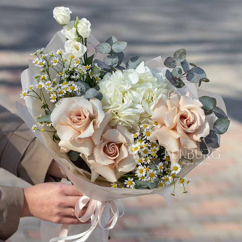 Небольшой воздушный букет с облаком белой гортензии, пышными кружевными французскими розами, трогательными ромашками и белой эустомой идеален для создания весенне-летнего настроения и нежных цветочных сюрпризов.