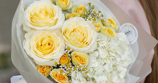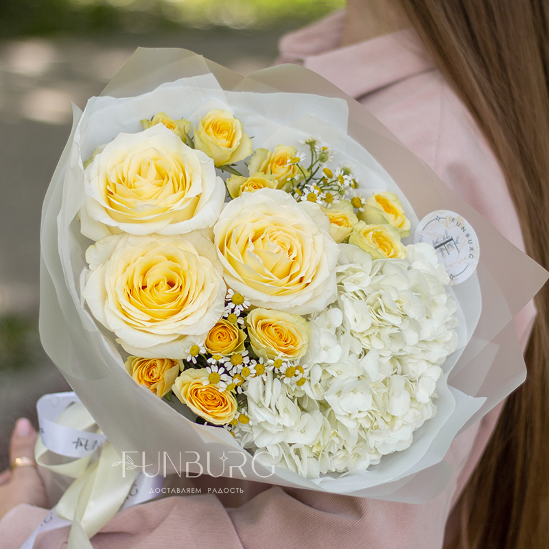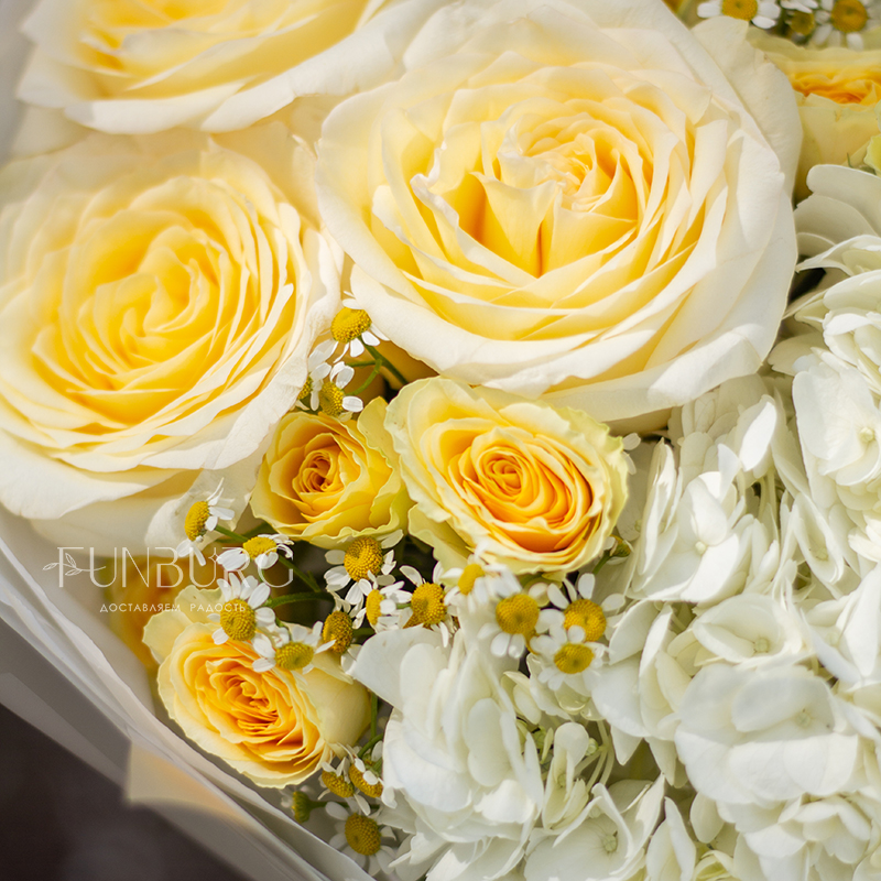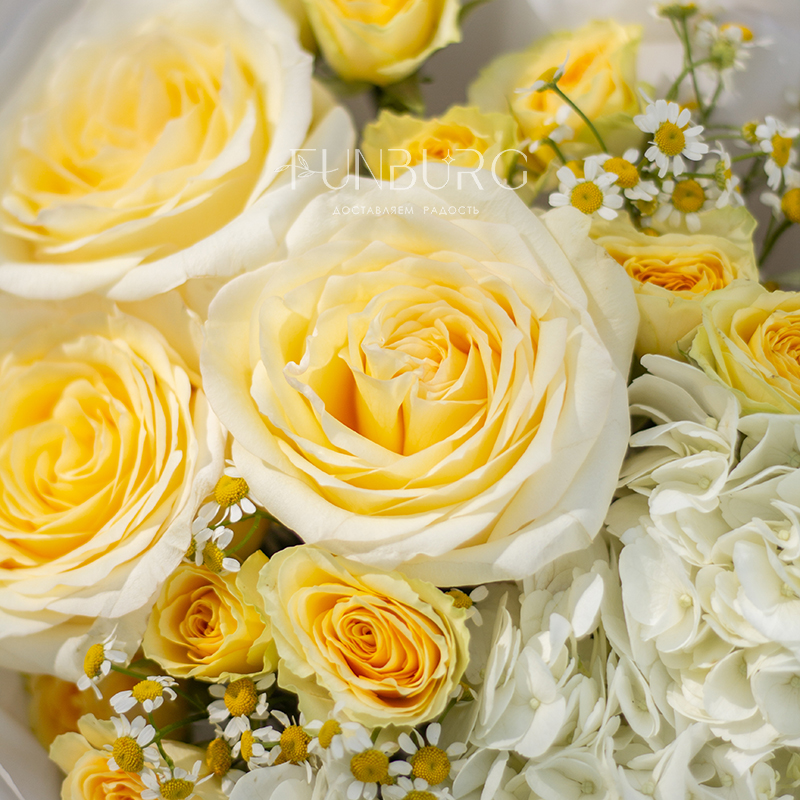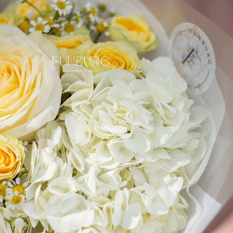 Мягкие сливочно-лимонные оттенки, воздушные лепестки гортензии, мягкие волны бесподобных роз Candlelight (они еще удивят вас красотой раскрытия крупных ароматных бутонов!) и очаровательные ромашки. Этот букет создан дарить радость и тепло самых искренних чувств.