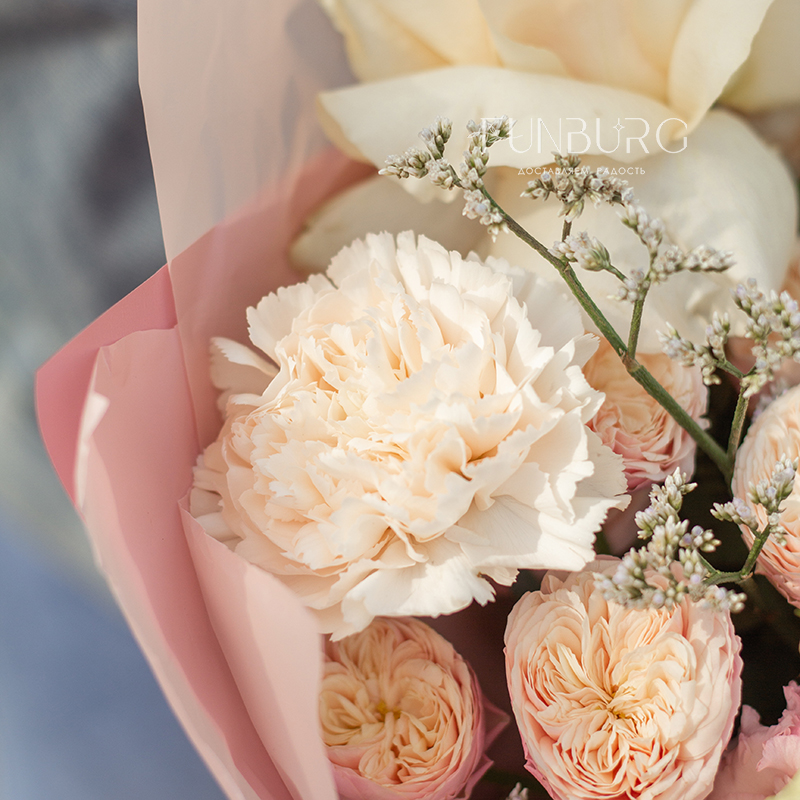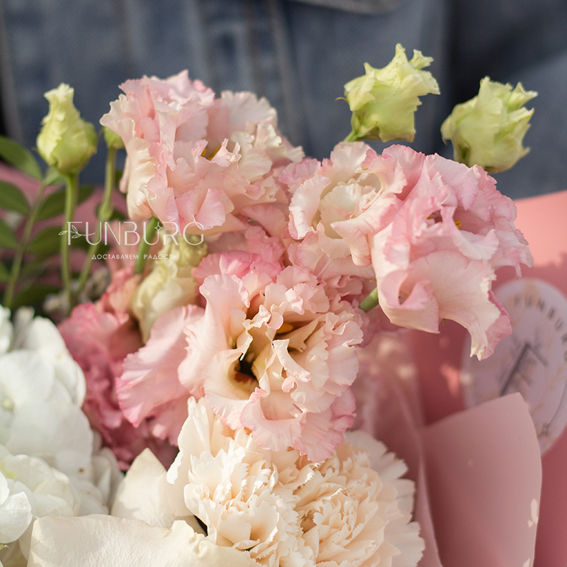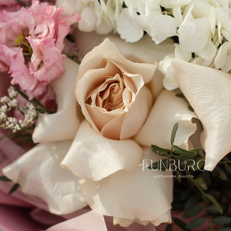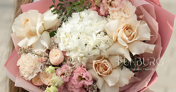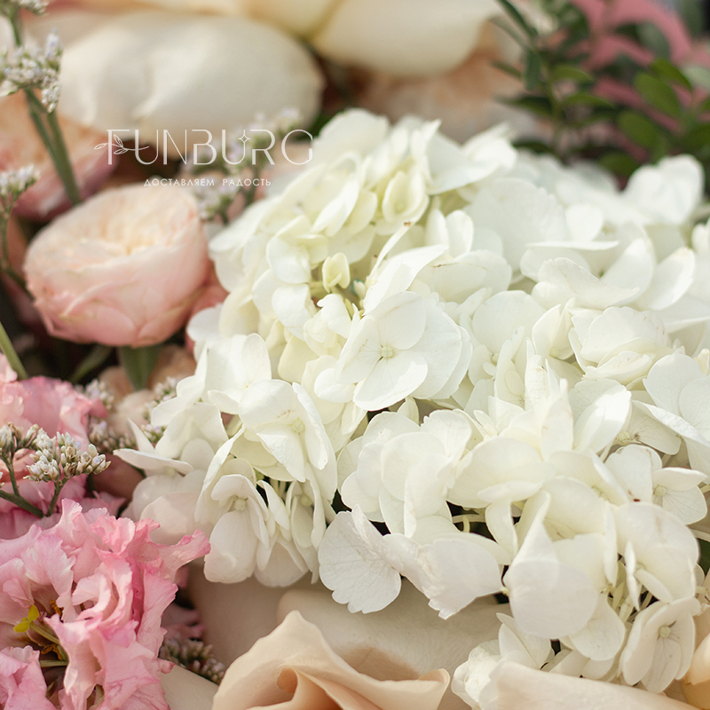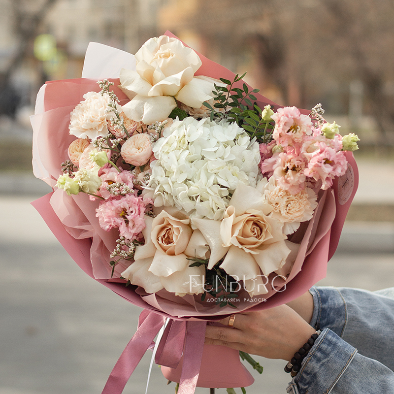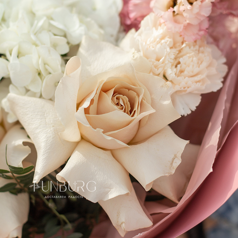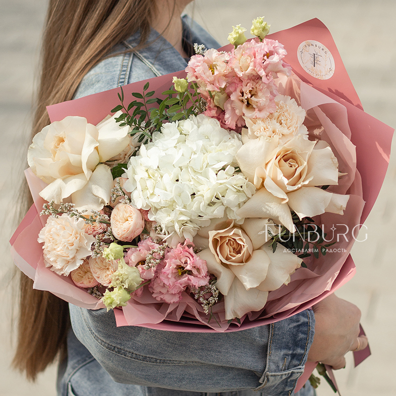 Нежнейший букет в сливочно-кремовых и пудровых оттенках, из воздушной гортензии, пионовидных кустовых роз, пышных роз сорта Quicksand, кружевных эустом и гвоздик. Для самых нежных и трогательных сюрпризов близким.