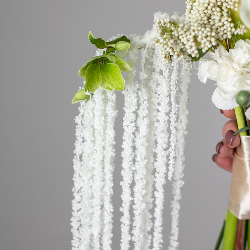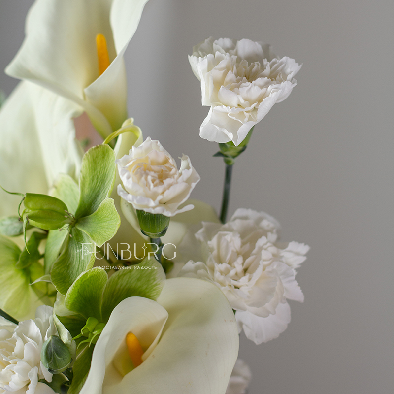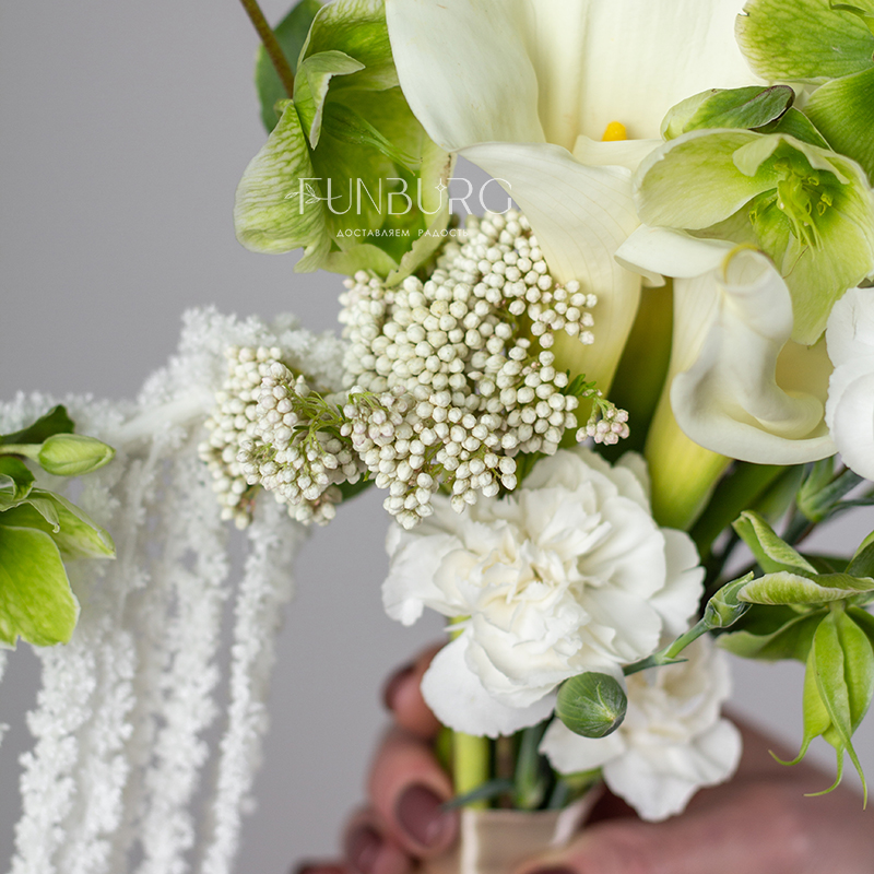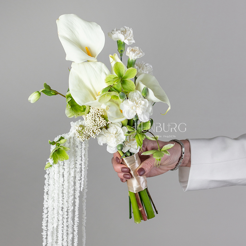 Элегантный и утонченный букет невесты из изящных калл, воздушных салатовых хелеборусов, трогательных кустовых гвоздик ниспадающего амаранта. Для минималистичных утонченных образов подойдет идеально.