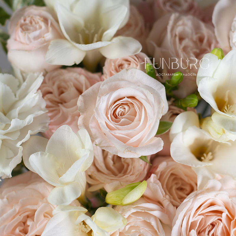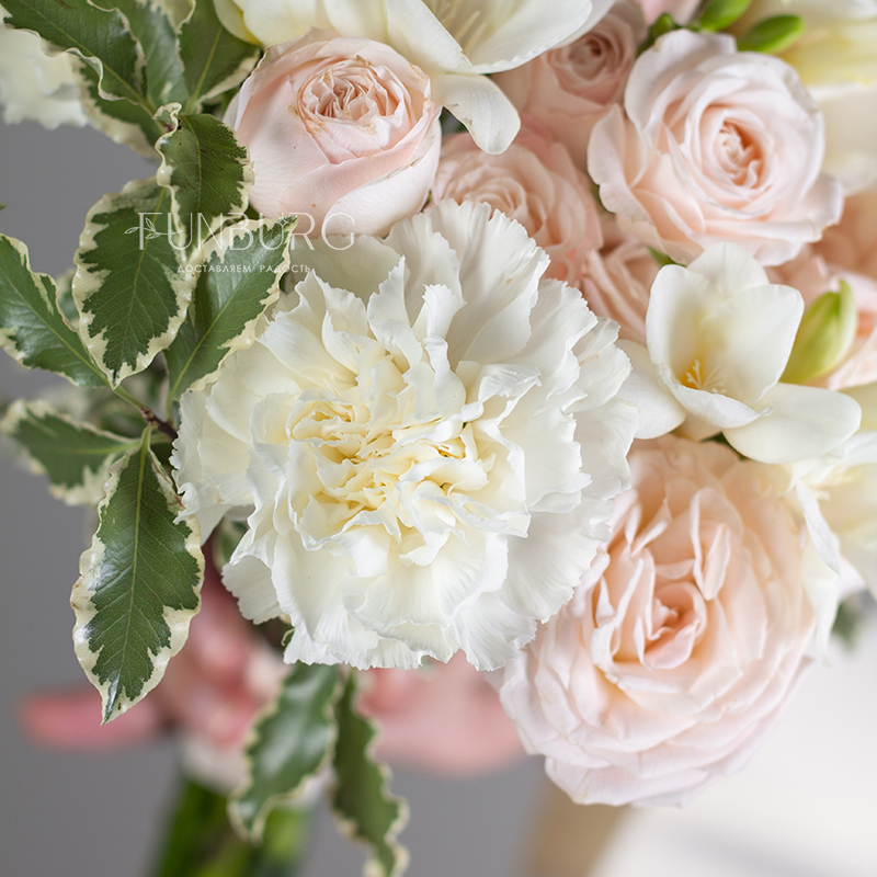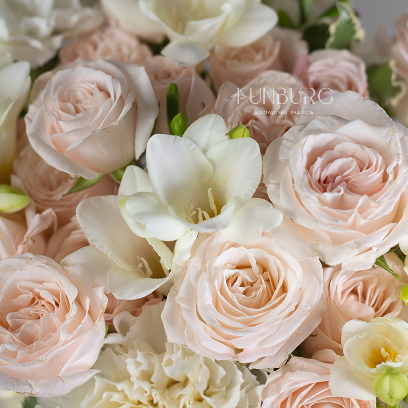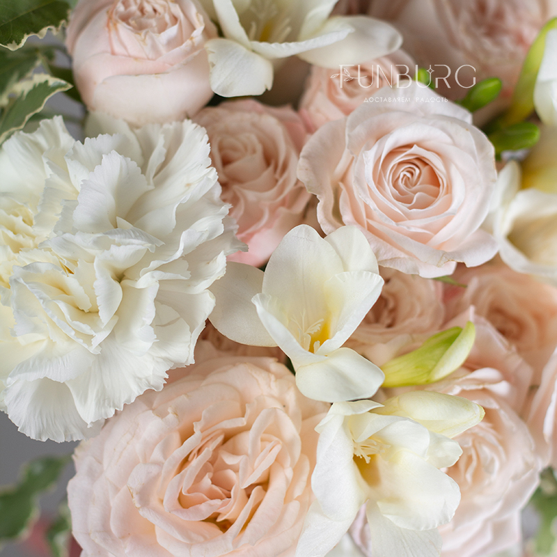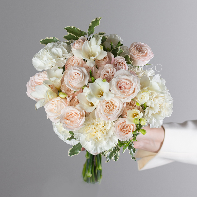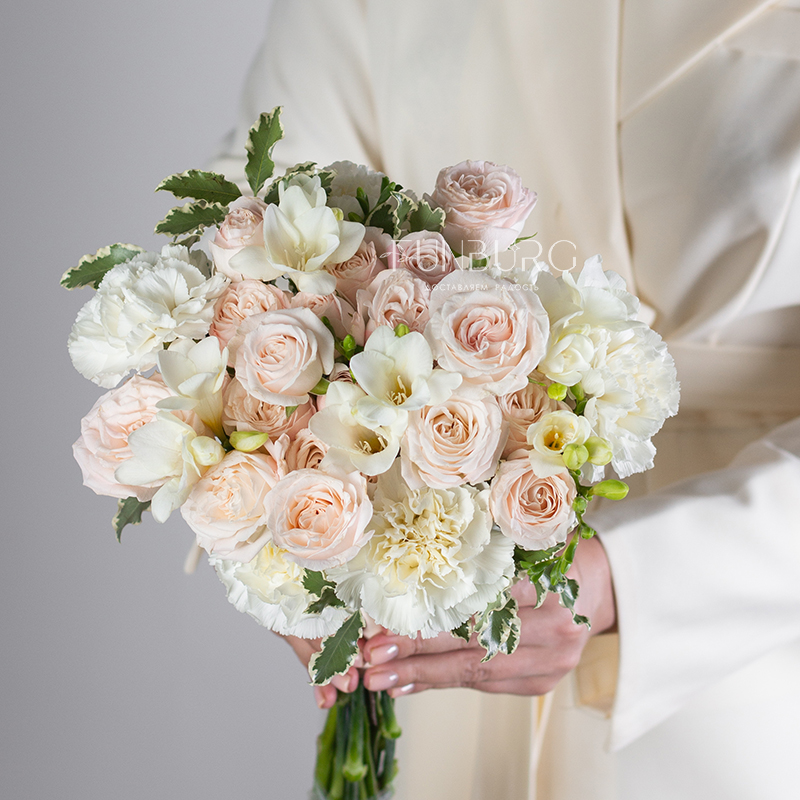 Нежный и сливочный, как самый нежный десерт и первые лучи мягкого летнего солнца в пушистых облаках! Этот букет из белоснежных эустом, сливочных роз, персиковых диантусов и кустовых роз станет идеальным дополнением утонченного образа невесты.