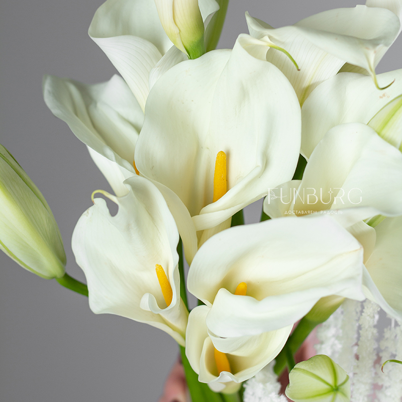 Элегантный и утонченный букет невесты из изящных калл, лилиий и ниспадающего амаранта.