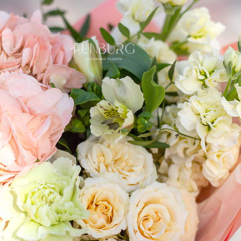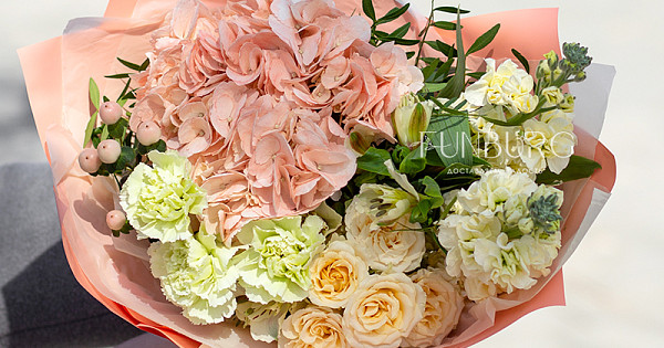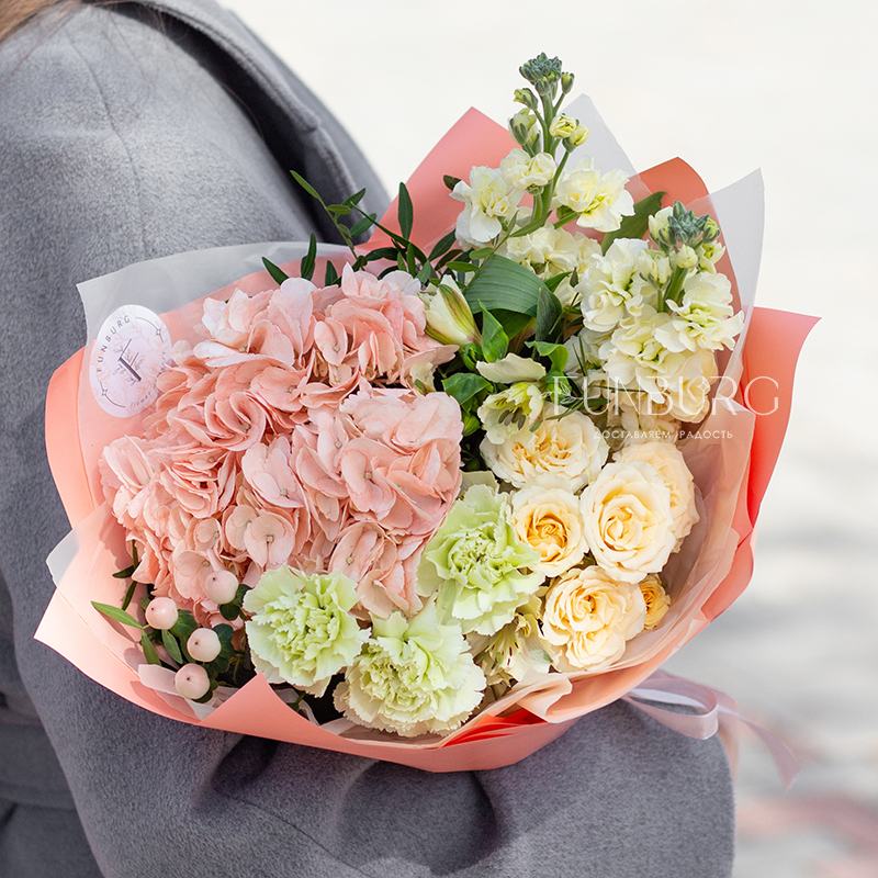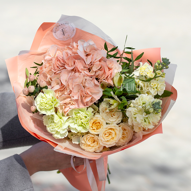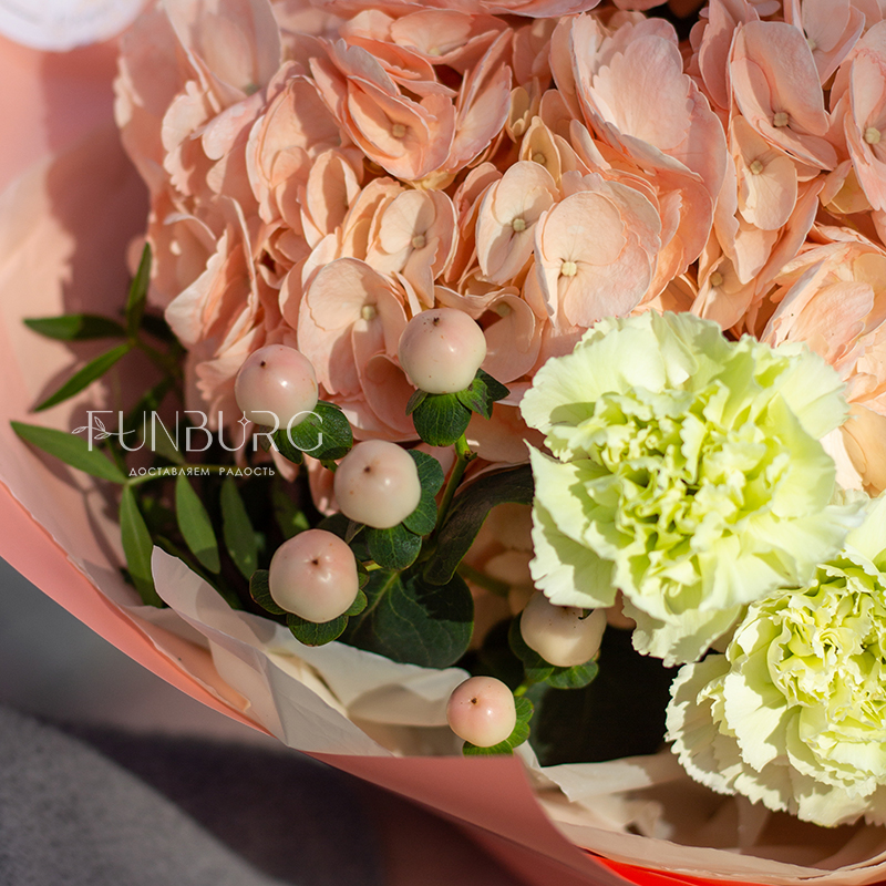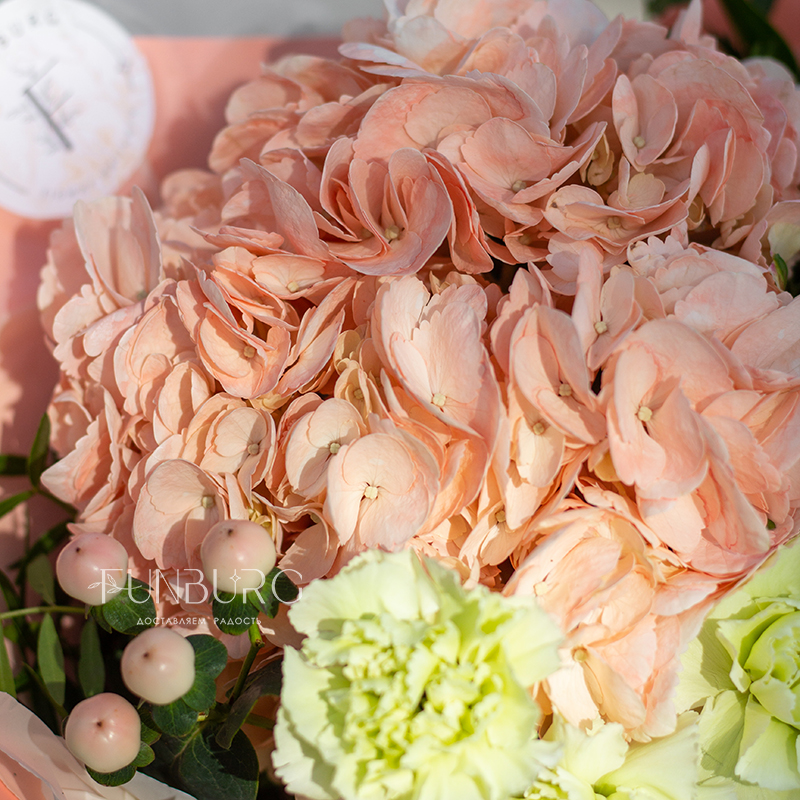 Персиковая гортензия, нежно-желтая кустовая роза, салатовые гвоздики, пряная маттиола и ягодки гиперикума - этот букет напоминает жаркий летний день в персиковом саду, где витают теплые ароматы цветов и фруктов.