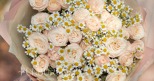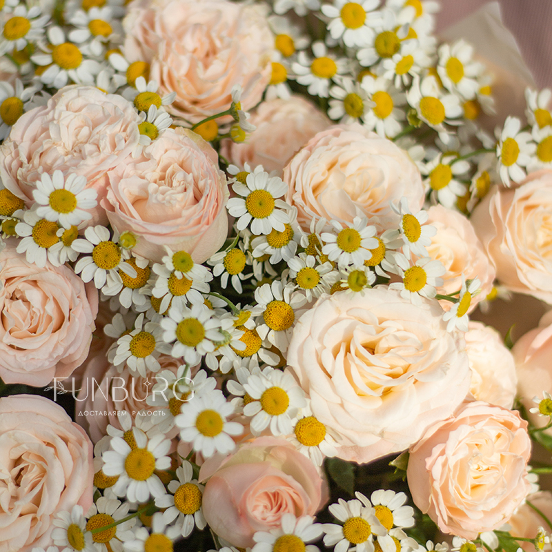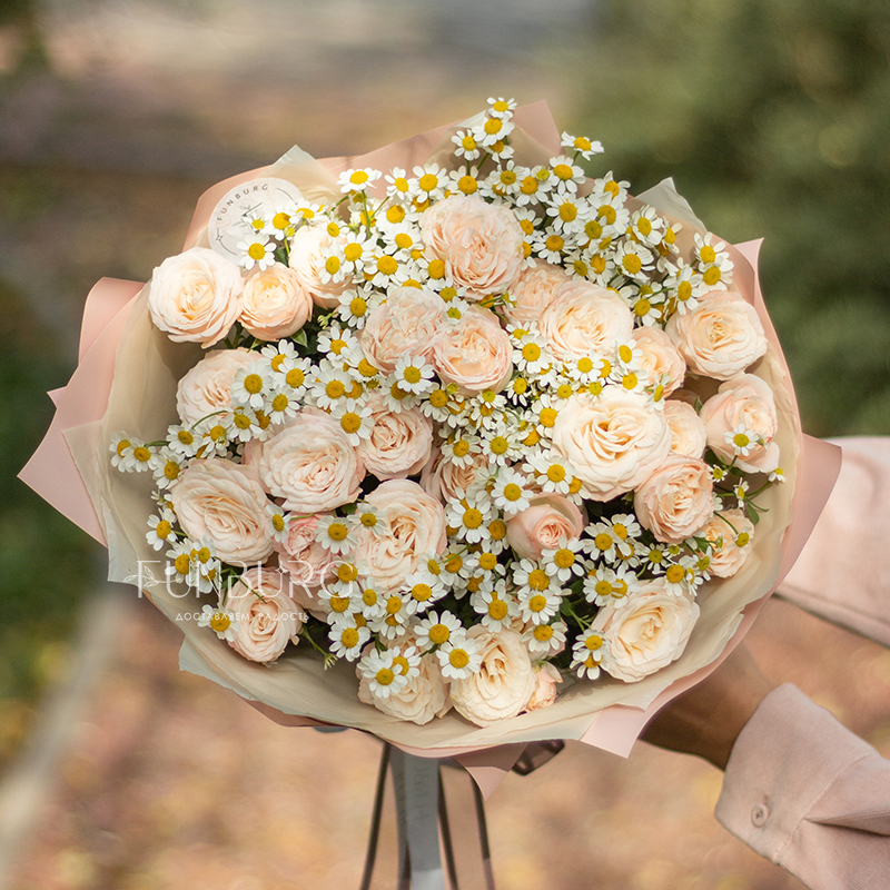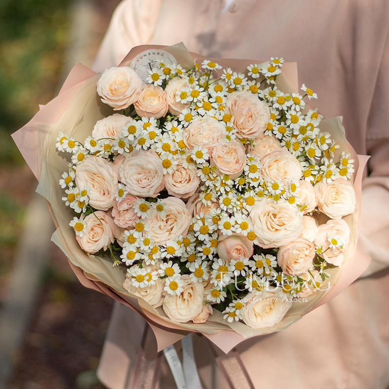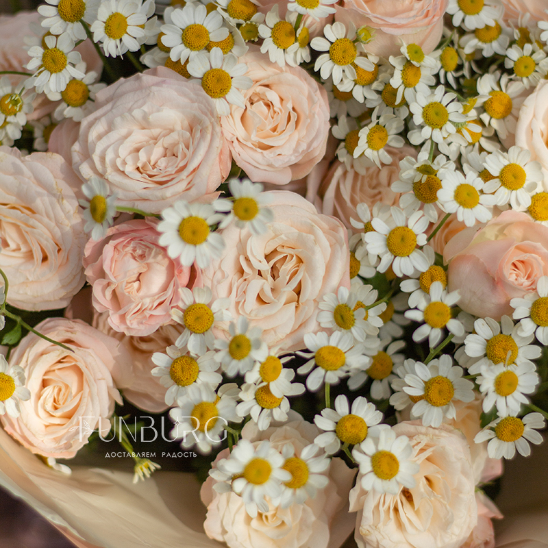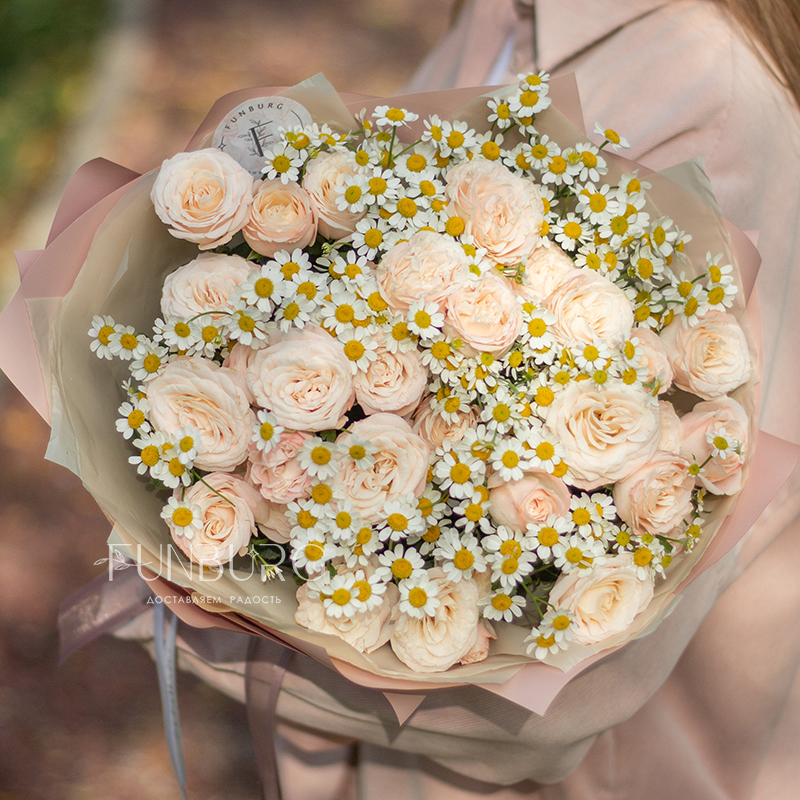 Нежнейший дуэт из пудровых пионовидных роз и трогательных ромашек как напоминание о самых нежных и искренних чувствах.