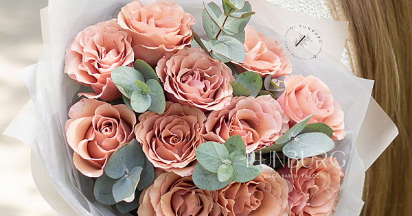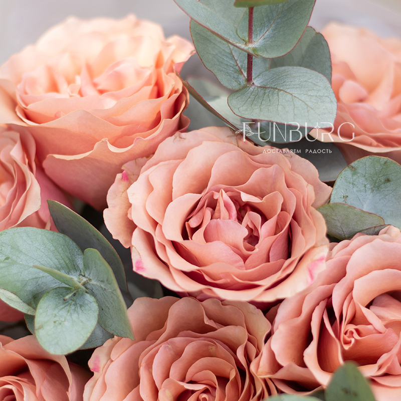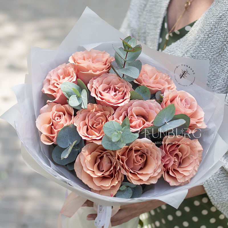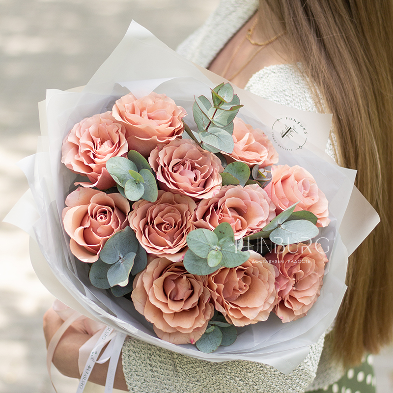 Уютный теплый букет из удивительных роз красивого оттенка шоколадного мусса, оттенённых листиками серебристого эвкалипта, в матовой воздушной полупрозрачной упаковке.