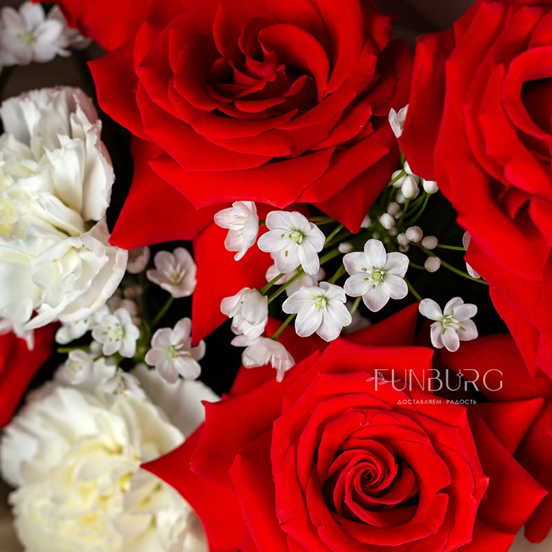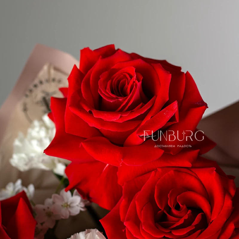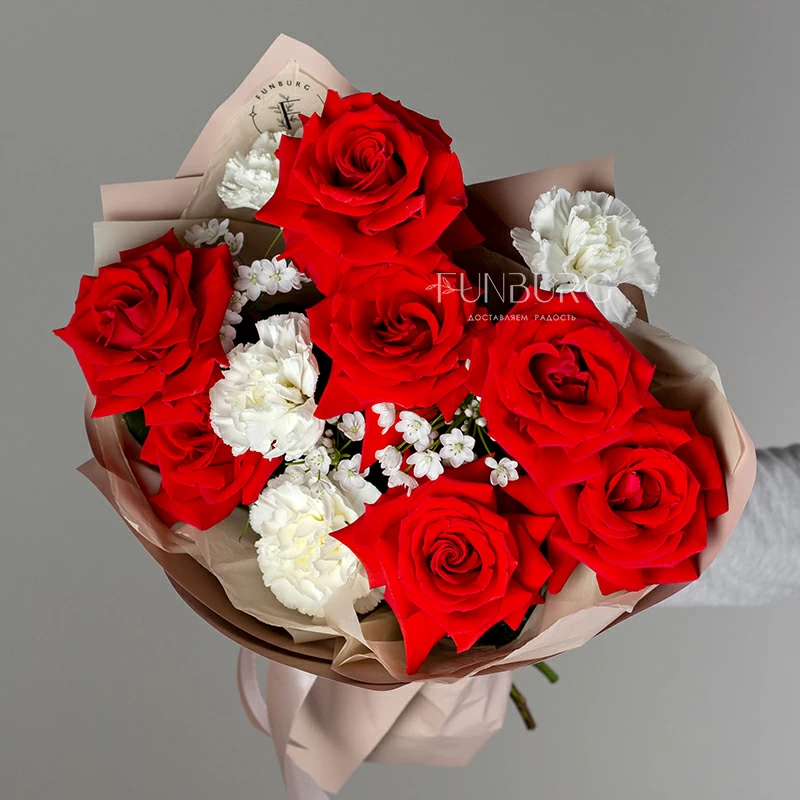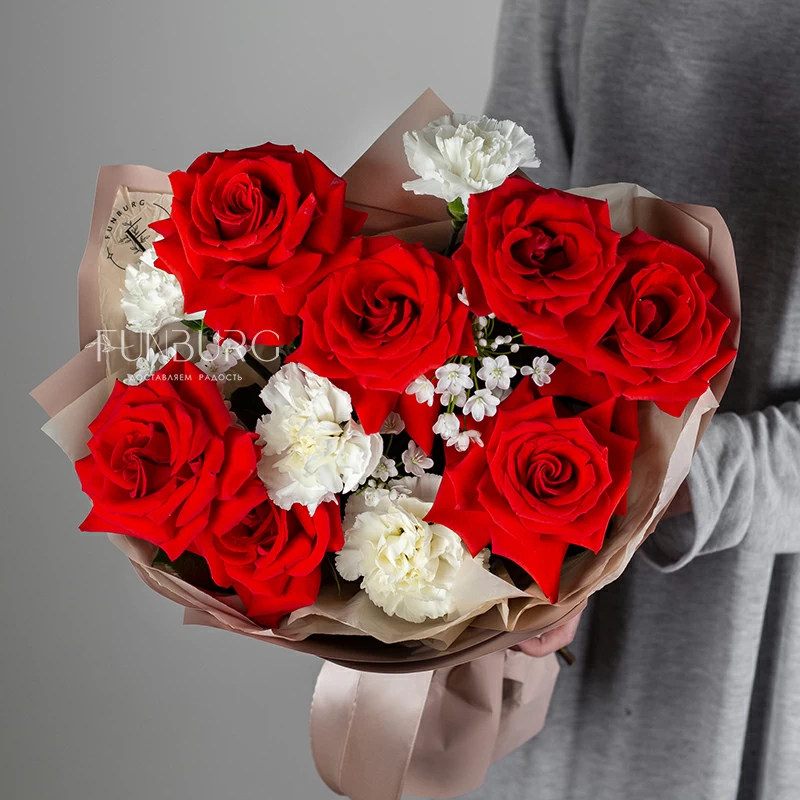Невероятно эффектный букет с алыми французскими розами сорта Nina, контрастными белыми гвоздиками и трогальными цветочками аллиума в спокойной матовой упаковке создан удивлять и передавать самые сильные и искренние чувства!