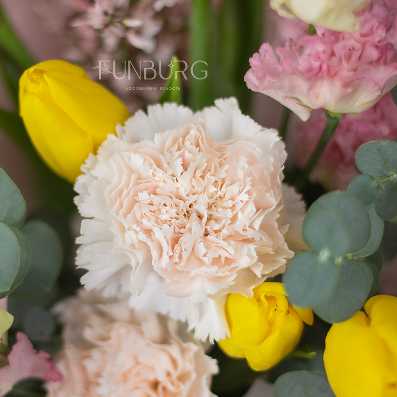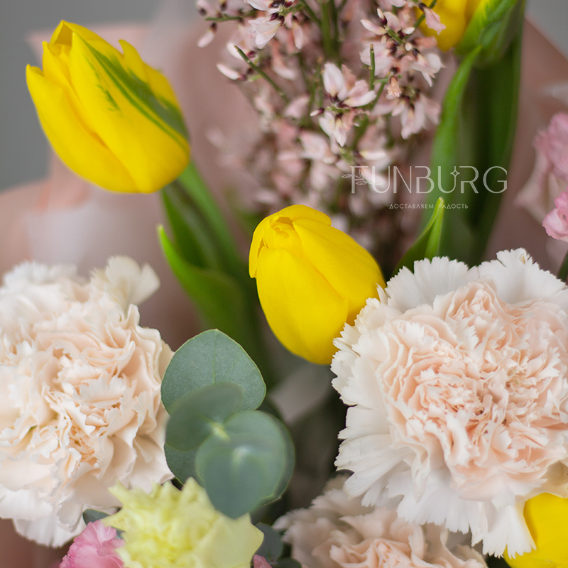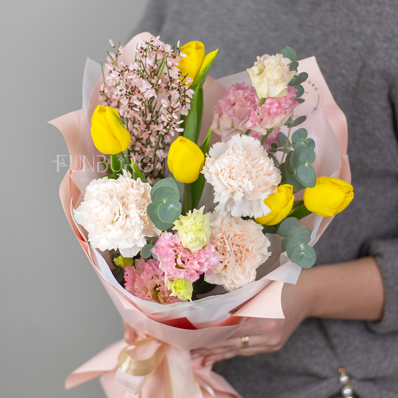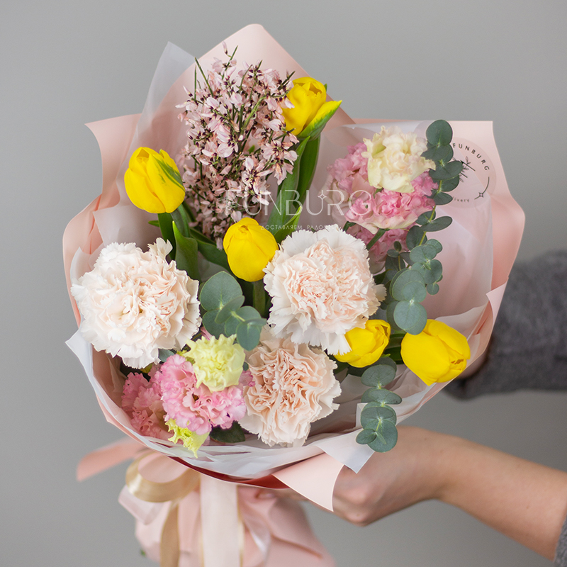 Удивительный букет из солнечных тюльпанов, кружевной розовой эустомы, зефирных гвоздик и ароматной воздушной дженисты. Утонченный, нежный, гармоничный и романтичный.