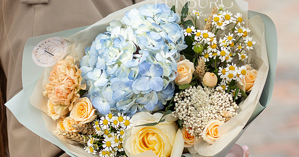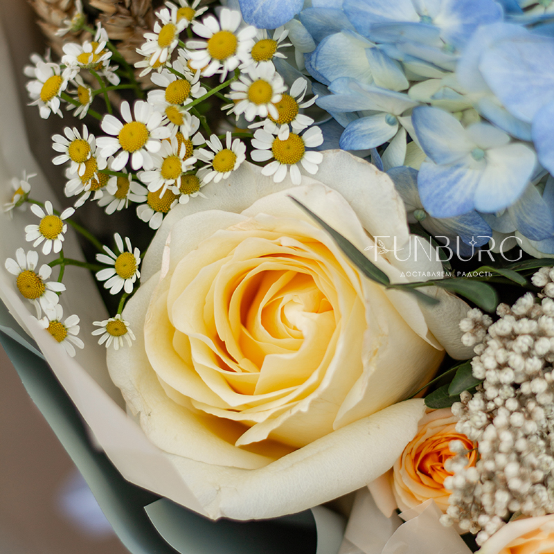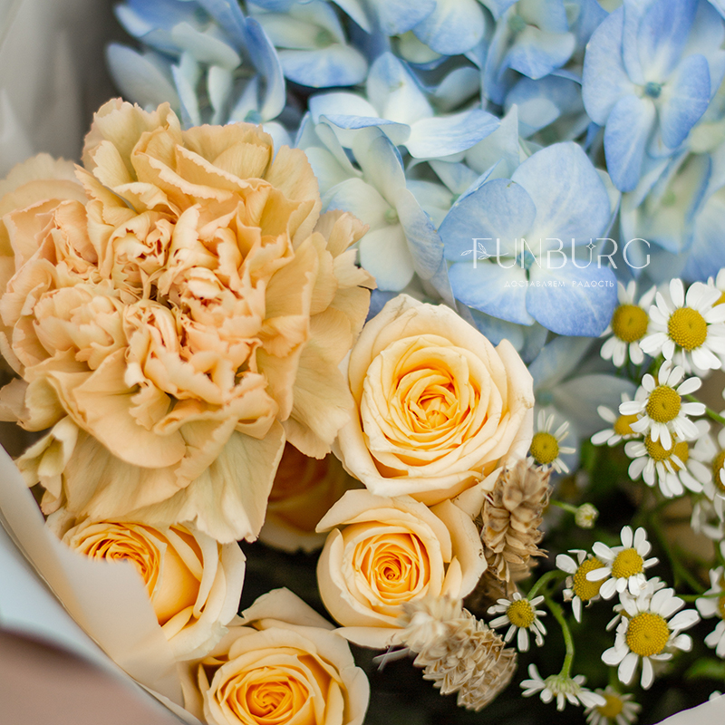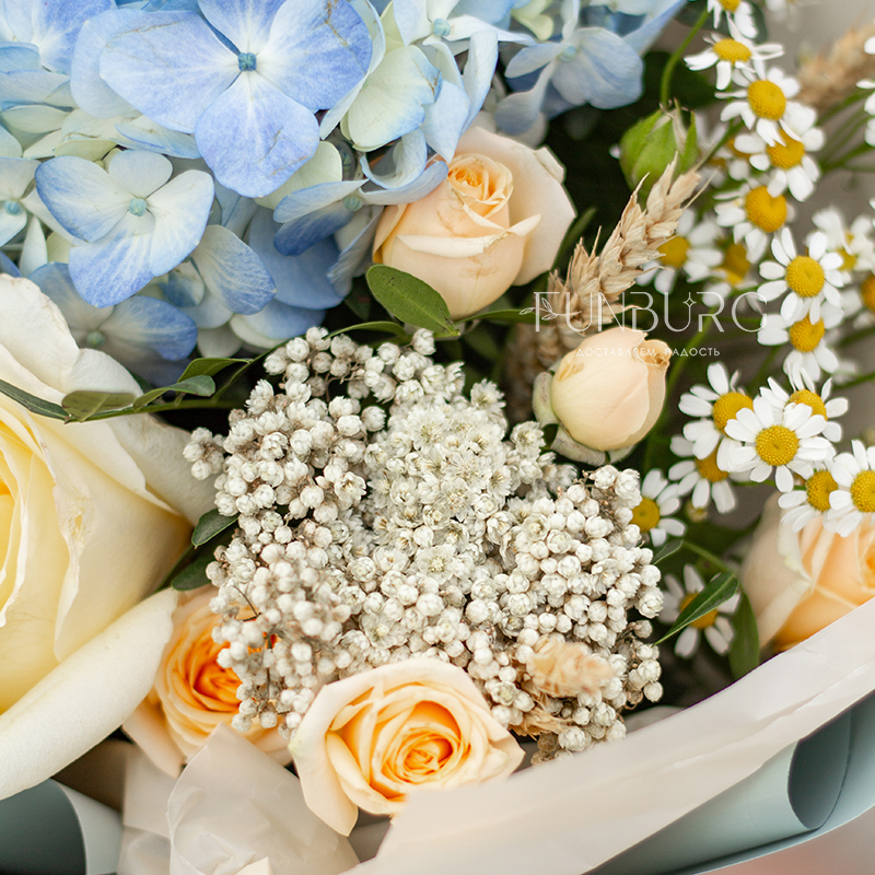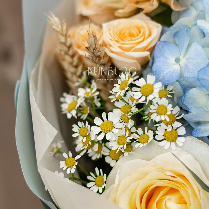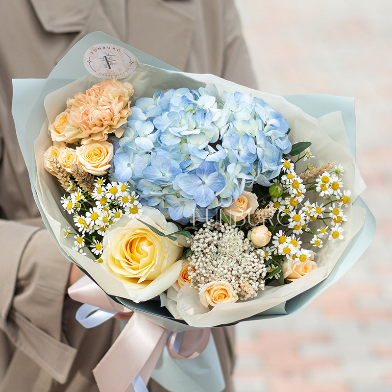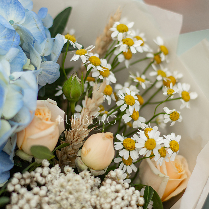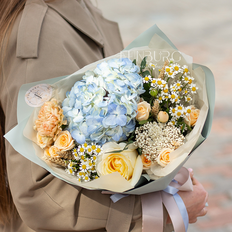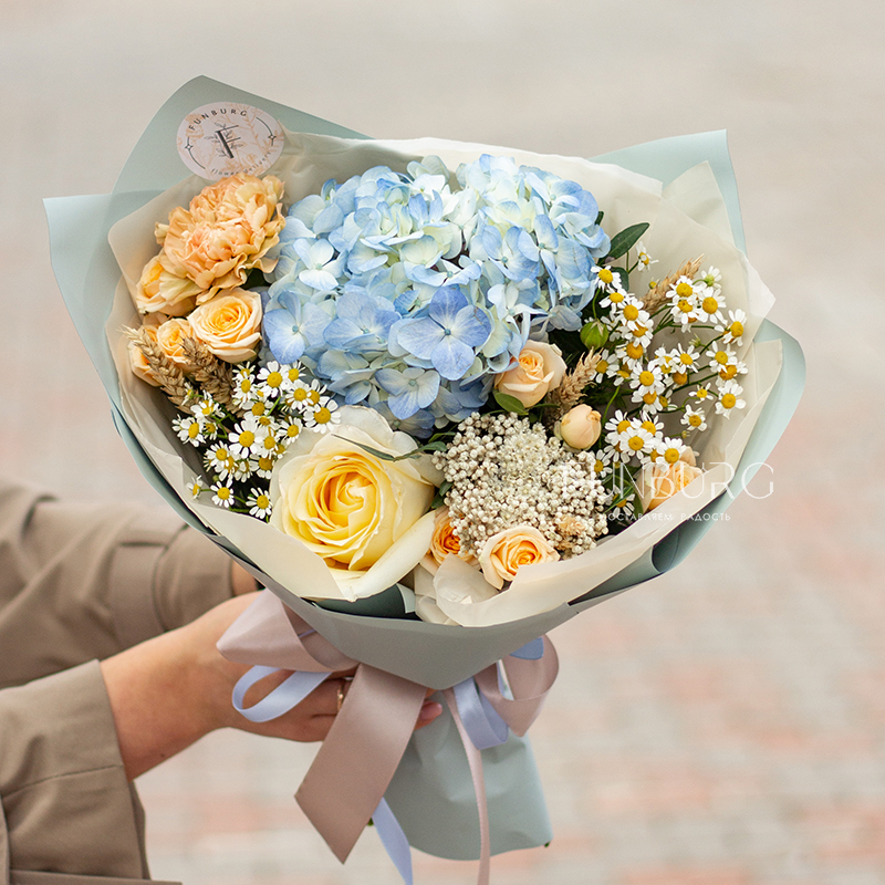 Воздушная голубая гортензия в объятиях сливочной сортовой розы, ромашек, персиковых кустовых роз и диантуса, уютных колосков пшеницы и жемчужинок озотамнуса. Букет, напоминающий прогулку по цветущему полю к чистому озеру в знойный летний день!