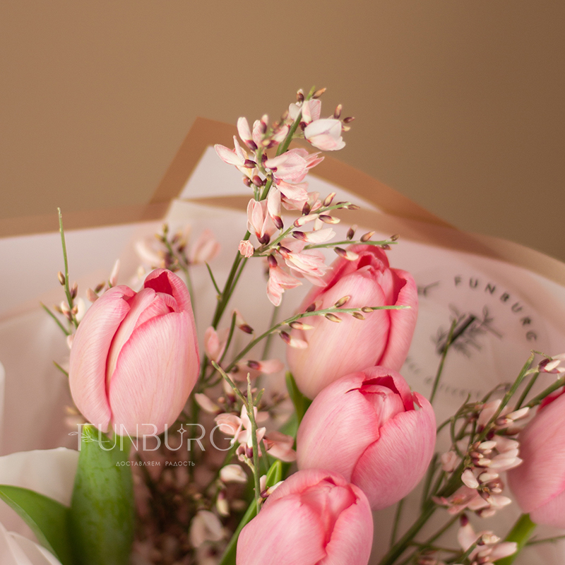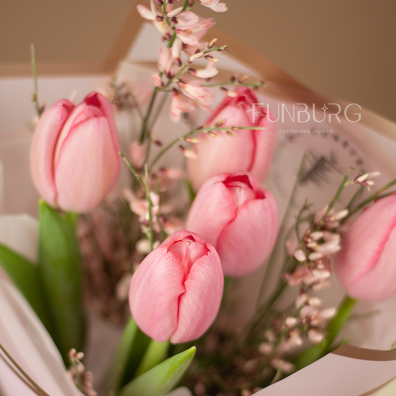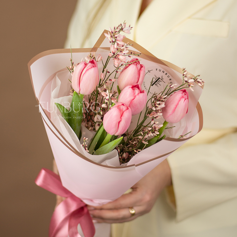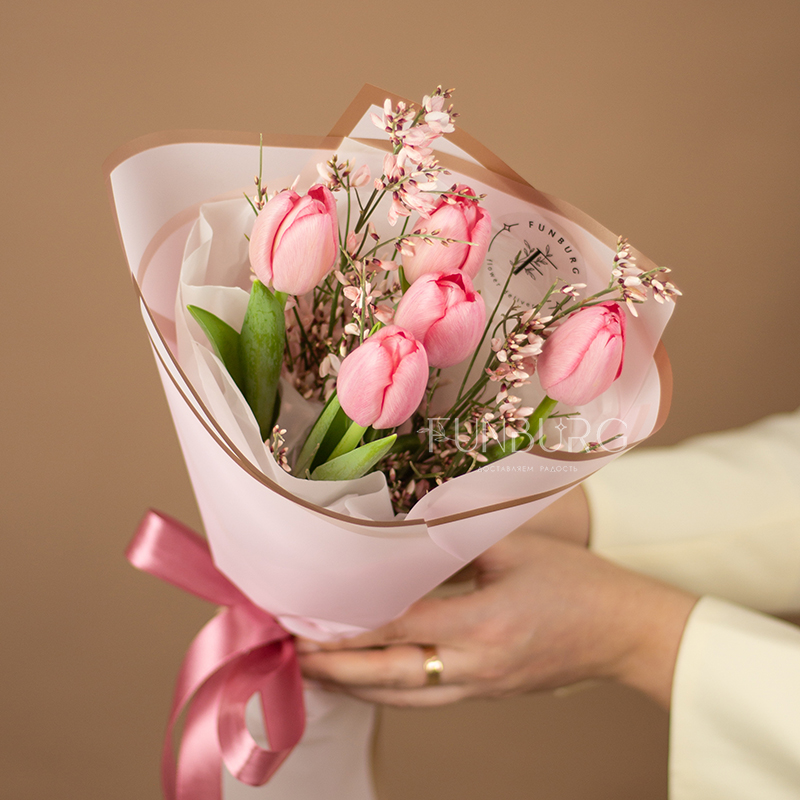 Миниатюрный букет из свежих нежно-розовых тюльпанов и воздушной ароматной дженисты, оформленных в стильную матовую пленку, подарит тепло и весеннее настроение!
