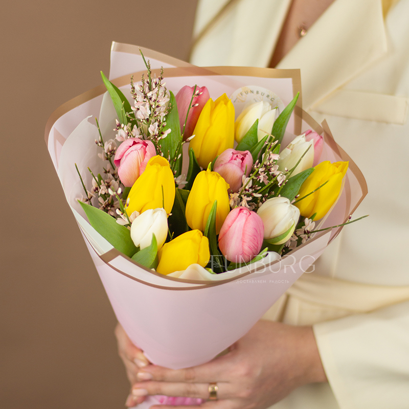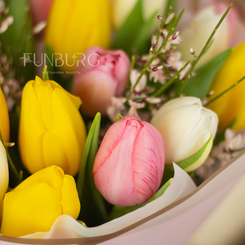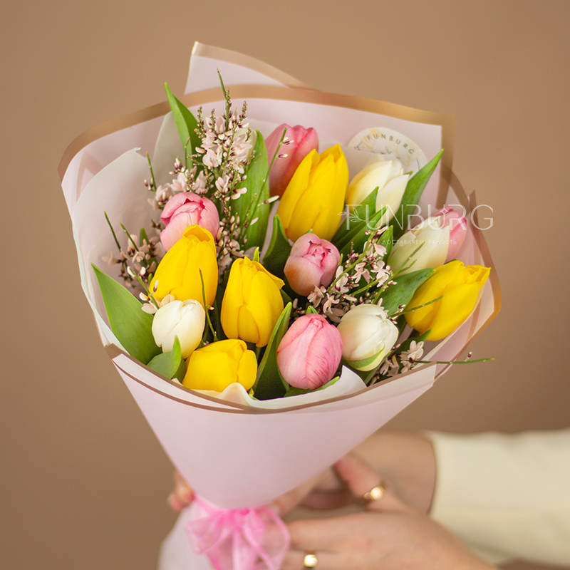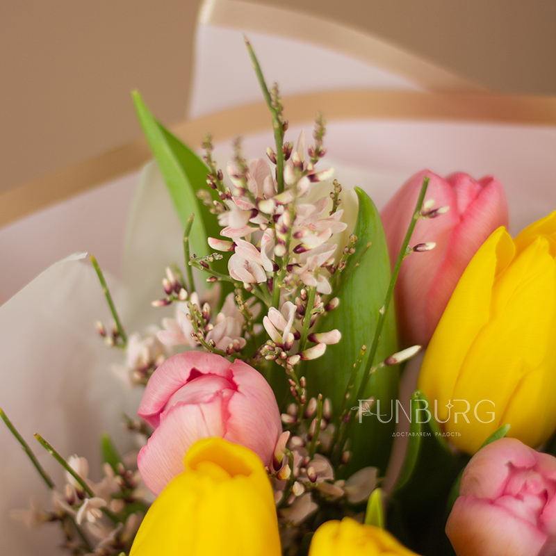 Яркий и одновременно нежный, как весеннее солнце, букет из свежих нежно-розовых, желтых и белых тюльпанов и воздушной ароматной дженисты, оформленных в стильную матовую пленку, создан дарить тепло и весеннее настроение!