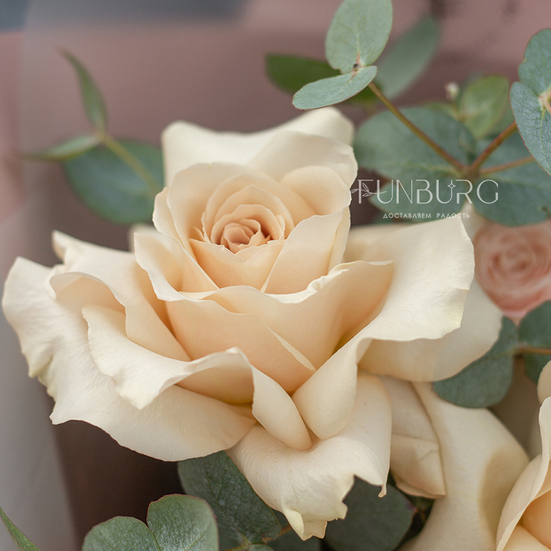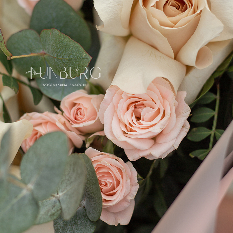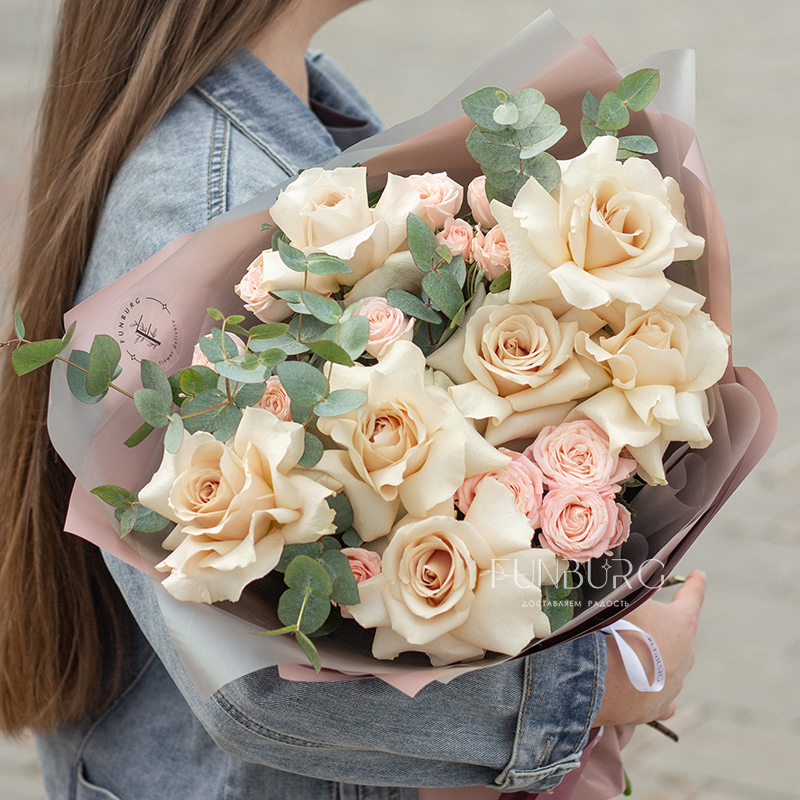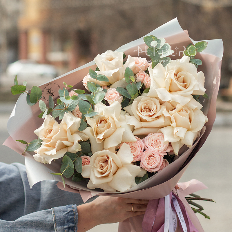 Нежное притягательное сочетание немного винтажных французских бежево-пудровых роз, облаков гортензии, кружевных белоснежных диантусов и серебристо-зеленых листиков эвкалипта в нежной упаковке под цвет букета. Для ценителей непростых изысканных сочетаний.
