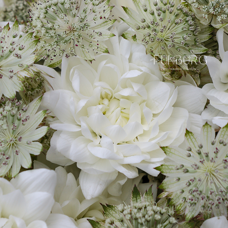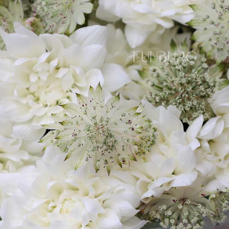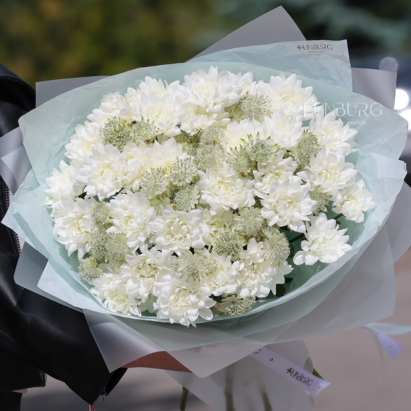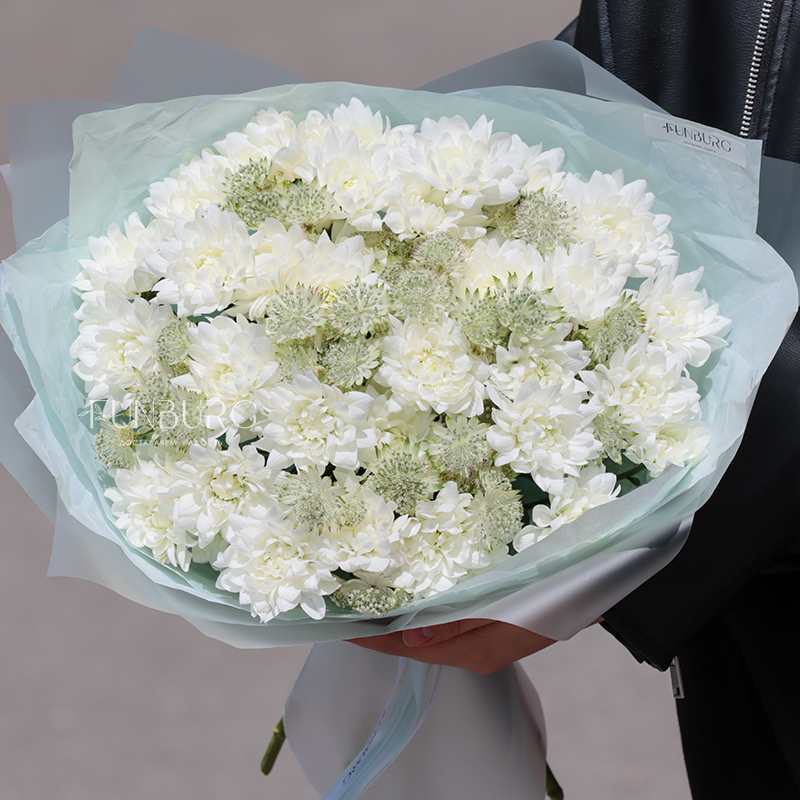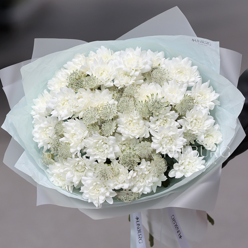 Облако из белых пушистых хризантем и нежной воздушной астранции в легкой матовой упоковке, подчеркивающей красоту цветов.
