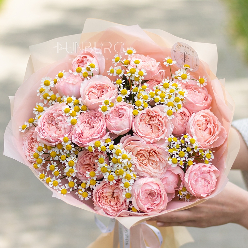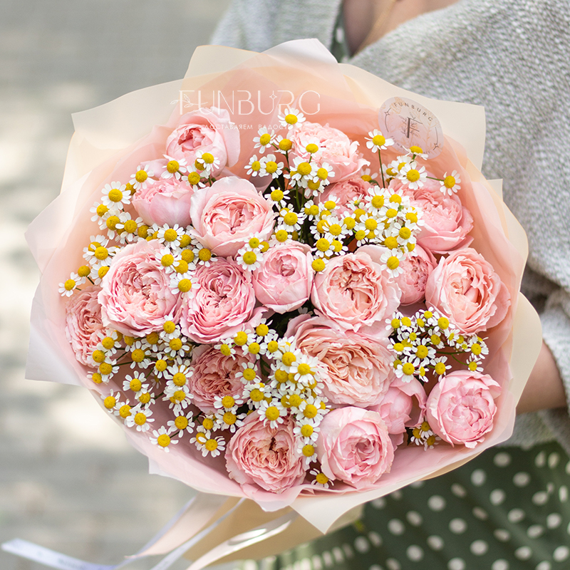Самое летнее и романтичное сочетание: трогательные ромашки и восхитительные пионовидные розы сорта Джульетта в воздушной матовой пленке. Идеально для летних цветочных сюрпризов.
