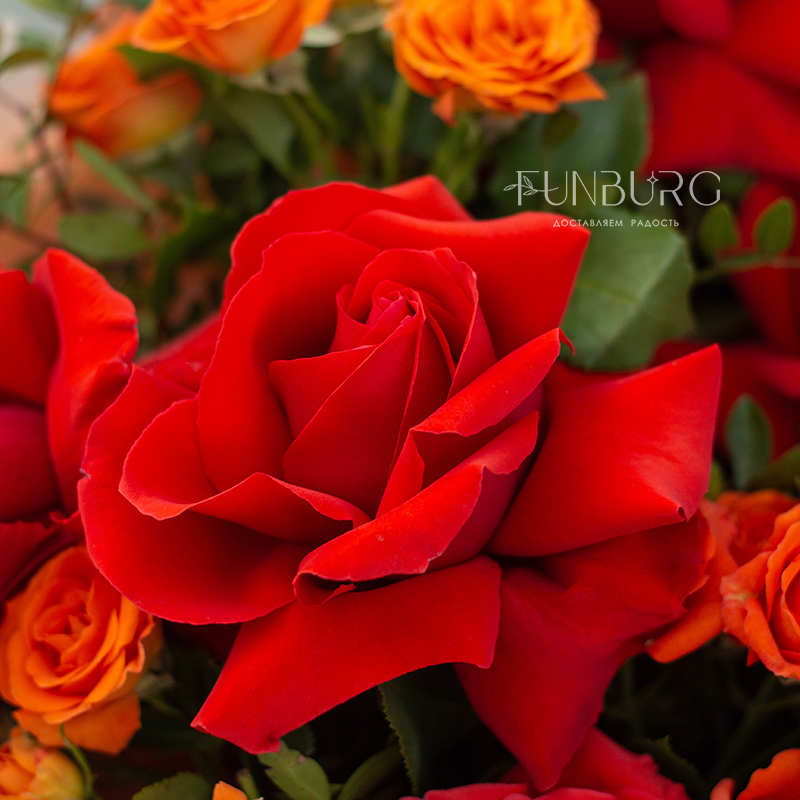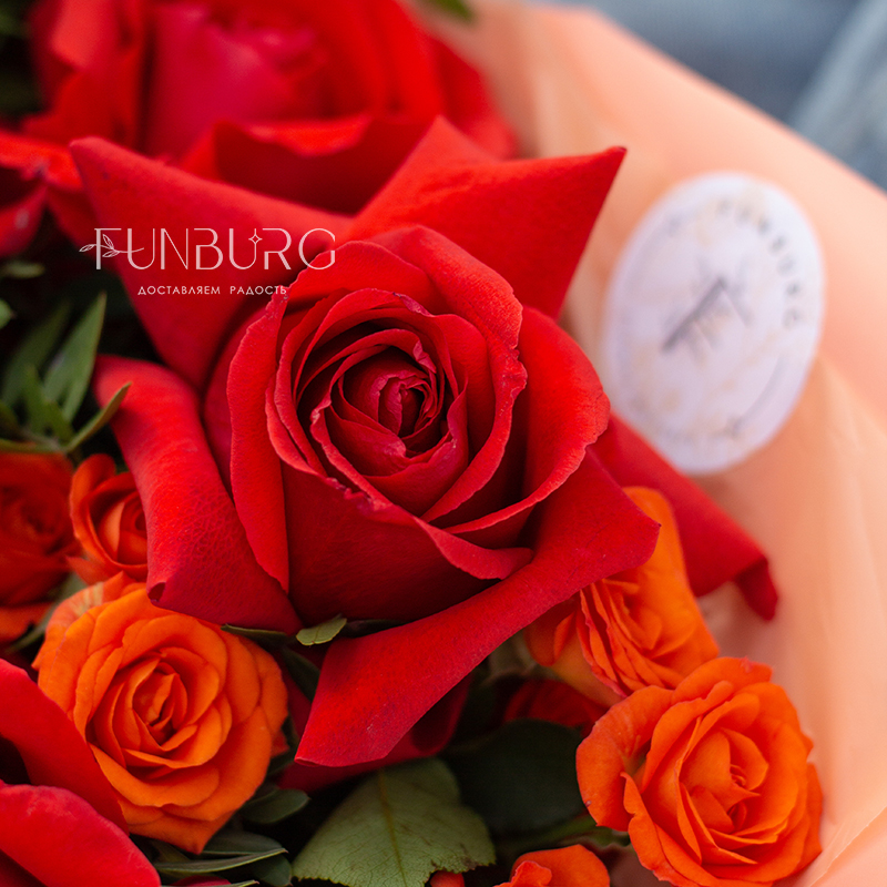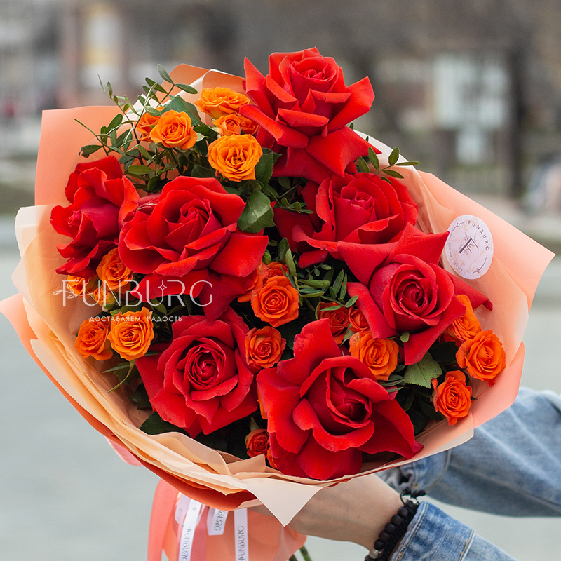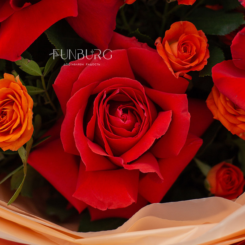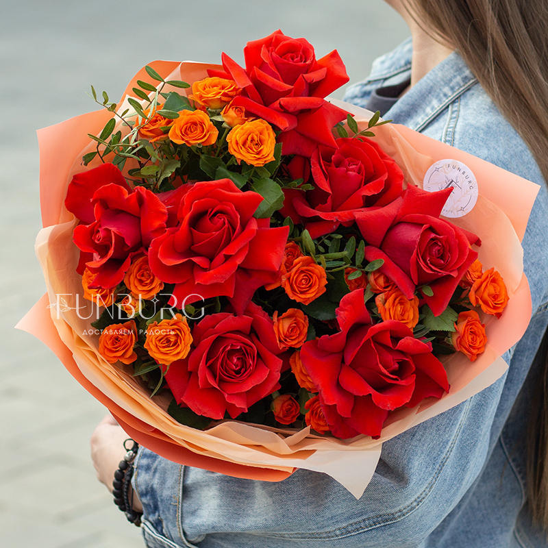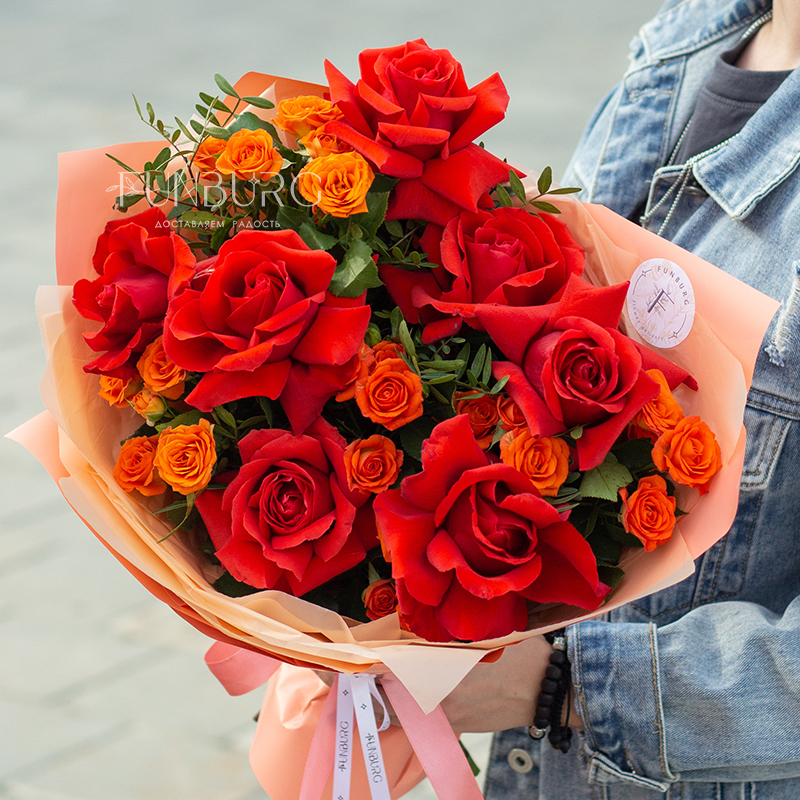 Яркий запоминающийся букет из алых французских роз сорта Nina и огненно-оранжевых кустовых роз.