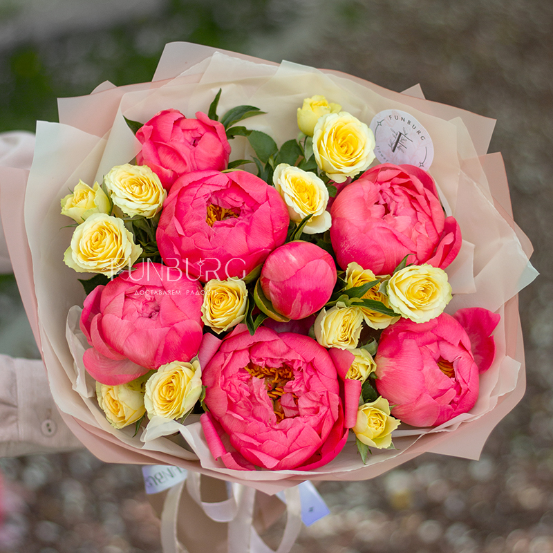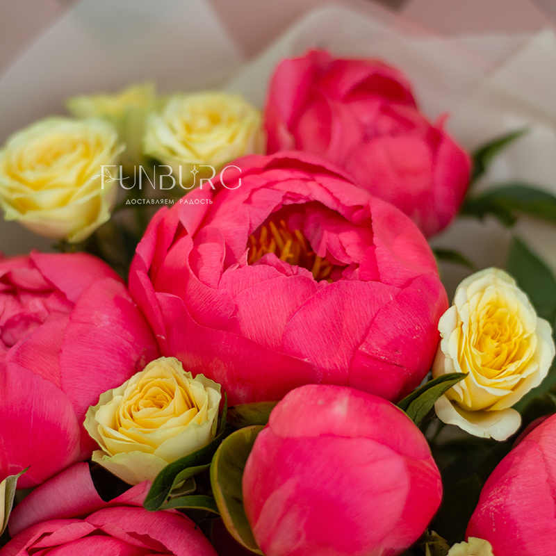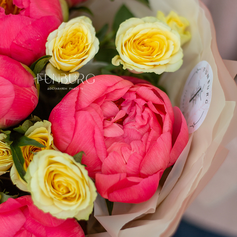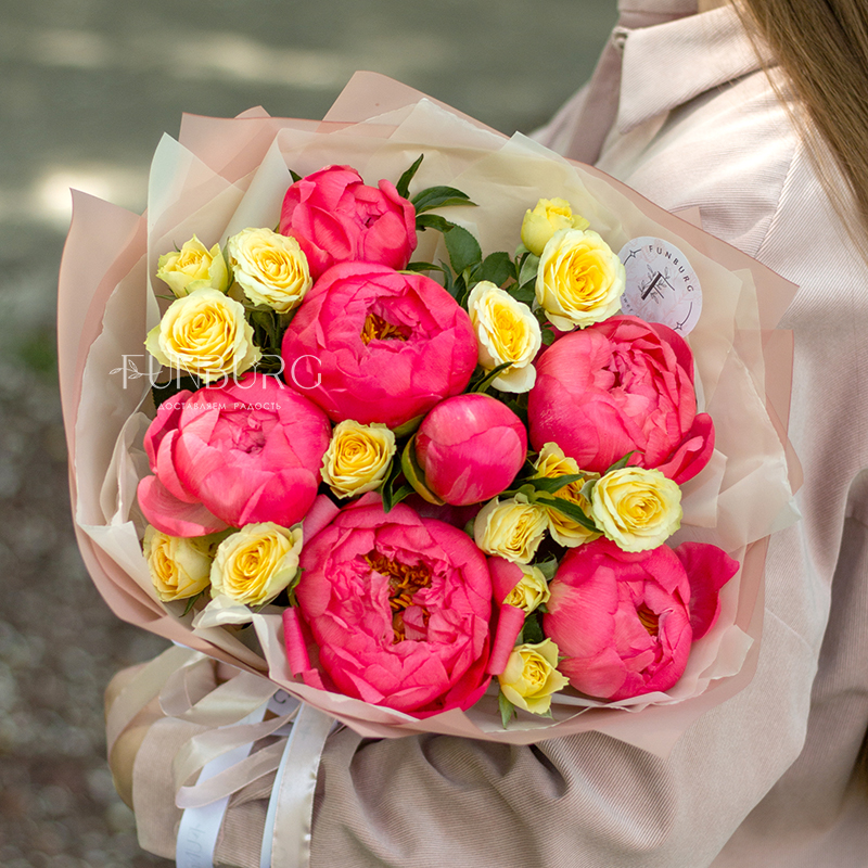 Волшебный яркий букет из коралловых пионов и сочных лимонных кустовых роз. А волшебным мы назвали букет не просто так: в течение нескольких дней яркие коралловые бутоны раскрываются и становятся нежно-персиковыми! Магия ближе, чем кажется ;)