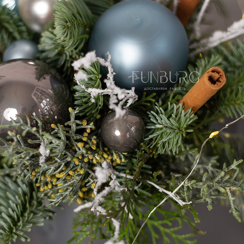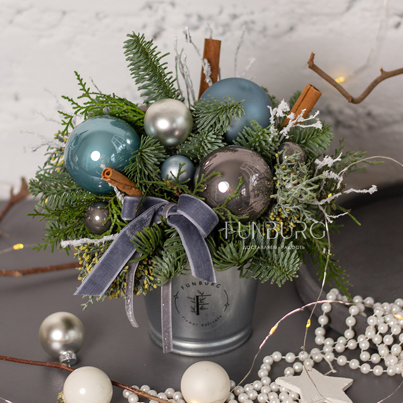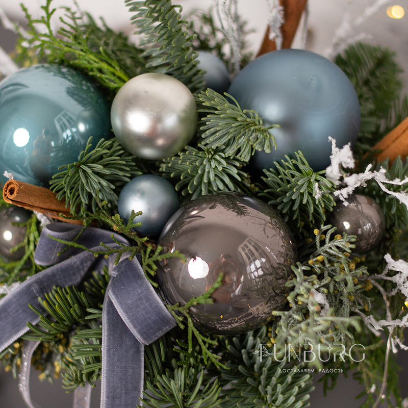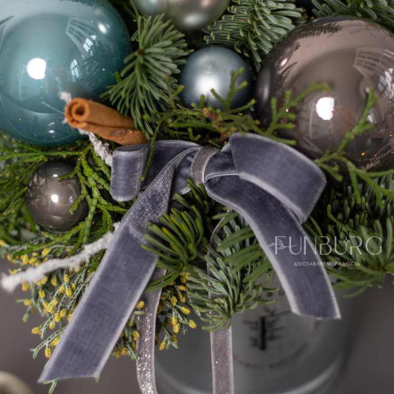 Миниатюрная композиция из нобилиса и пушистого кипариса с добавлением заснеженных веточек и сверкающих праздником туманно-голубых елочных шаров. Подарит новогоднее настроение, уют и аромат праздника.