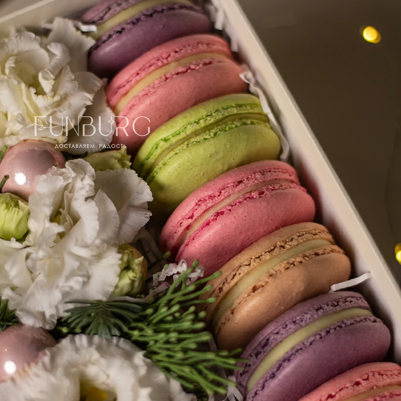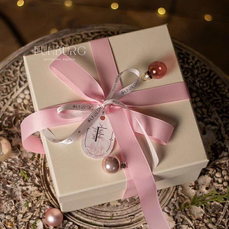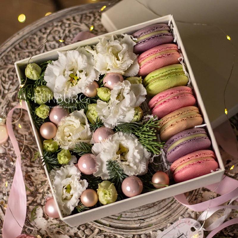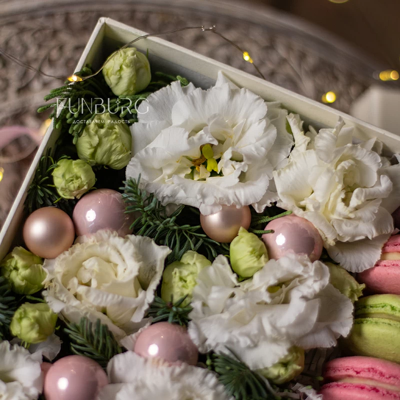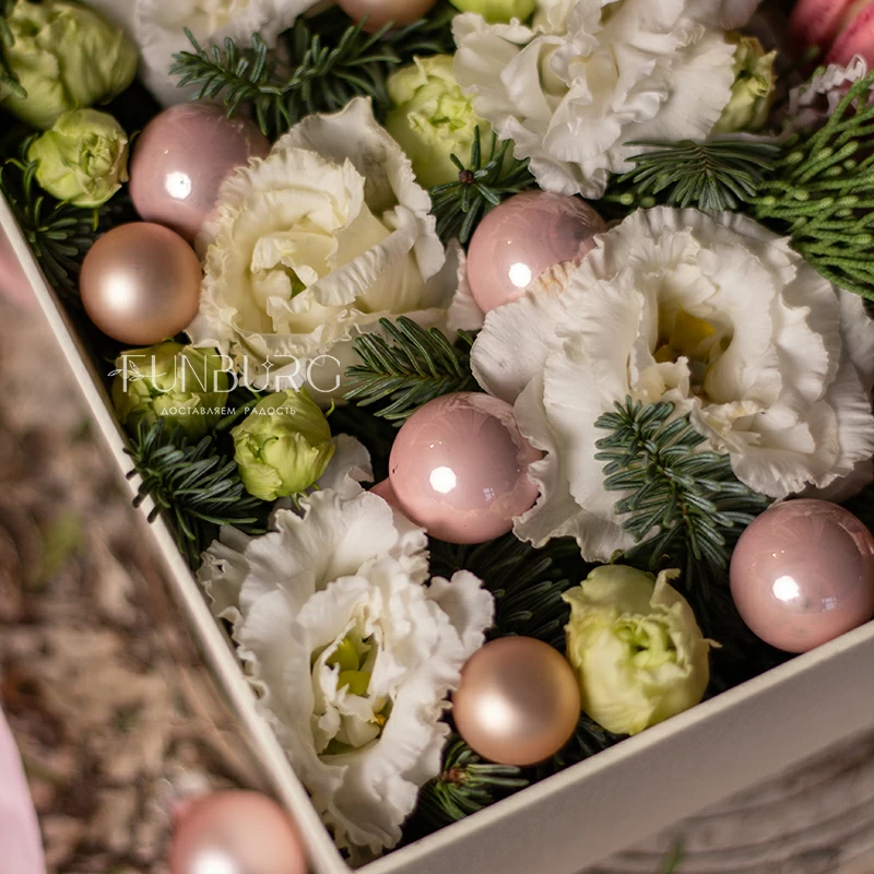 Зимняя коробочка с кружевной эустомой, ароматными еловыми веточками, нежно-розовыми стеклянными шариками и свежими миндальными пирожными превратит любой морозный день в праздник и станет отличным подарком на любое зимнее торжество.