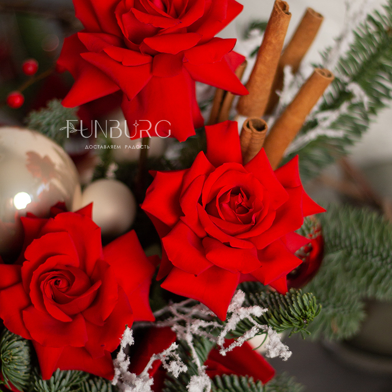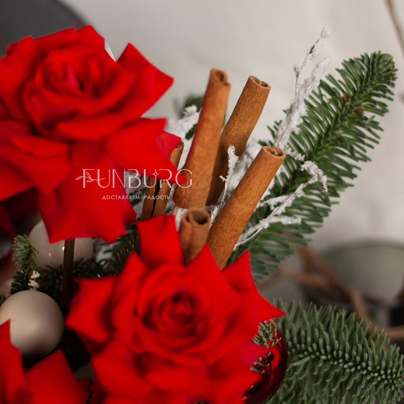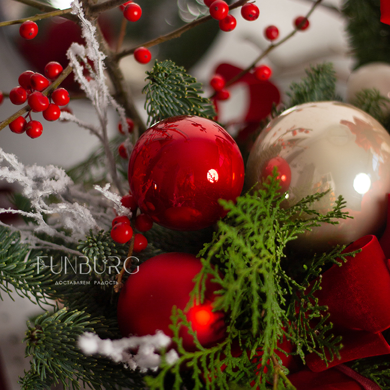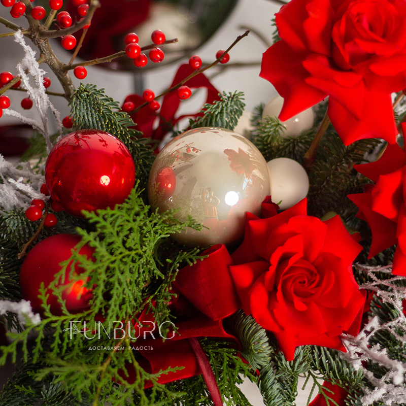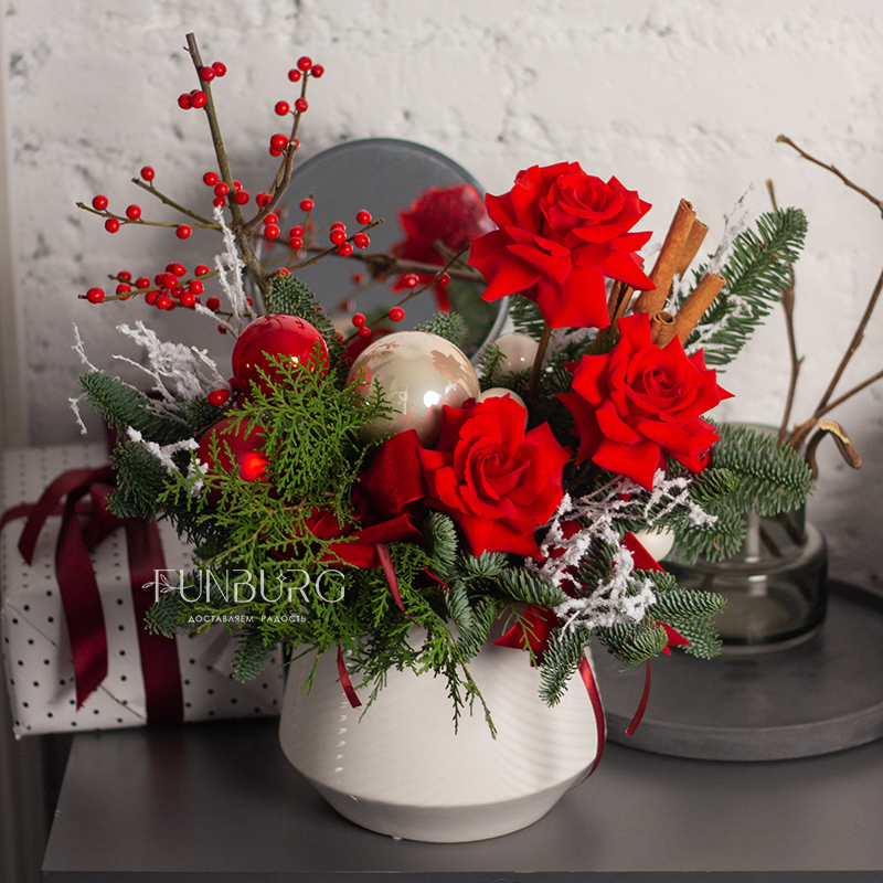 Яркая и сочная, праздничная композиция с алыми французскими розами Nina, яркими огоньками-ягодками илекса, ароматными еловыми веточками, пушистой туей, сверкающими елочными шариками, заснеженными веточками черничника и бантиками в контрастном белоснежном кашпо идеально подойдет для эффектного зимнего подарка, украшения праздничного стола и создания настроения дома!