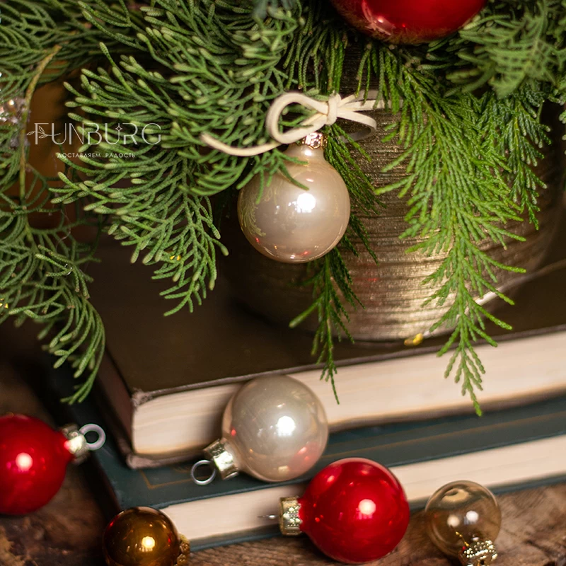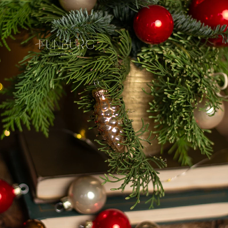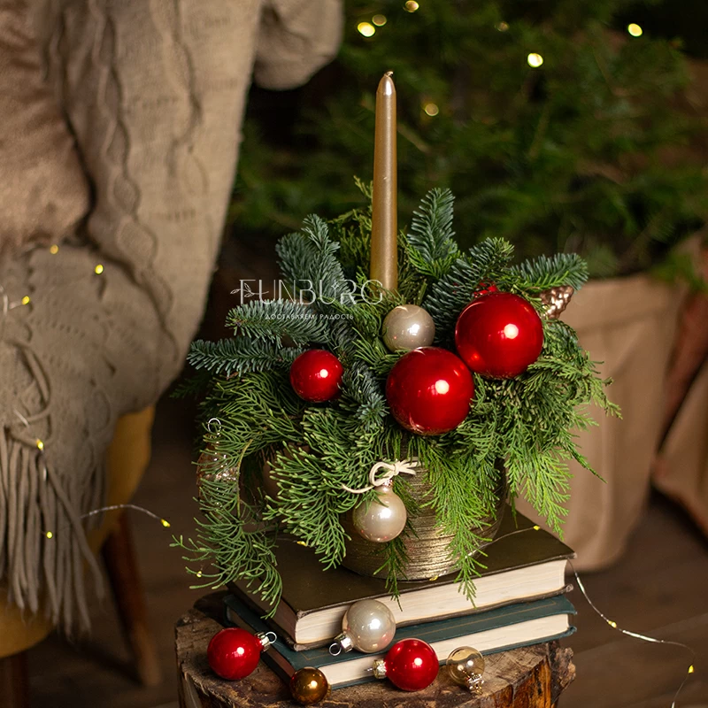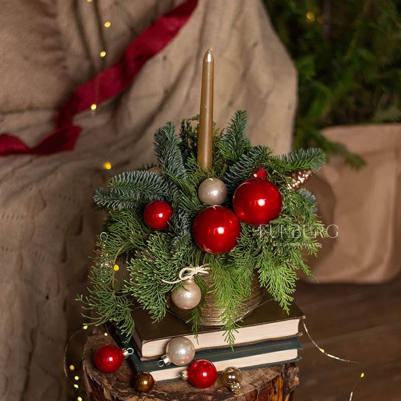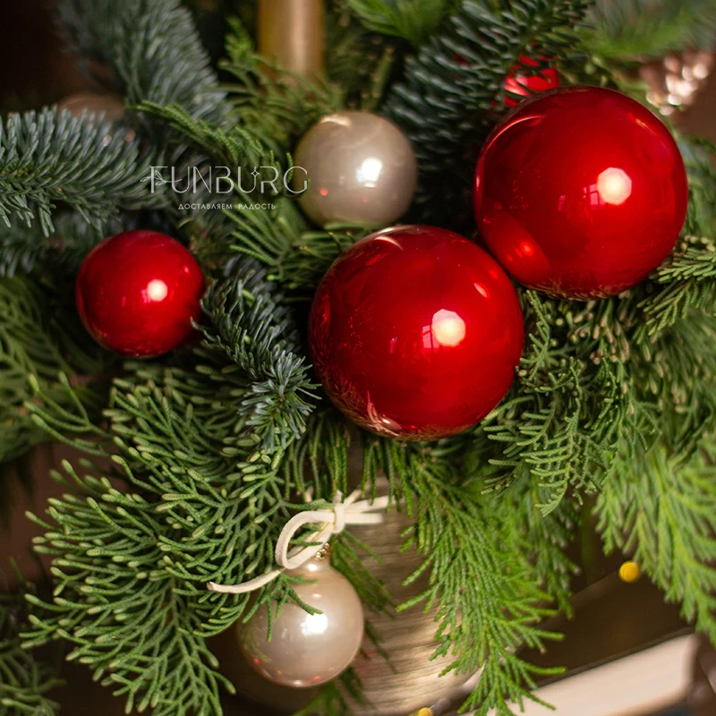 Композиция со свечой из ароматных еловых веточек, пушистого кипариса, с празднично-глянцевыми насыщенно-красными ёлочными шариками, напоминающими яблоки в карамели, сливочными шариками и стеклянными шишками в праздничном позолоченном керамическом кашпо мгновенно создаст настроение и станет прекрасным украшением дома и новогоднего стола!