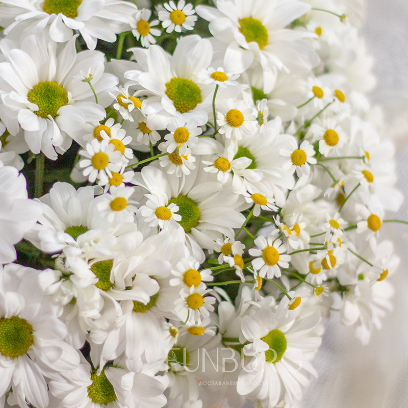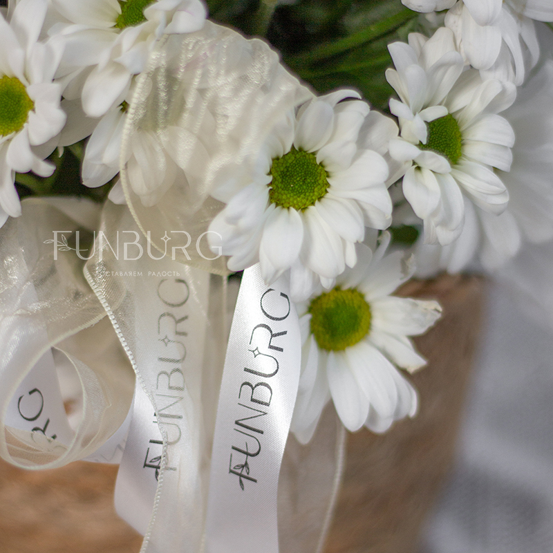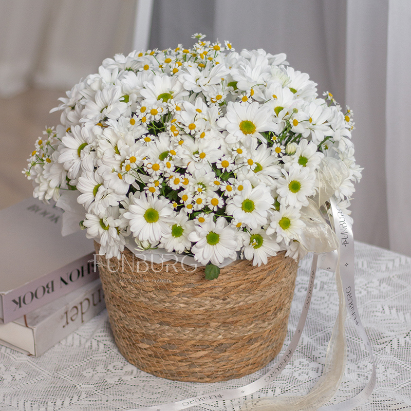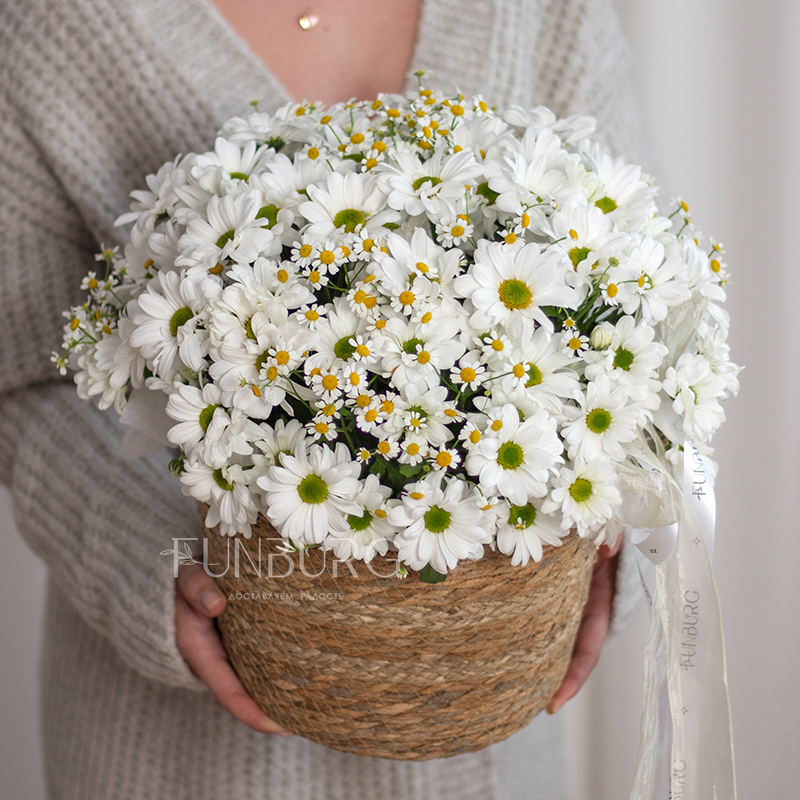 Легкая композиция из пышных кустовых хризантем, так похожих на ромашки, в красивой плетеной корзине создана дарить самое летнее и хорошее настроение!